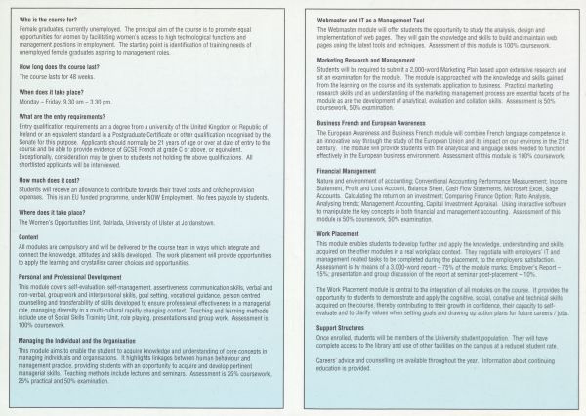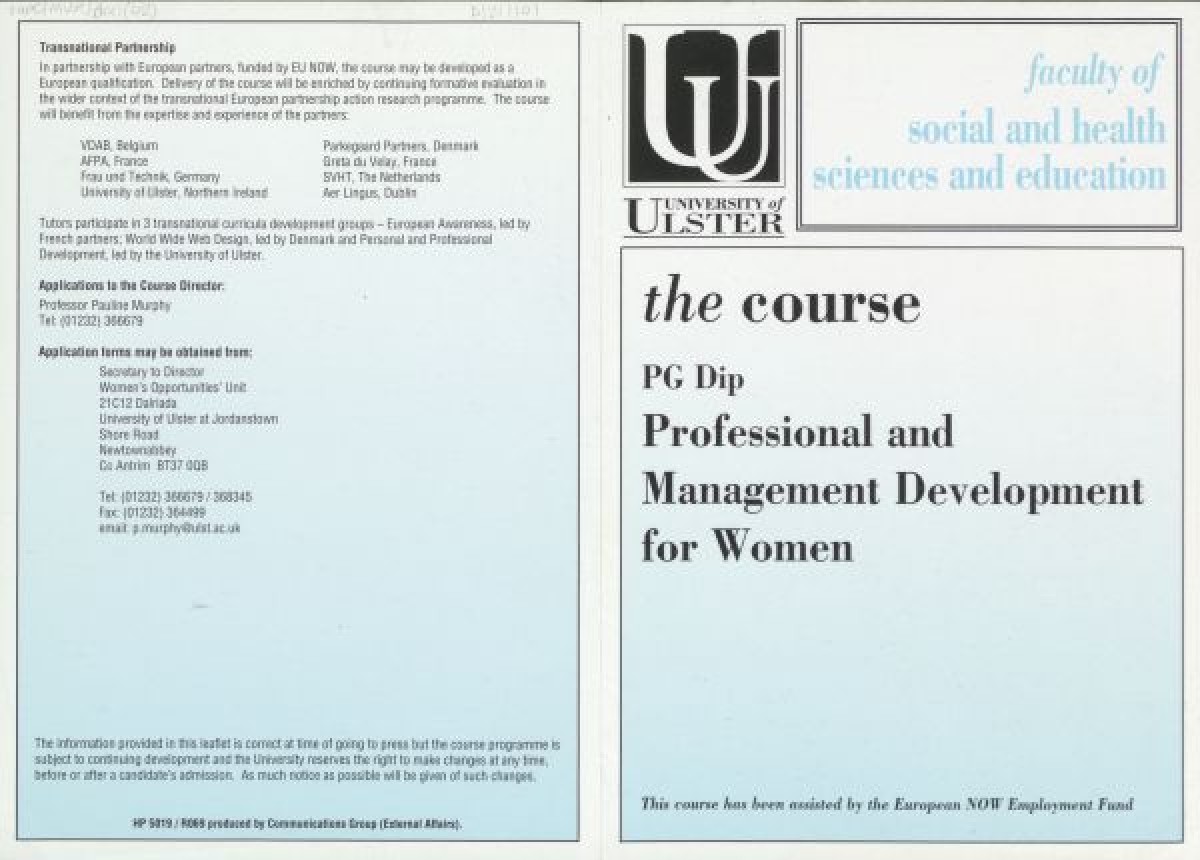 Information leaflet for a women's education course, titled "Professional and Management Development for Women ," directed by Professor Pauline Murphy at the University of Ulster, Jordanstown. Contains details of dates and fees, and a list of course modules, including Personal and Professional Development, Managing the Individual and the Organisation, Webmaster and IT as a Management Tool, Marketing Research and Management, Business French and European Awareness, and Financial Management.