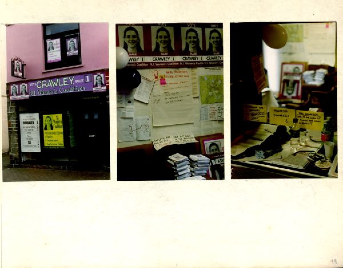 Women's Coalition election posters. Items attached to a scrapbook created by Crawley featuring newspaper clippings, letters, cards and leaflets for Marie Crawley in the 1998 election, featuring photographs on cover.