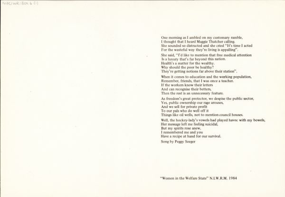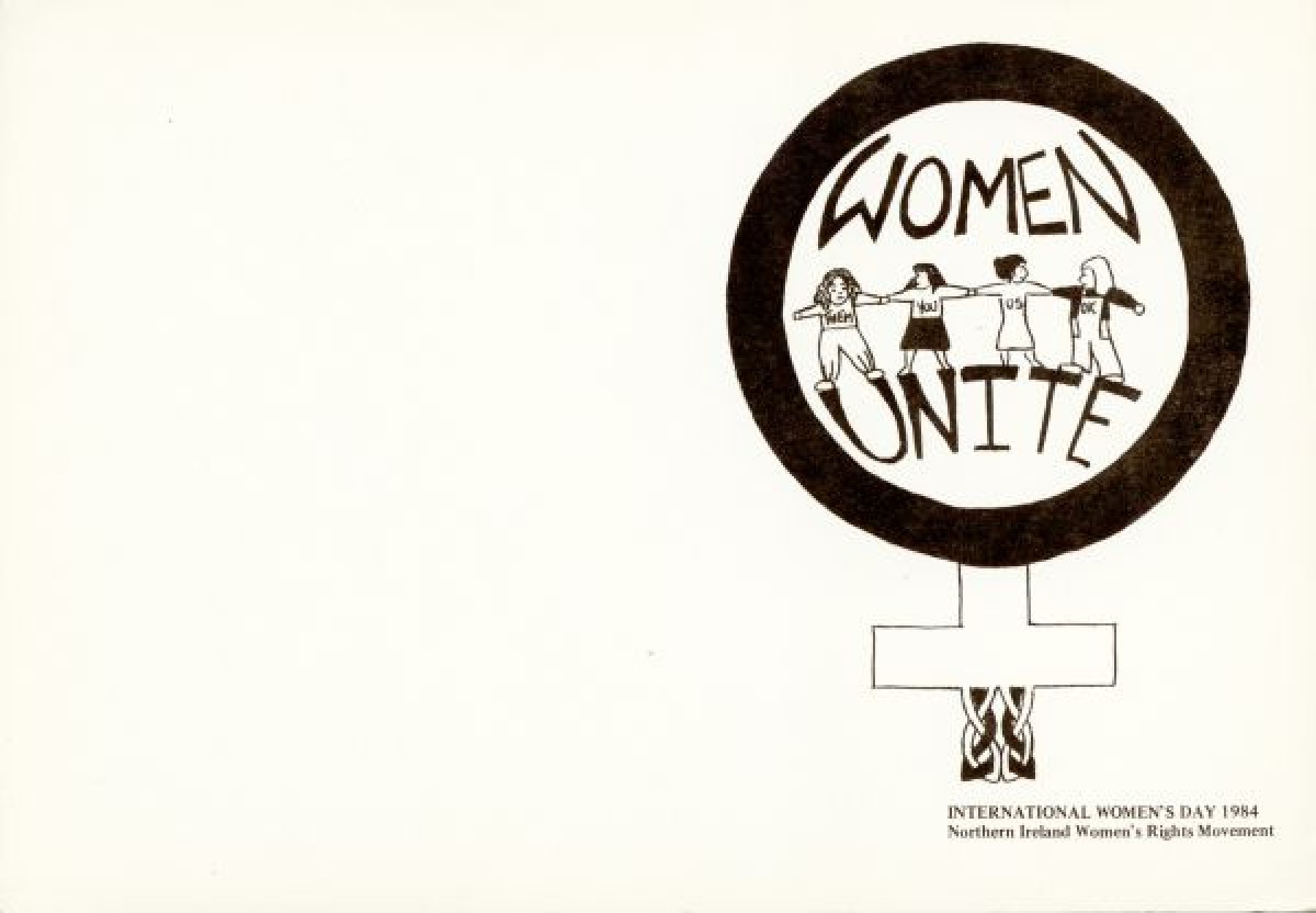 Northern Ireland Women's Rights Movement, with lyrics to the Peggy Seegar song 'Women in the Welfare State' on the inside. The cover shows an illustration of four women with the statement 'Women Unite', they are holding hands and their clothing reads 'Them', 'You', 'Us', 'OK'.