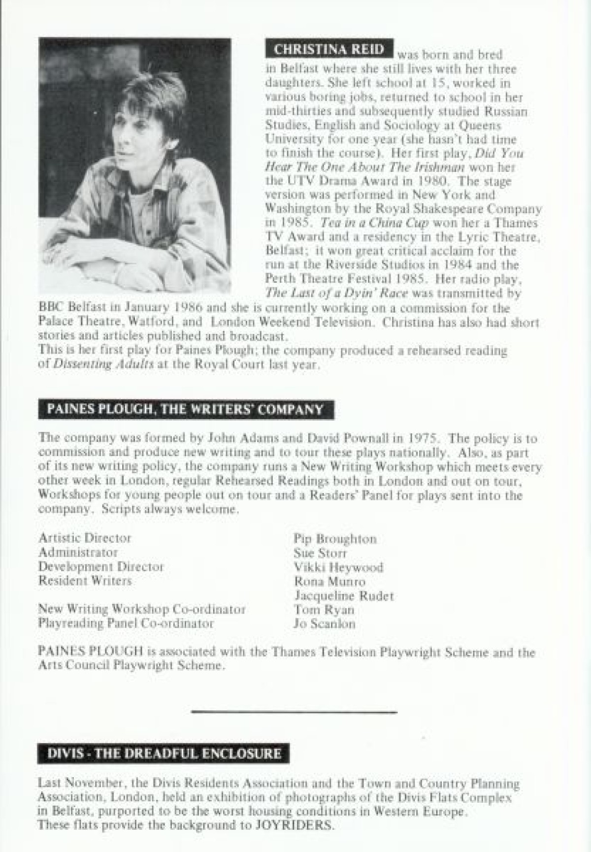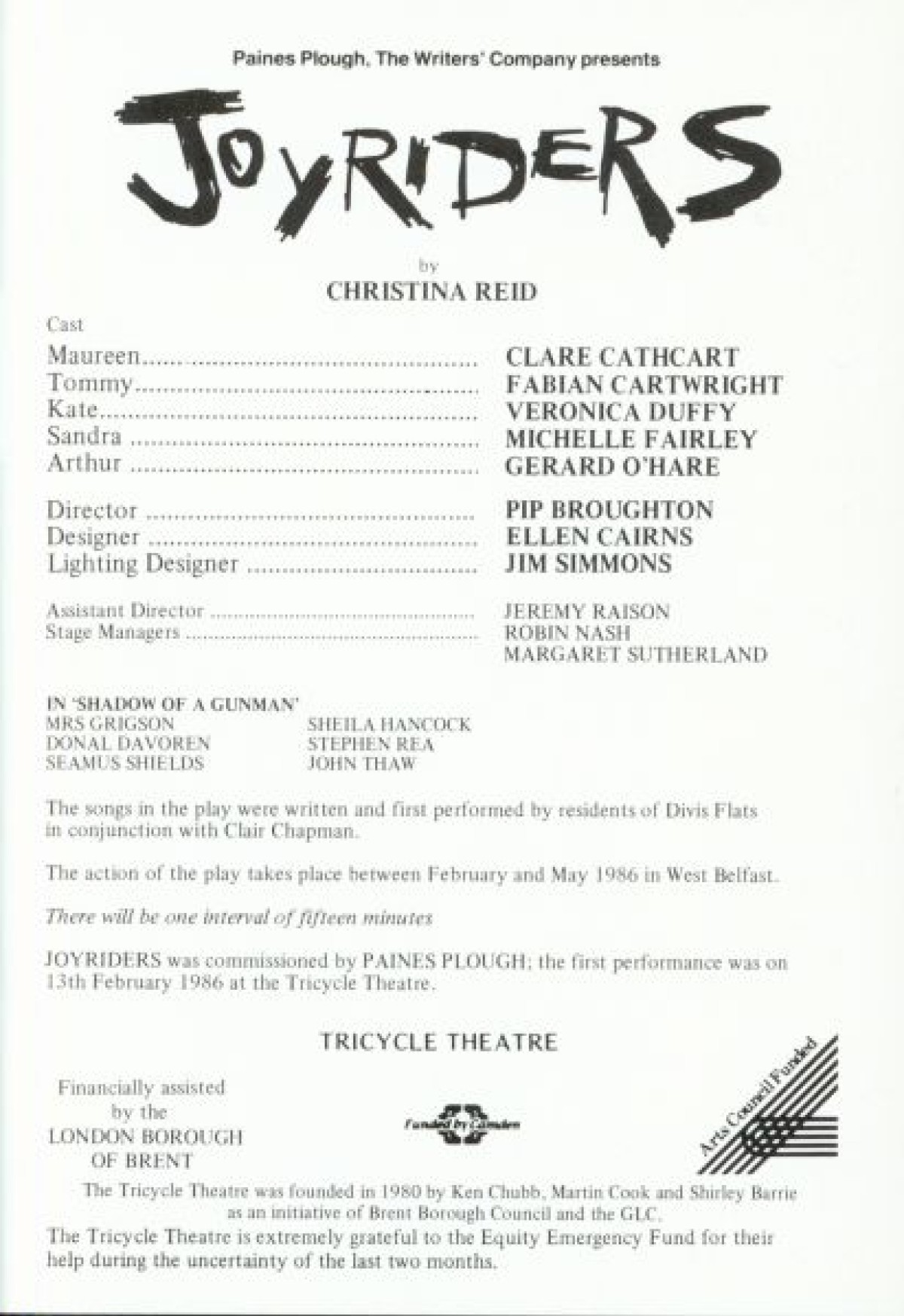 Programme for 'Joyriders' at Paines Plough's Tricycle Theatre