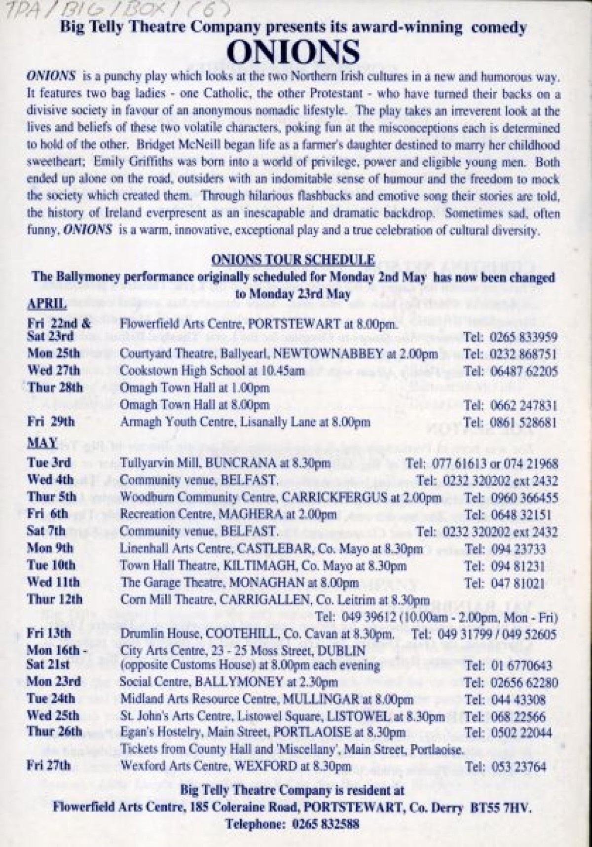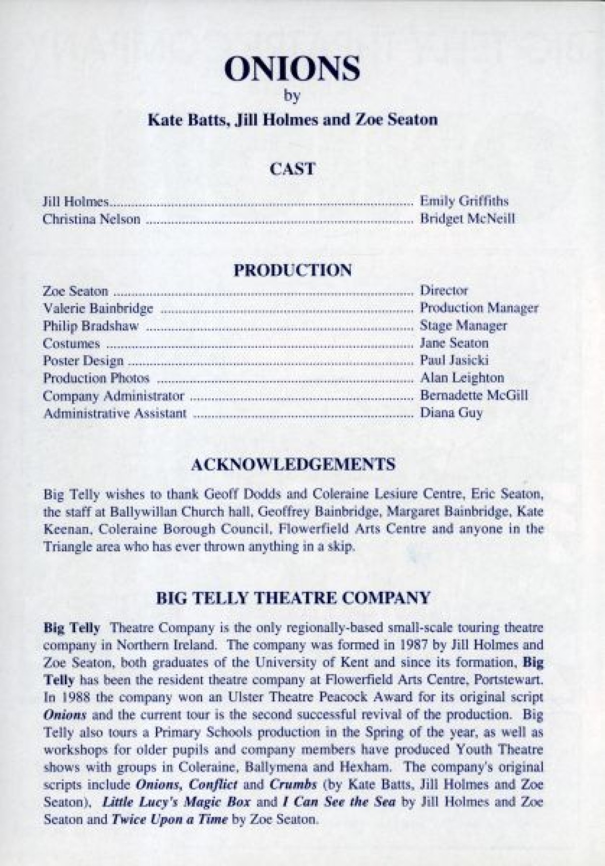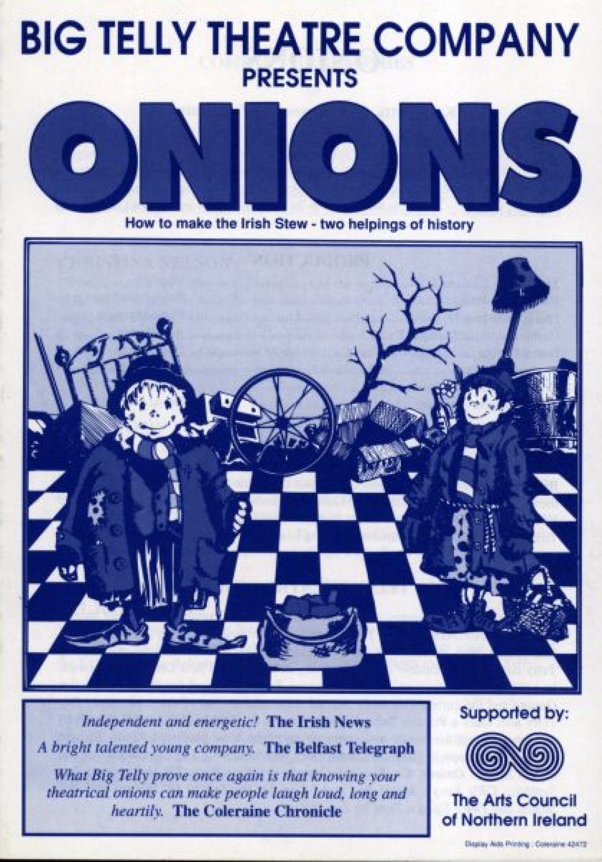 Big Telly Theatre Company's 1994 production of "Onions" by Kate Batts, Jill Holmes and Zoe Seaton. The play explored themes of cultural diversity through the leading characters; two 'bag ladies' - one Catholic and one Protestant - who embarked upon a nomadic lifestyle. The original 1988 script won an Ulster Theatre Peacock Award.