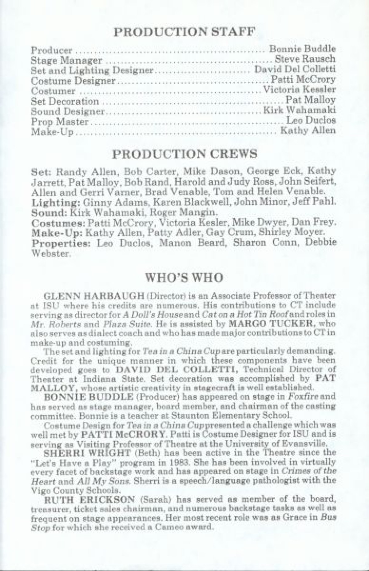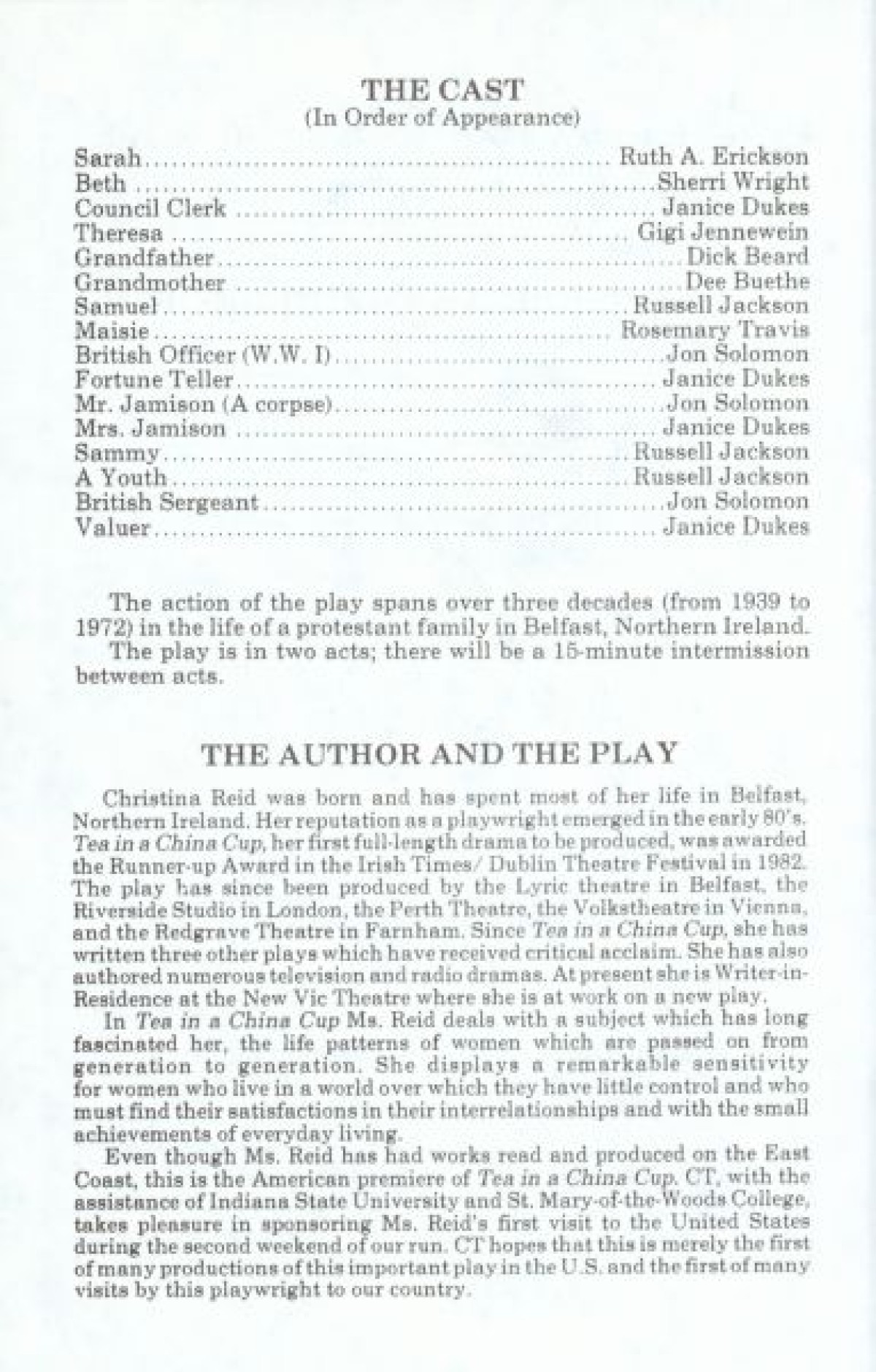 Programme for the American premier of 'Tea in a China Cup' at Community Theatre, Inc.
