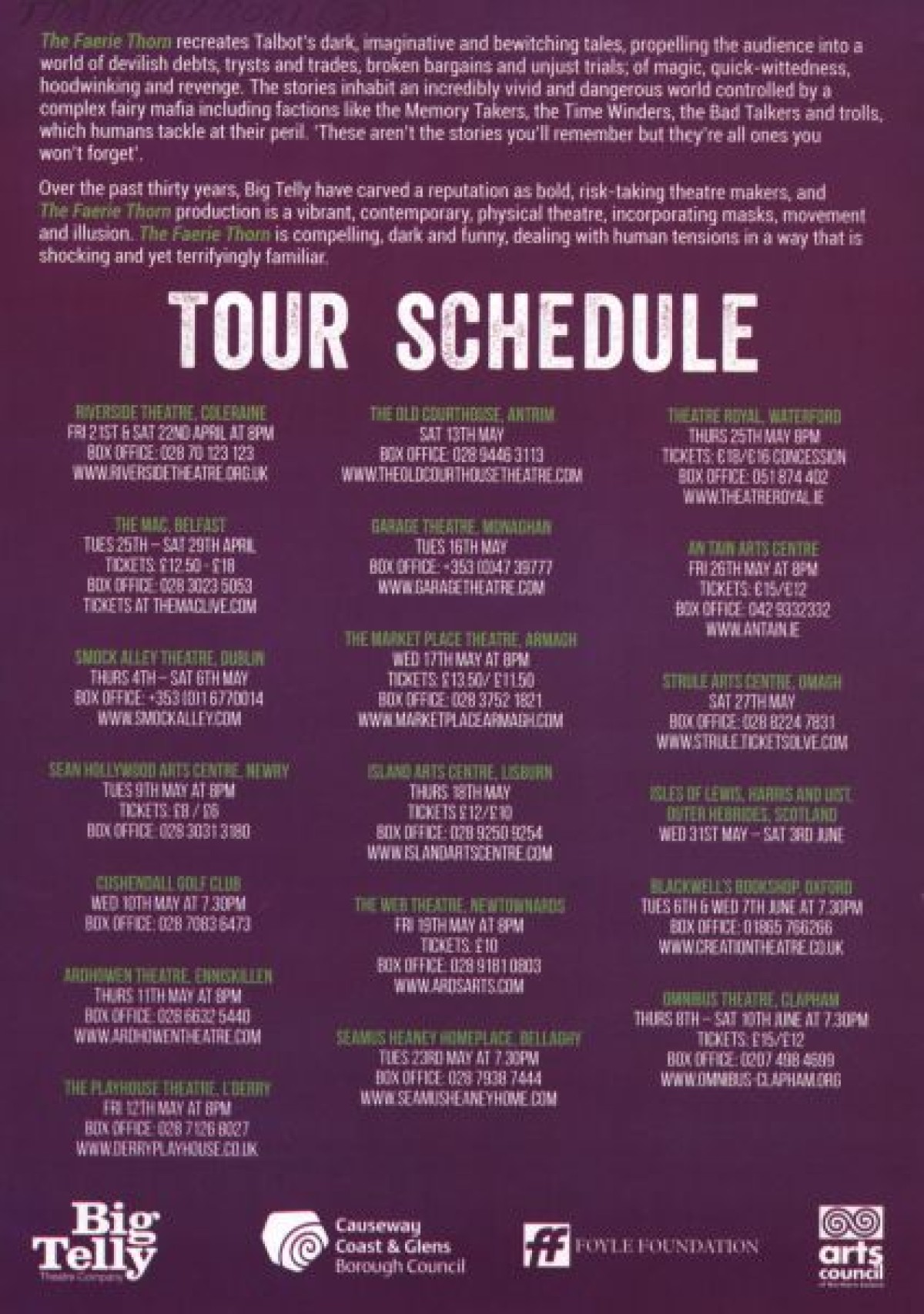 Big Telly's Theatre Company's production of "The Faerie Thorn". Originally a book by Jane Talbot, Shelley Atkinson and Zoe Seaton adapted it for the stage. The leaflet includes a touring schedule with date and venue listings.