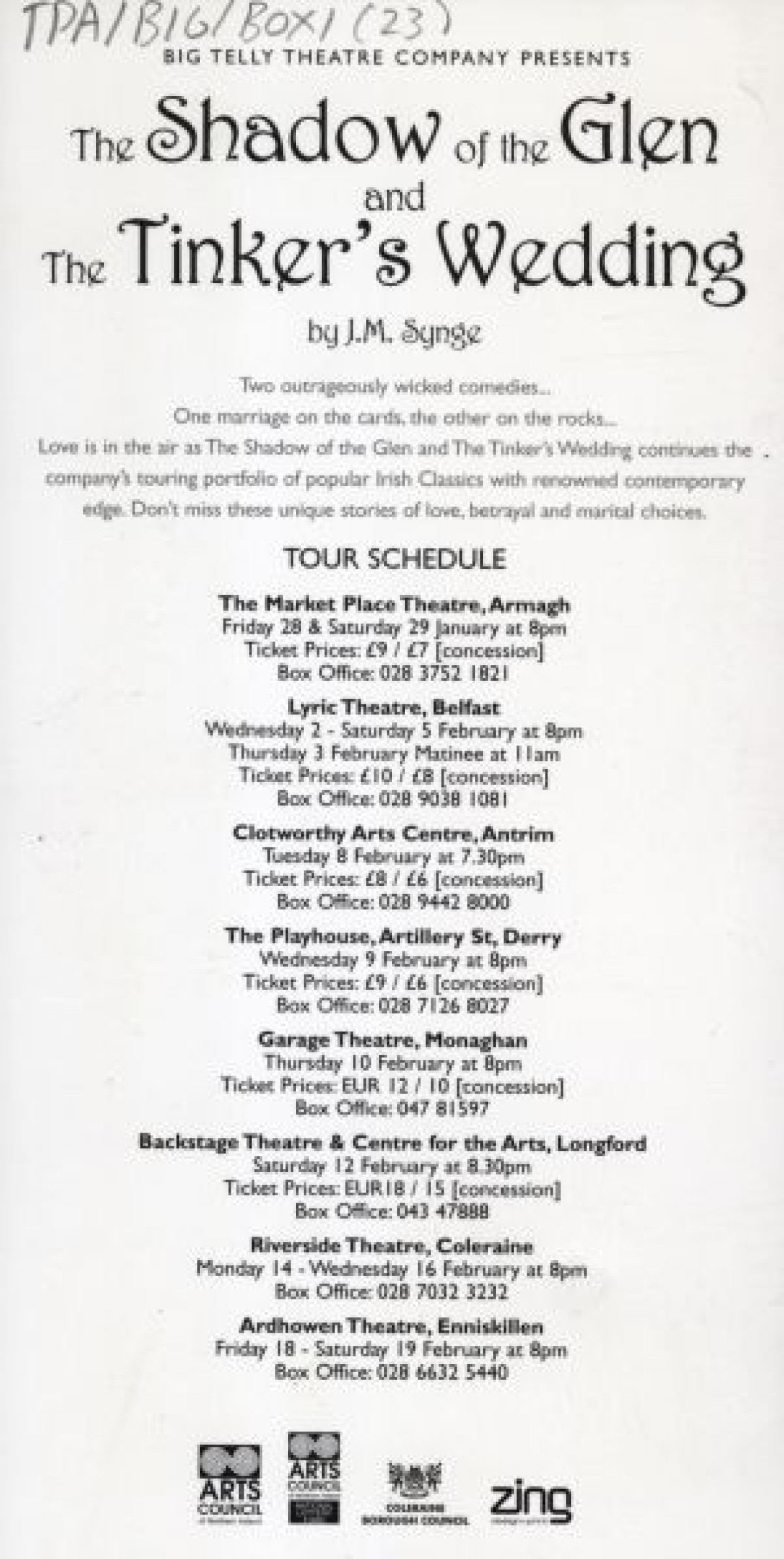 A publicity leaflet advertising the tour schedule for Big Telly Theatre Company's plays: "The Shadow of the Glen" and "The Tinker's Wedding" by J.M. Synge.