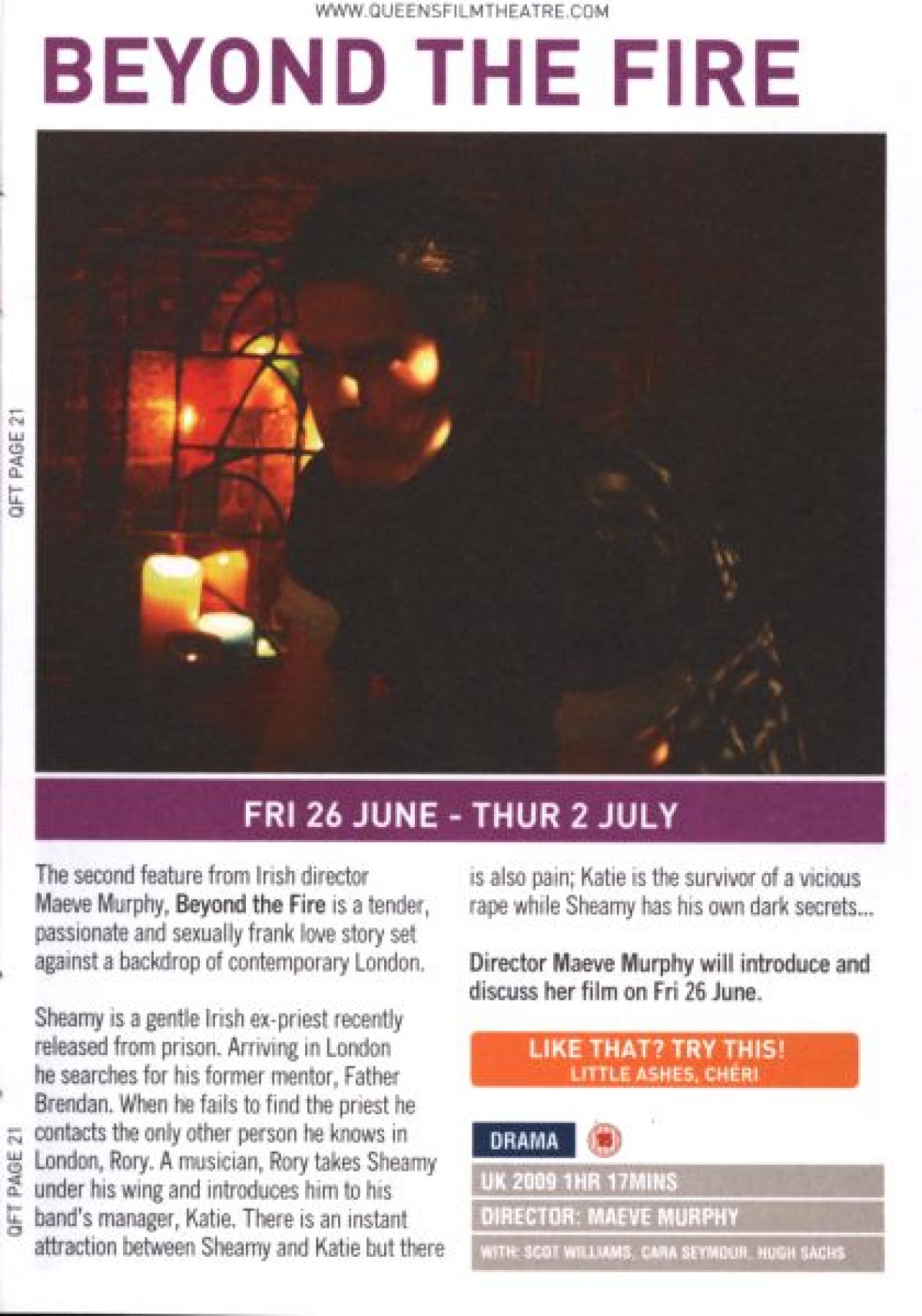 Film guide for the Queen’s Film Theatre, Belfast June-July, 2009. Includes a listing for “Beyond the Fire,” a film directed by Maeve Murphy dealing with the topic of sexual assault.