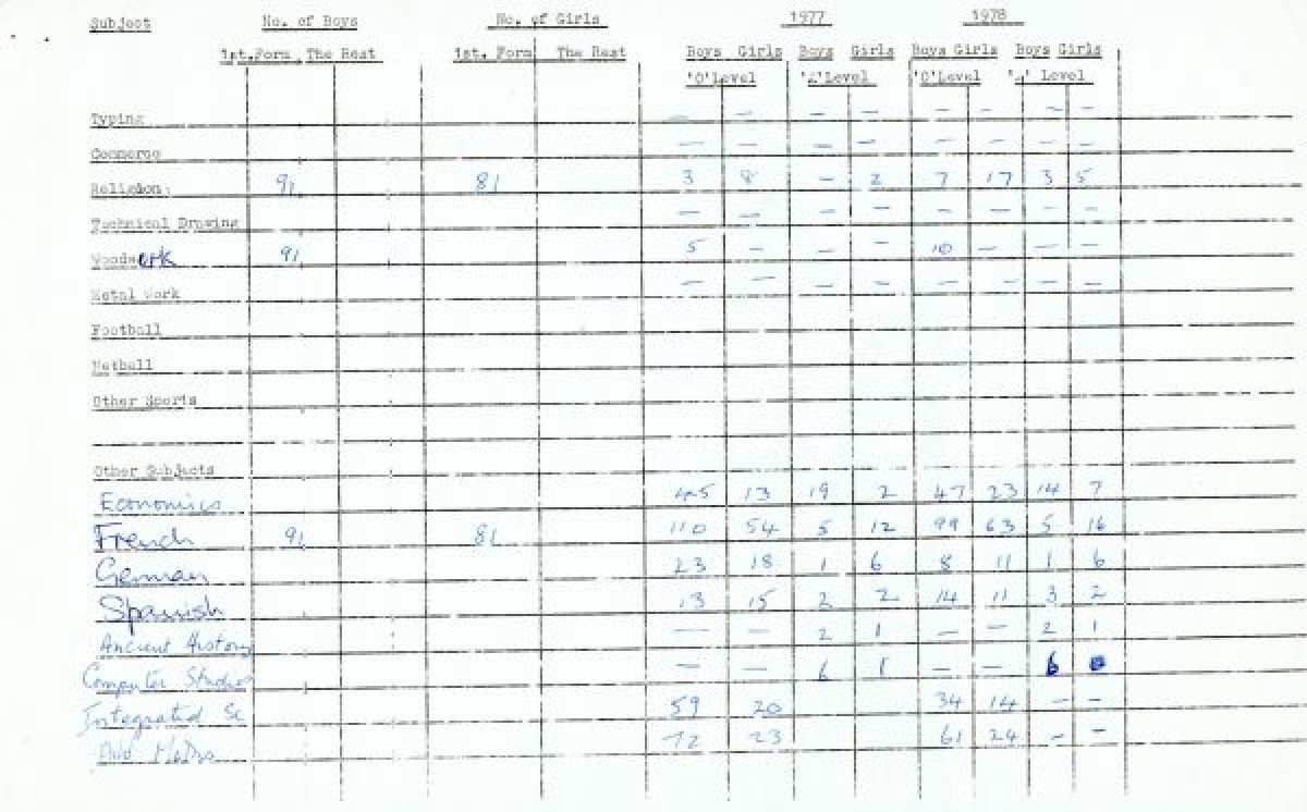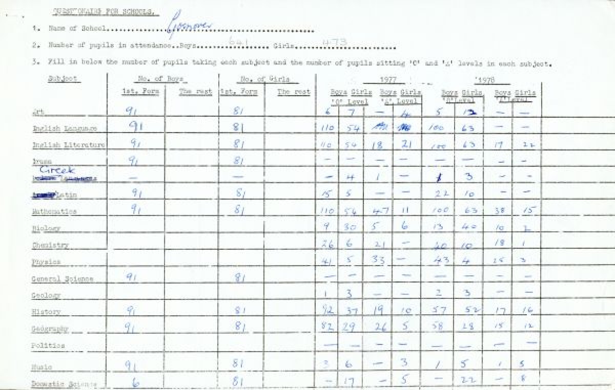 A 1978 questionnaire report conducted on Grosvenor Grammar School to record the difference in the number of boys and girls taking 'O' and 'A' Level subjects. Material collected by Lynda Walker of the