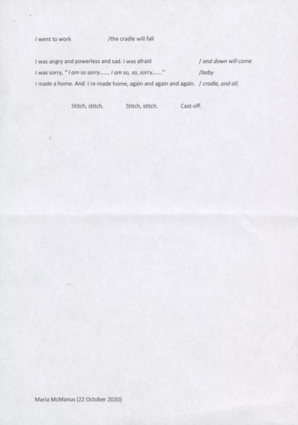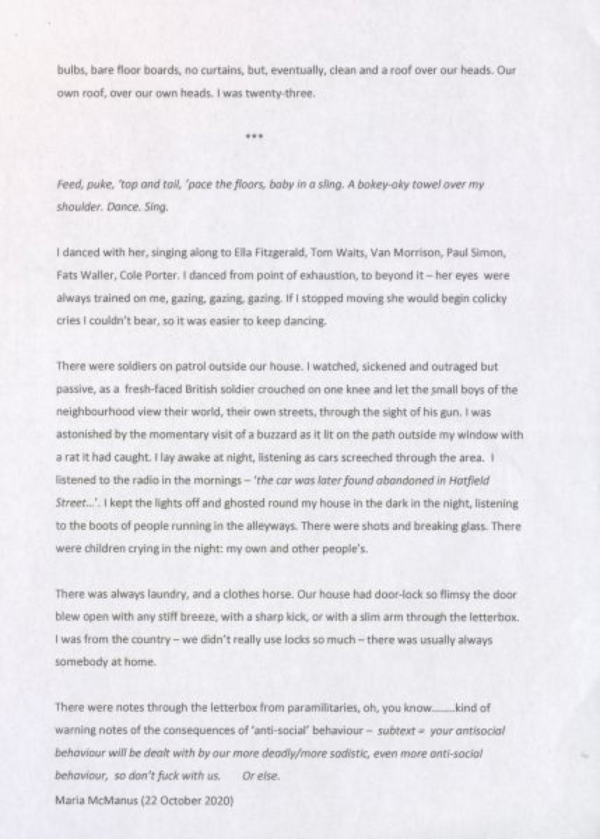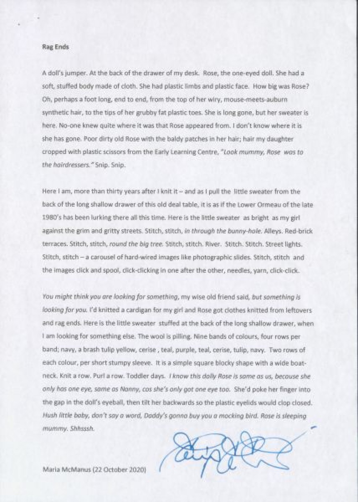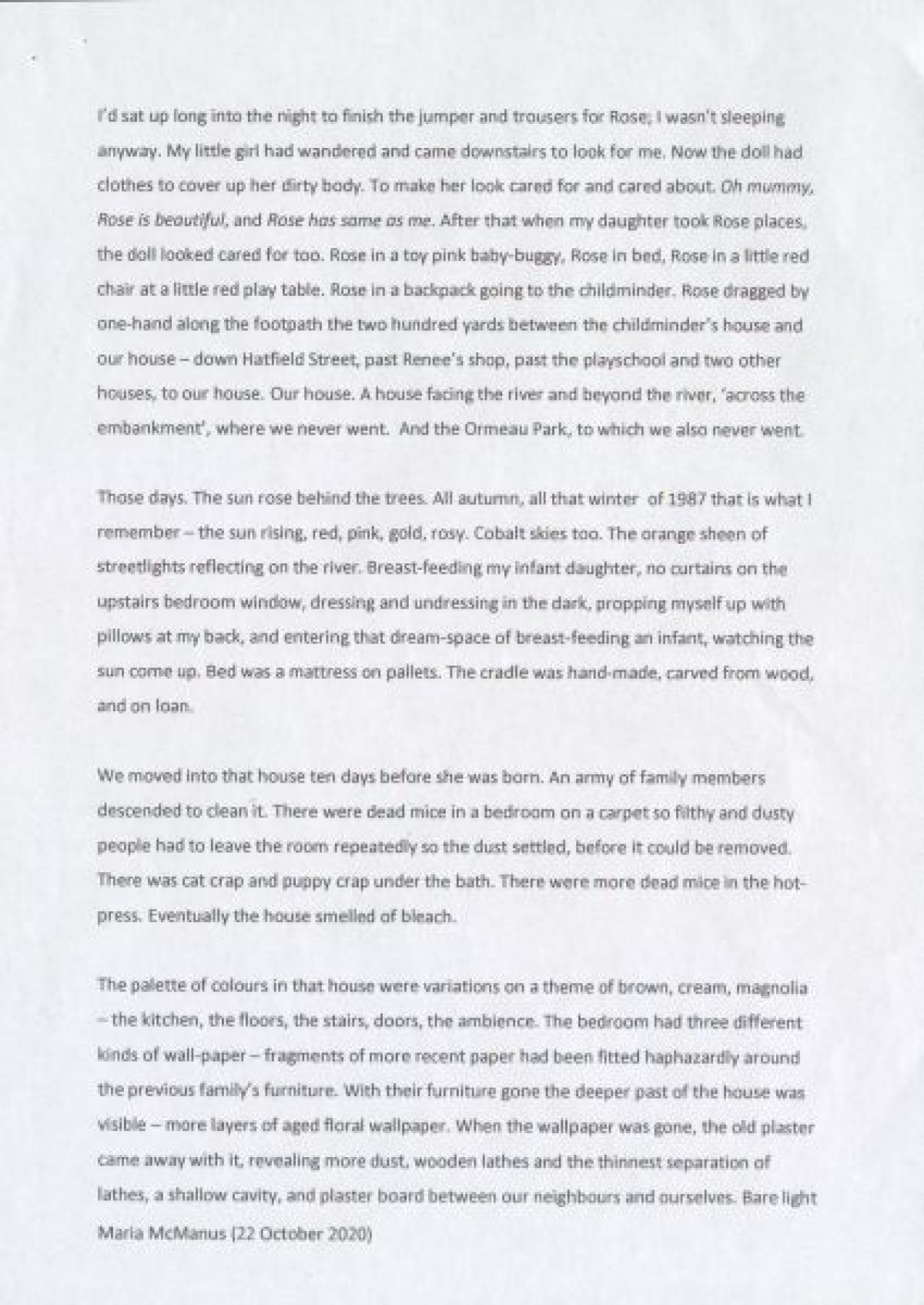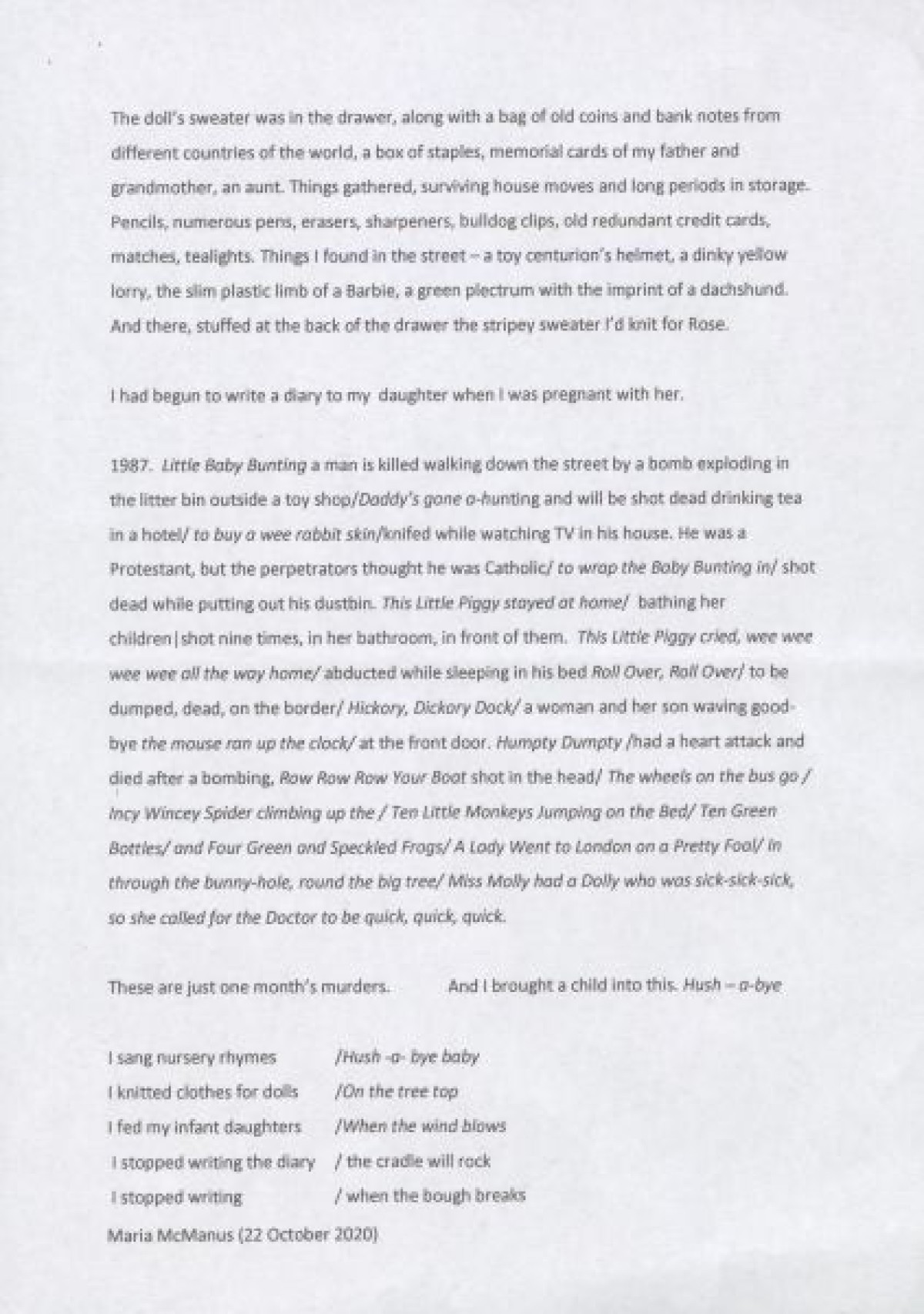 Essay written by Maria McManus in response to finding a jumper she had knitted for her daughter's doll in 1988/89. The essay tells the story of the jumper, within the context of Maria McManus' lived experience of becoming a parent during the Troubles.