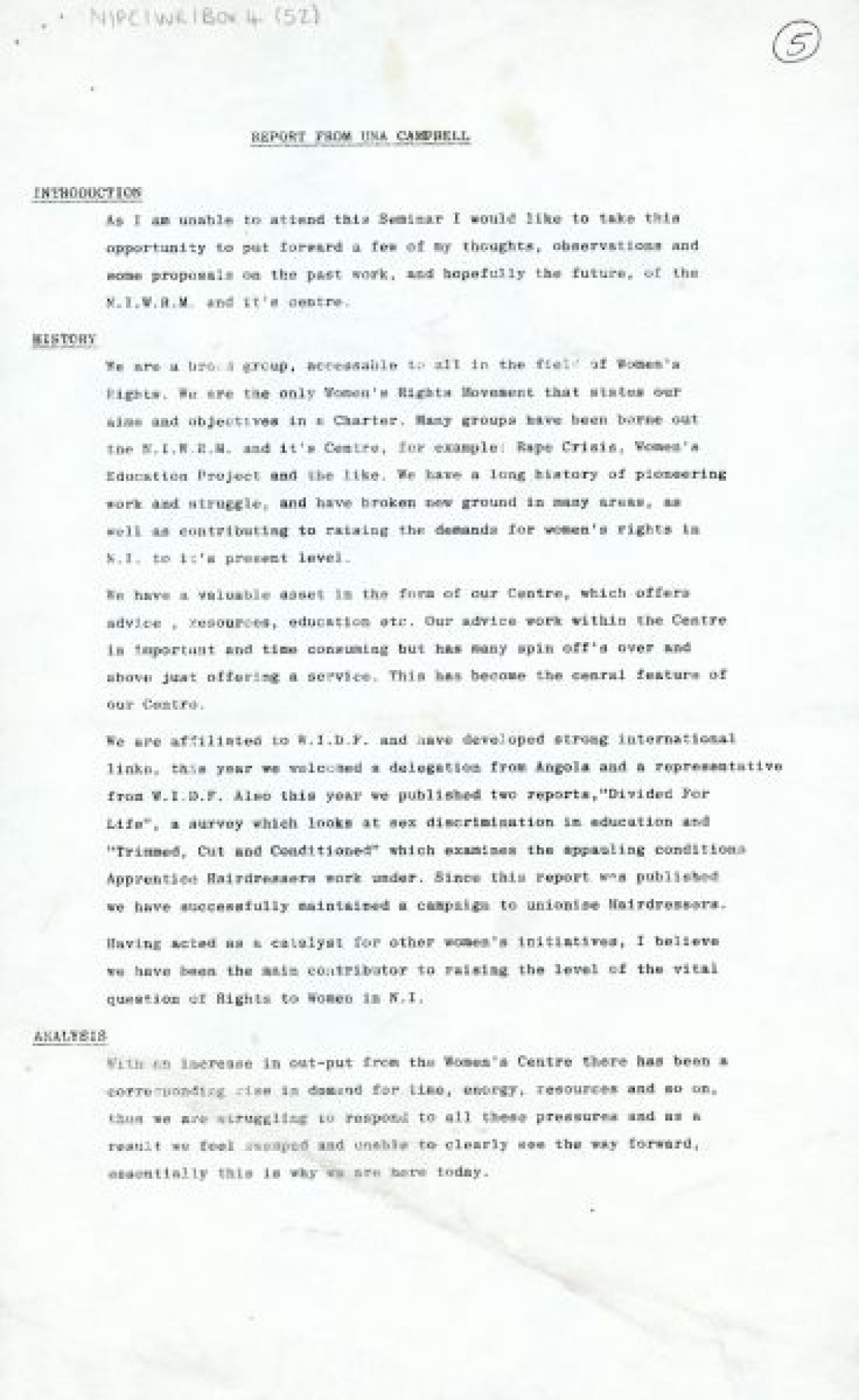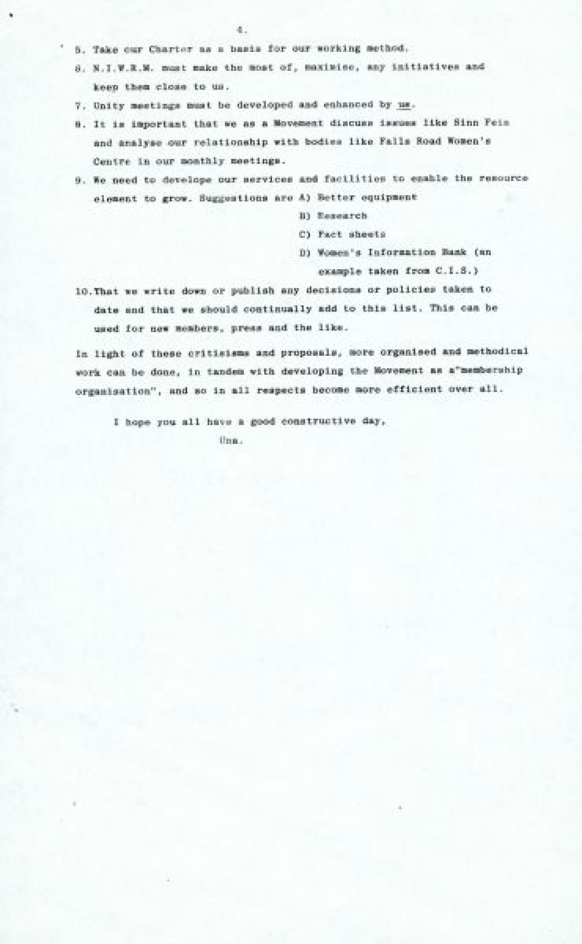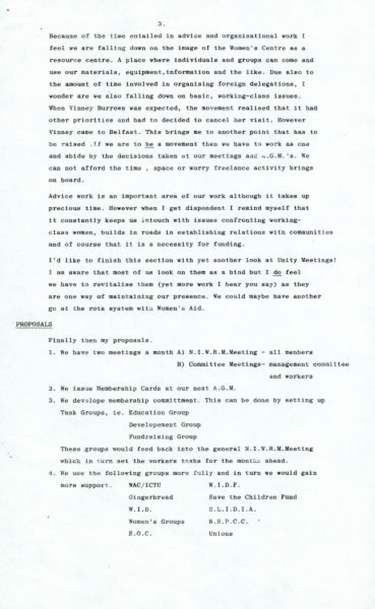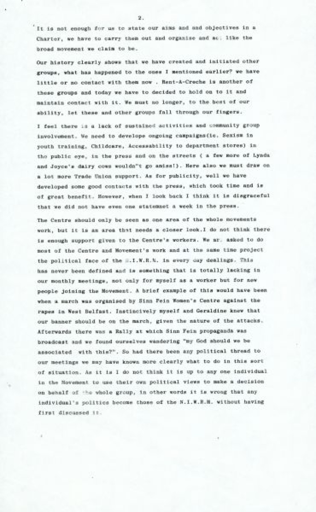 Northern Ireland Women's Rights Movement and Women's Centre, concerning unity of organisation, having greater political awareness and looking after working class initiatives better.