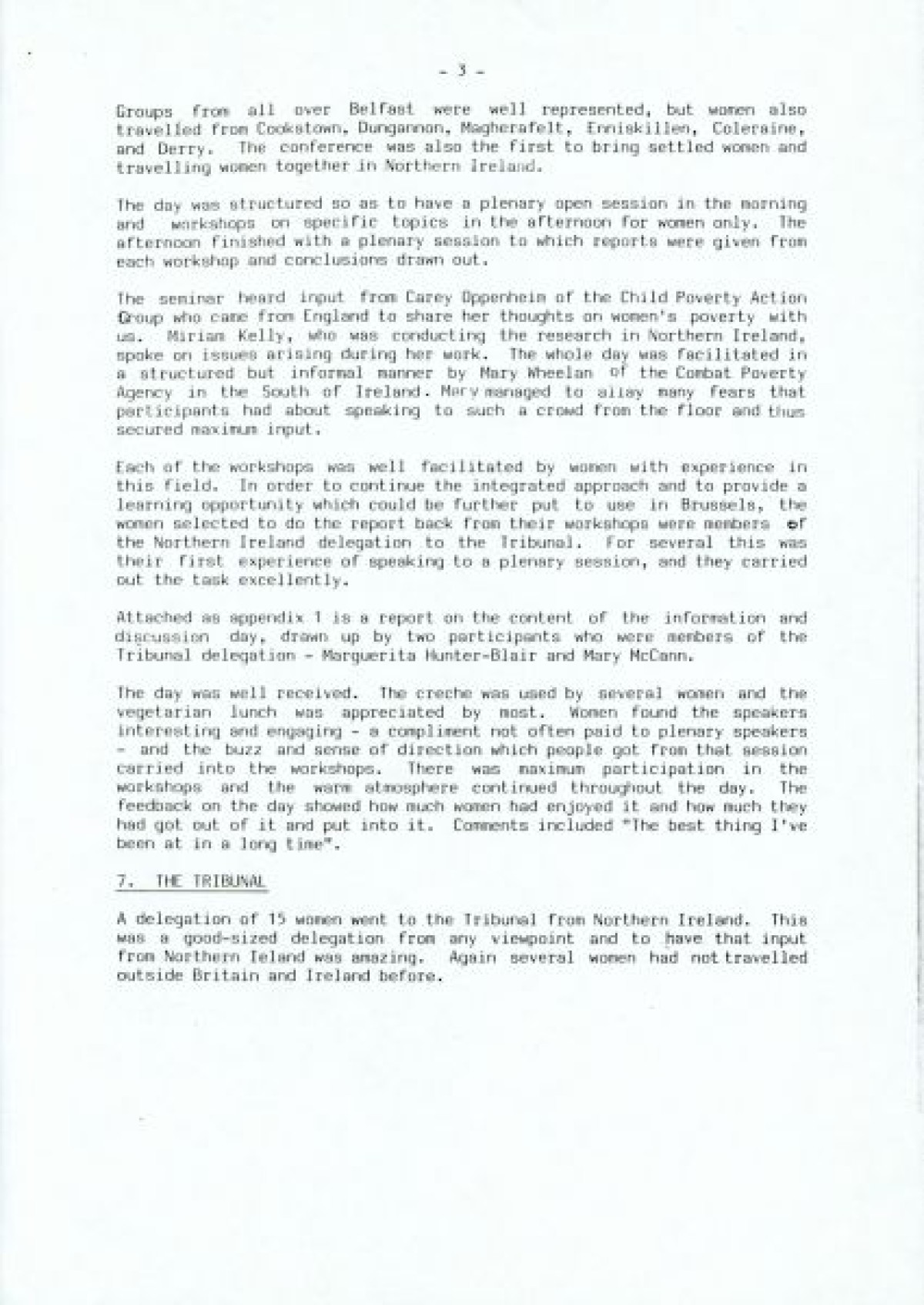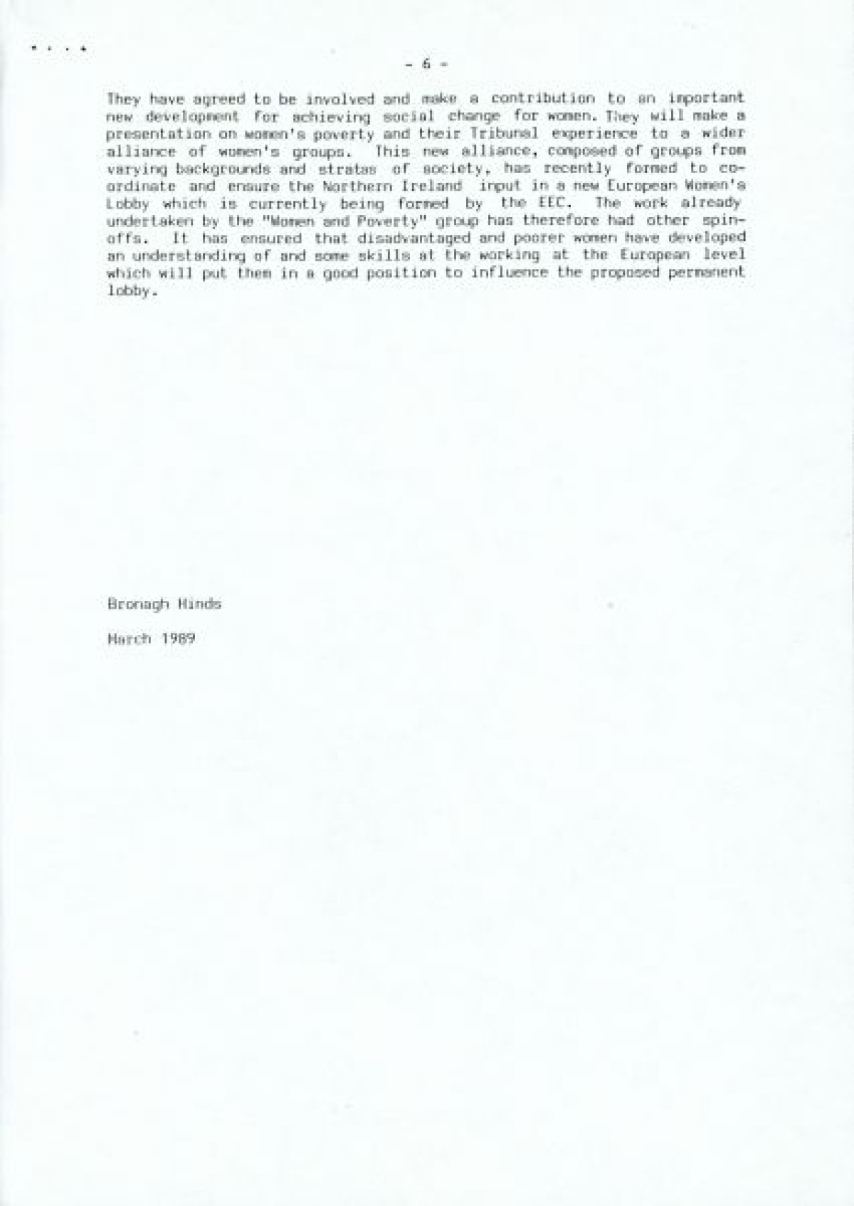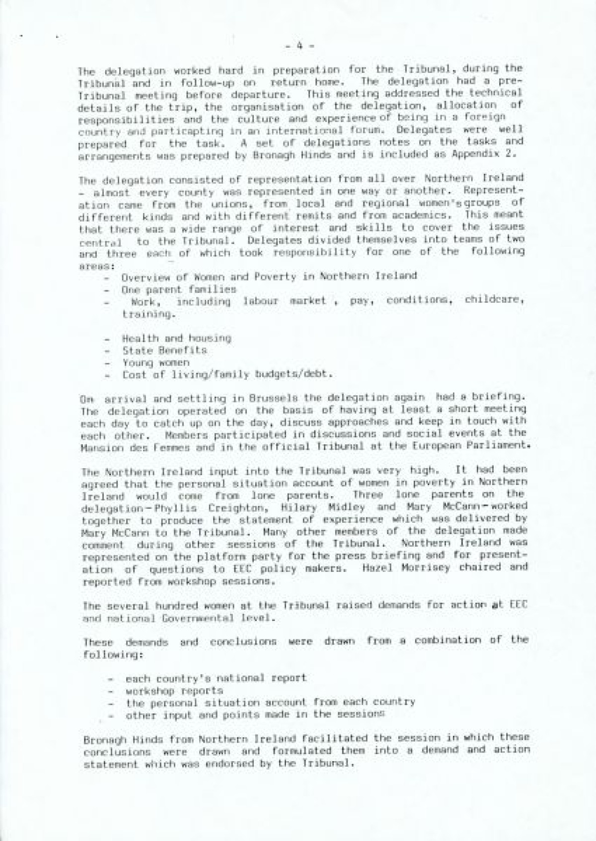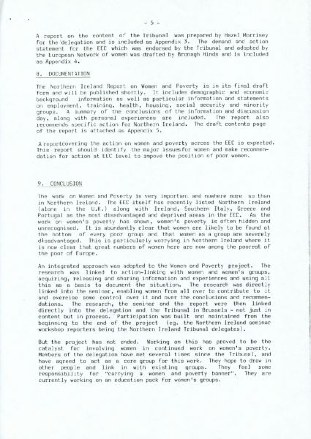 Women and Poverty Group, an organisation founded in 1987/1988 to conduct research into women and poverty in Northern Ireland, and to contribute to policy development in N.I., the UK and Europe in advance of the poverty tribunal in Brussels.