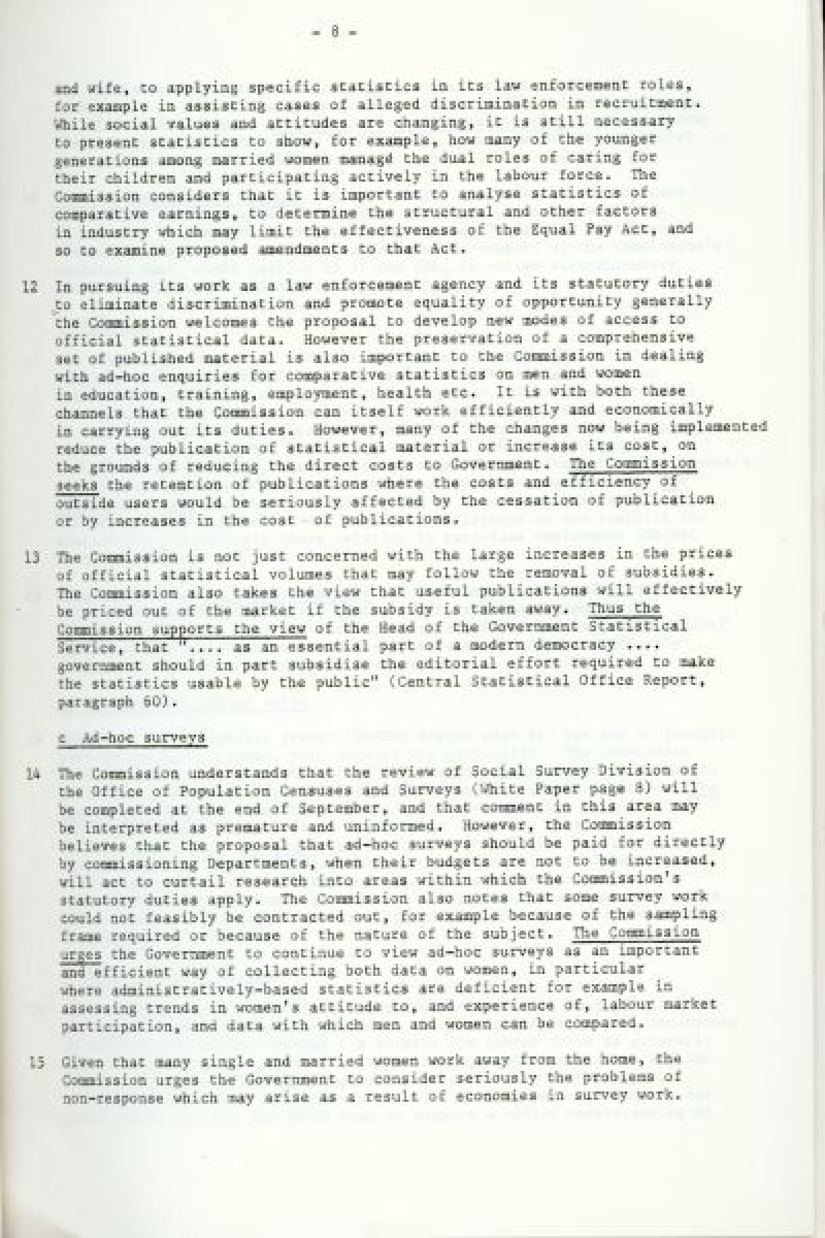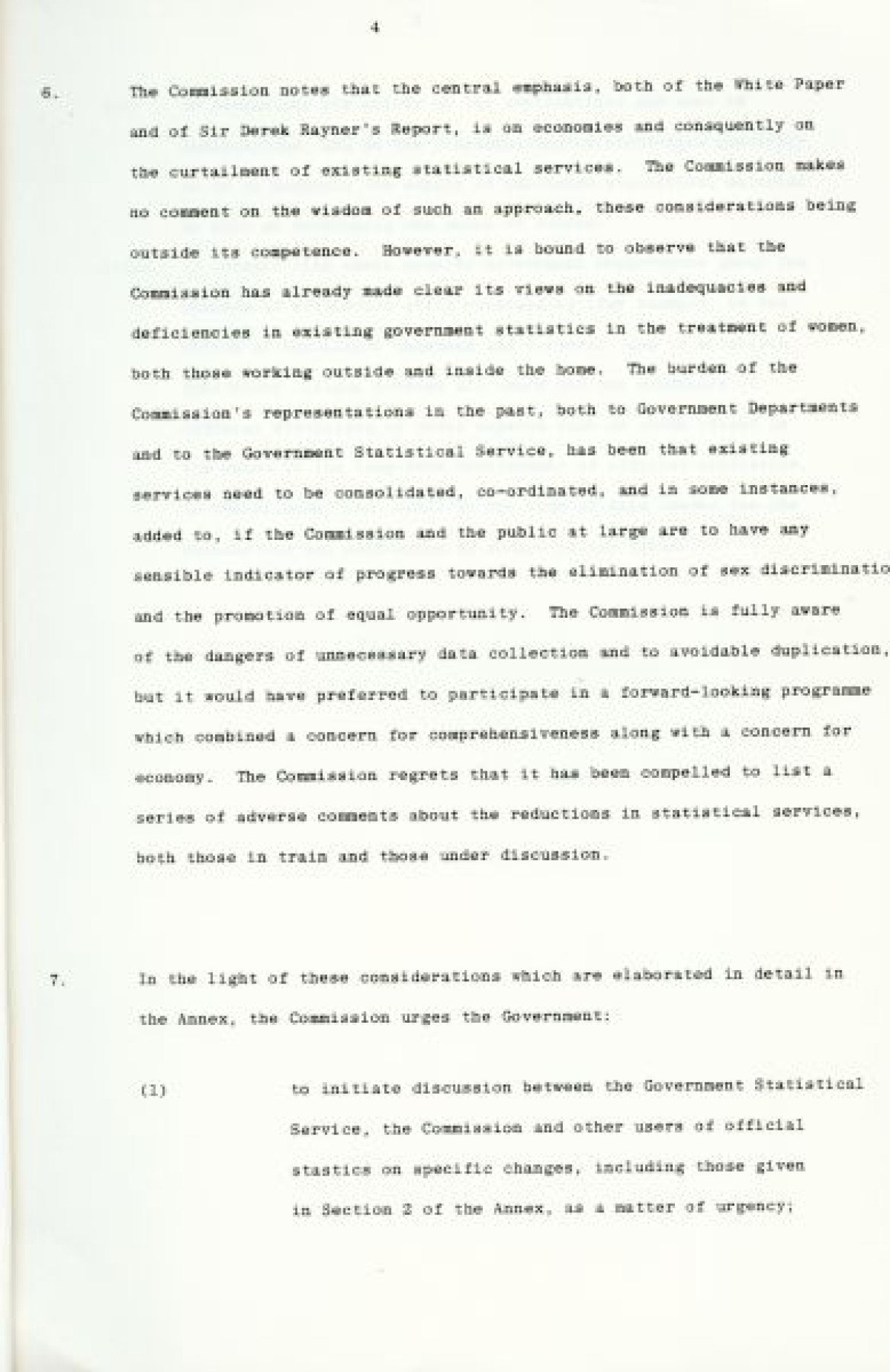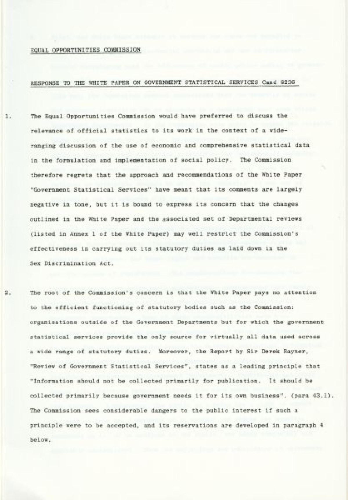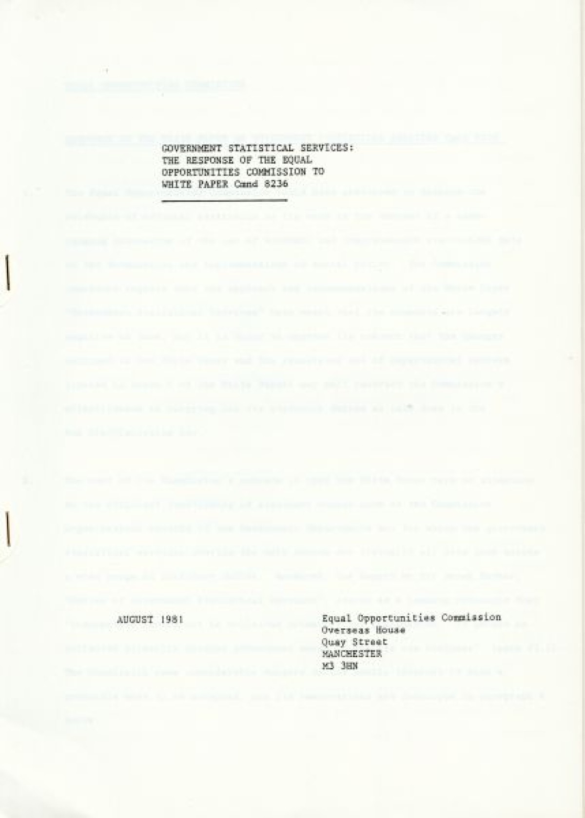 A 1981 report produced by the Equal Opportunities Commission titled 'Government Statistical Services: The response of the Equal Opportunities Commission to White Paper' - with a further report on the general conditions of women and sex discrimination.