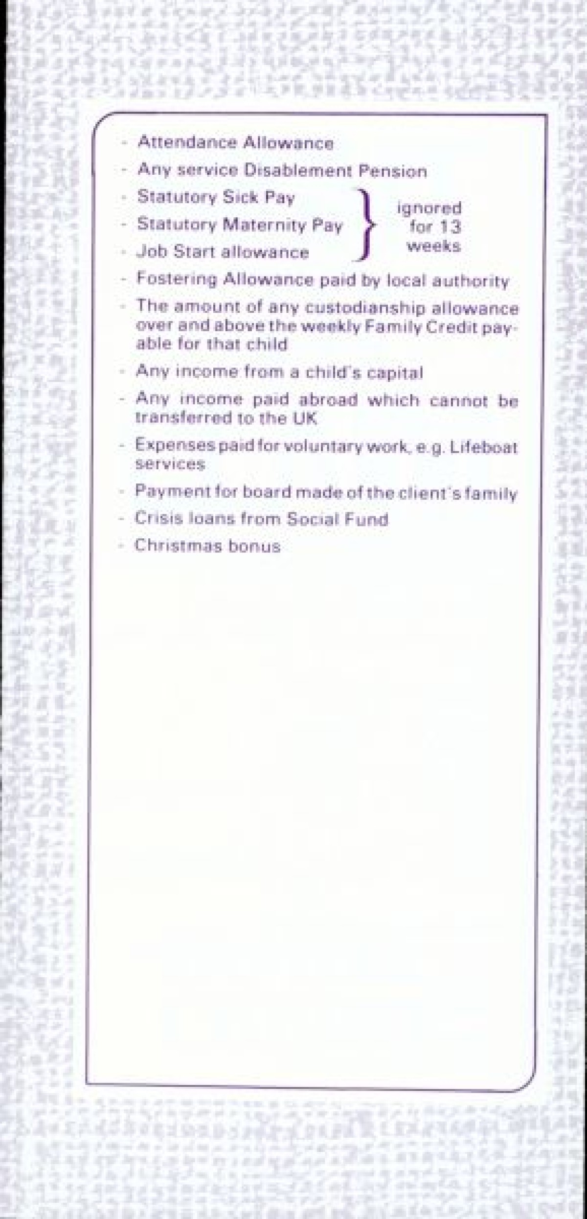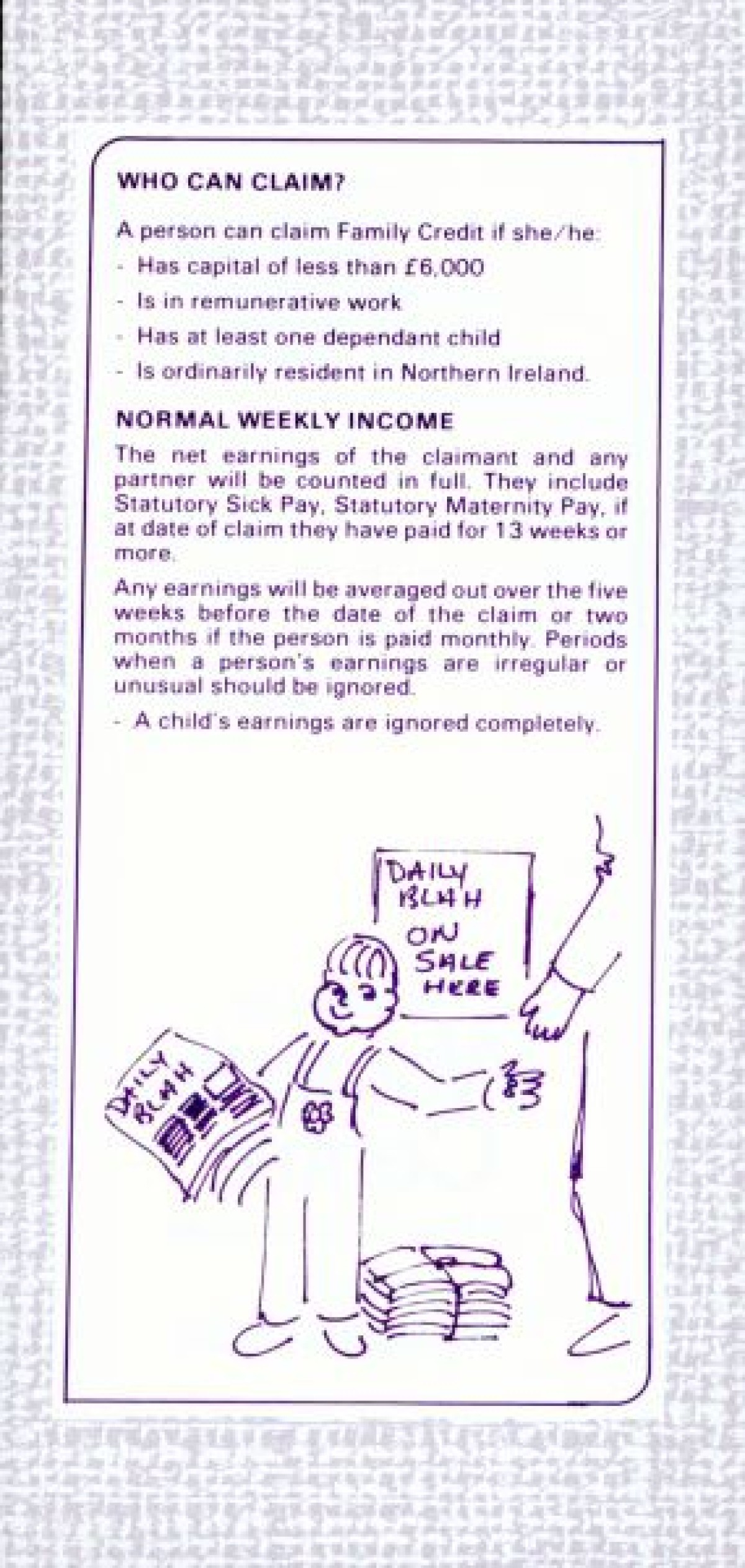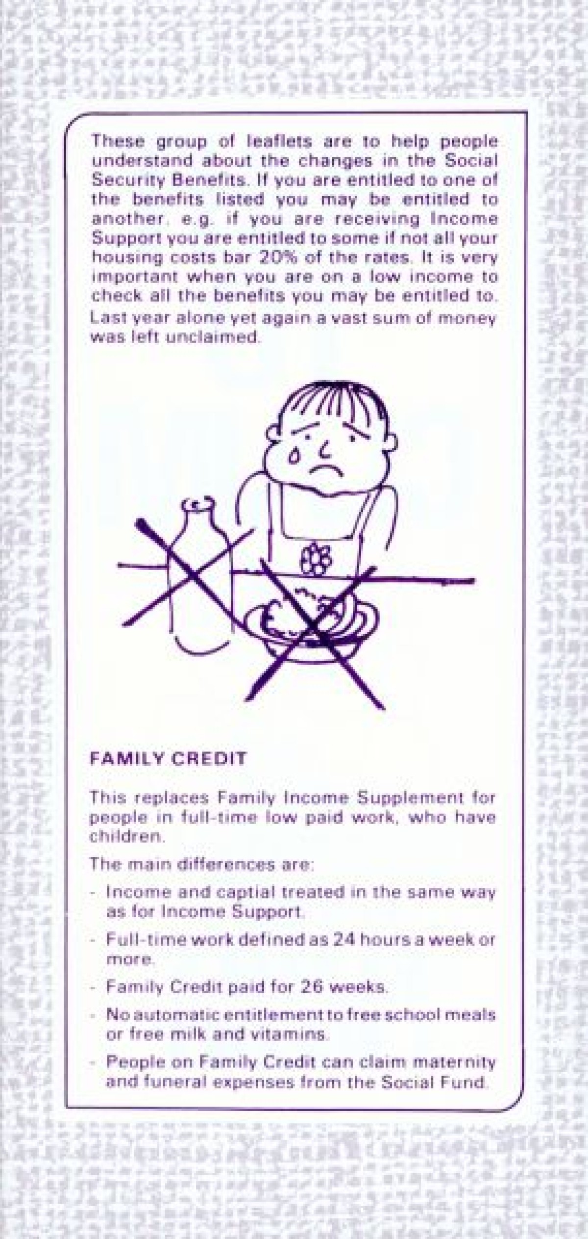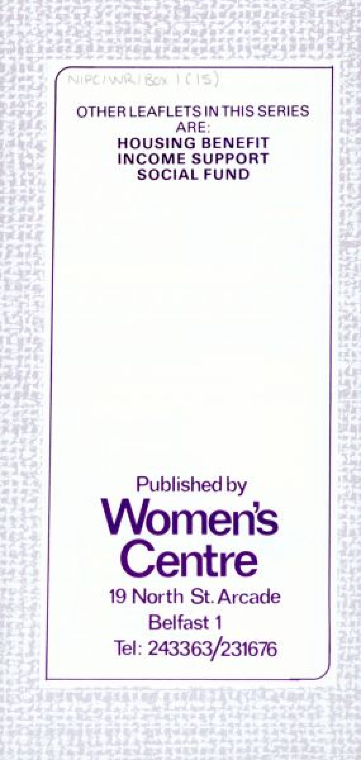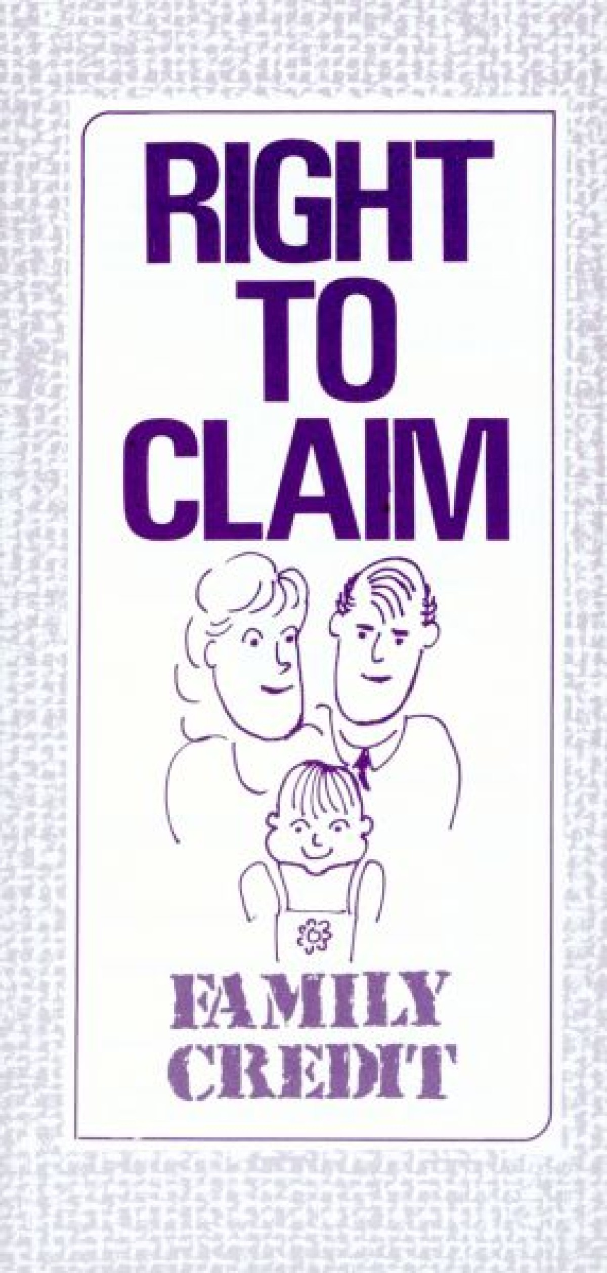 A leaflet published by the Belfast Women's Centre titled 'Right to Claim: Family Credit' which provides information on changes to Social Security Benefits, family credit and claimant eligibility requirements.