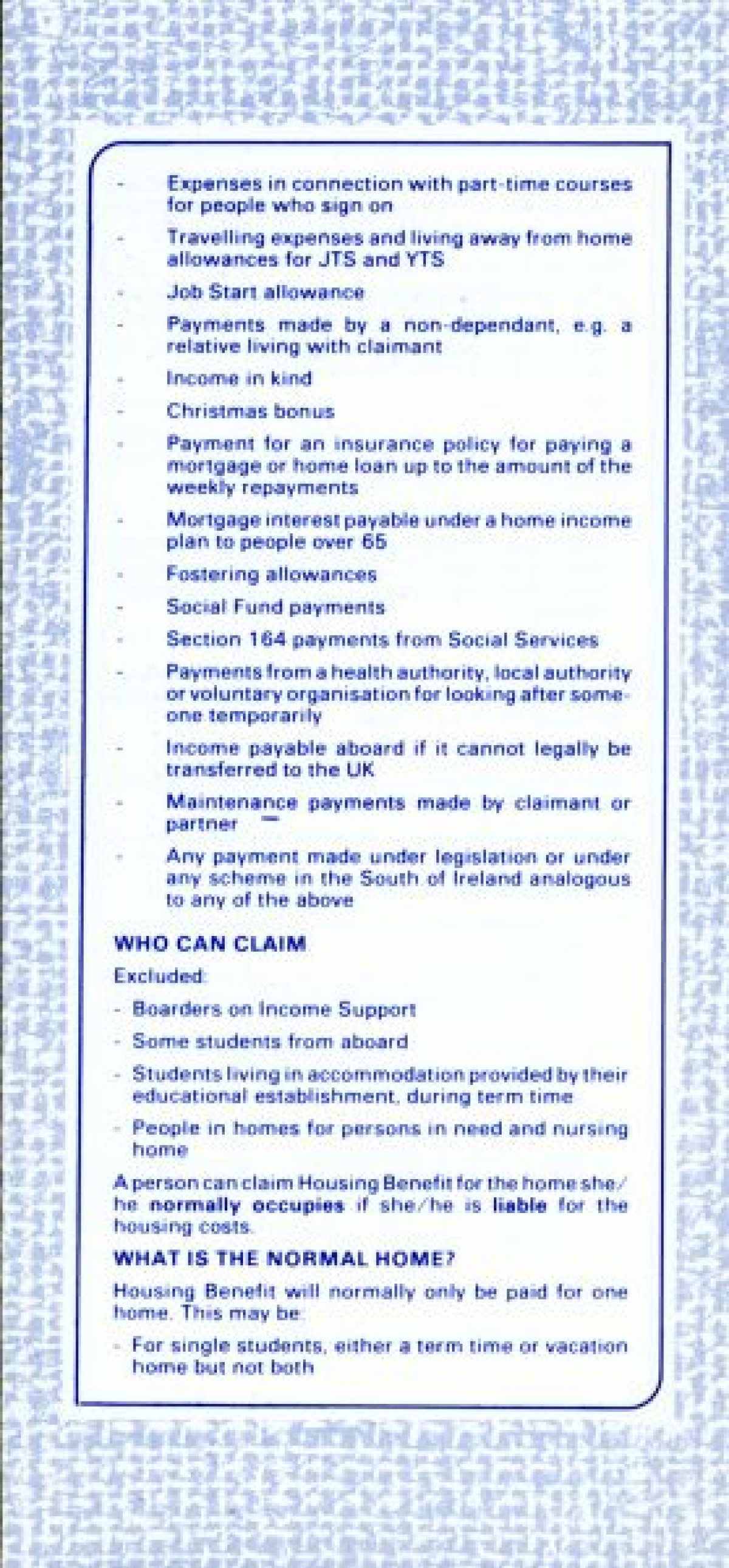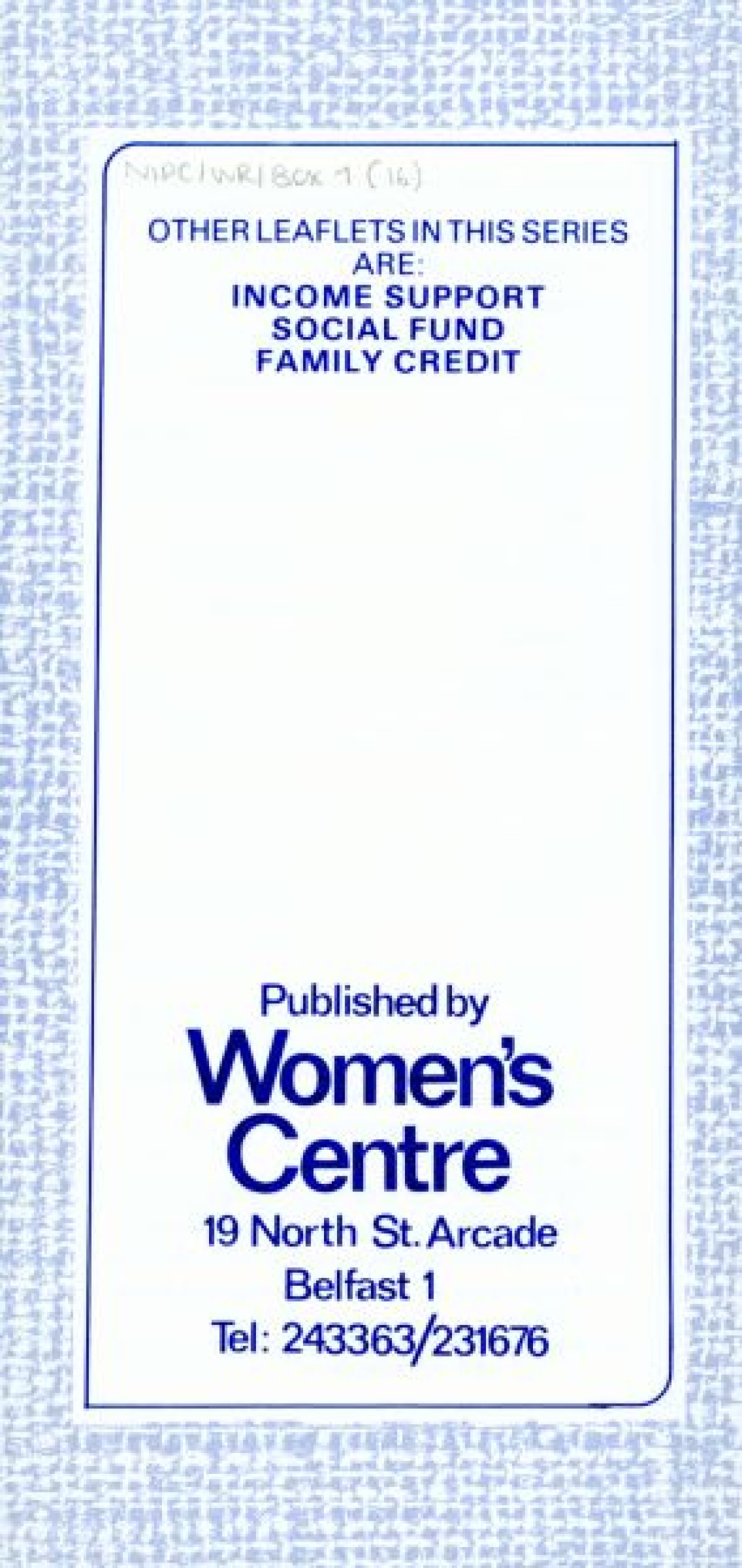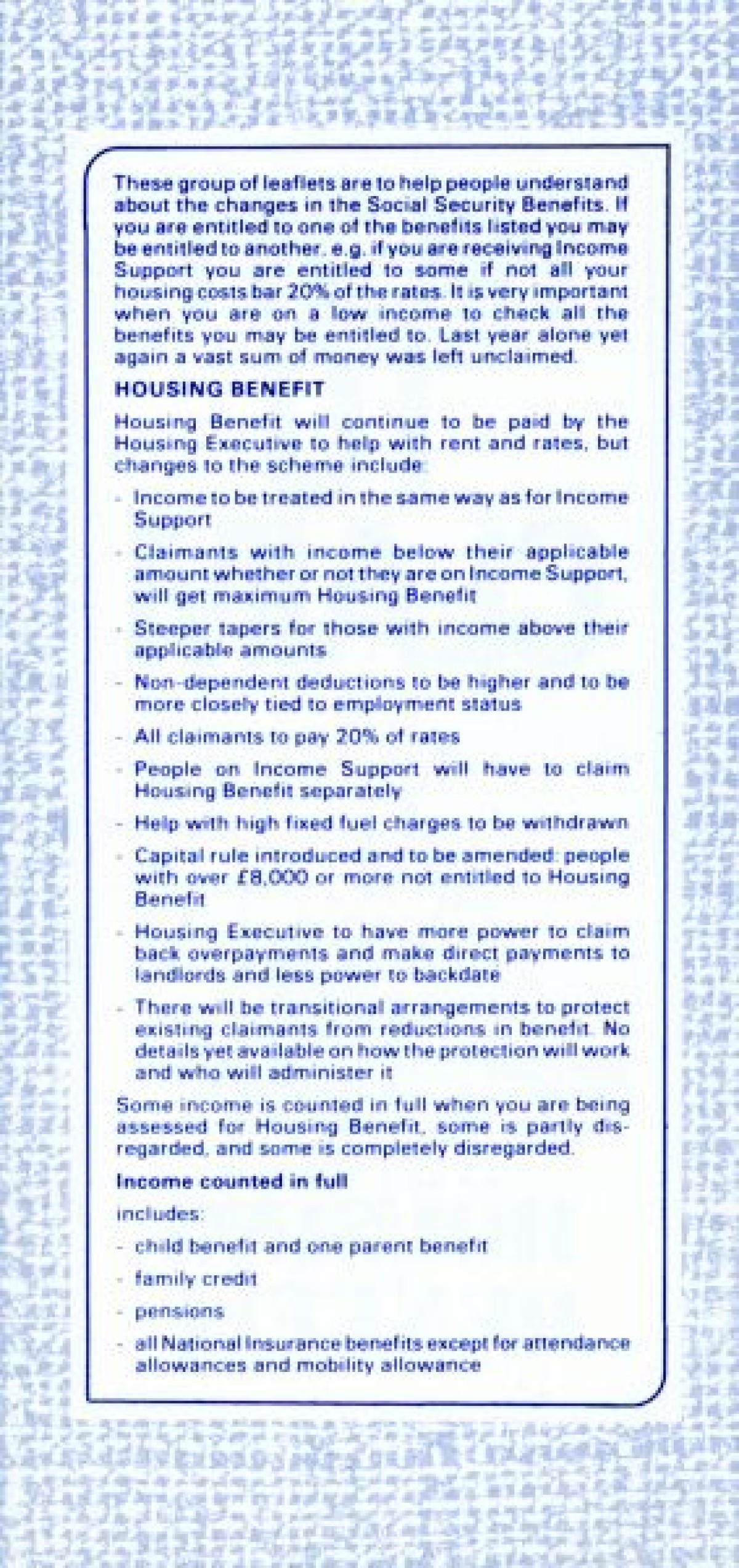 A leaflet published by the Belfast Women's Centre titled 'Right to Claim: Housing Benefit' which provides information on changes to Social Security Benefits and claimant eligibility requirements for housing benefit.