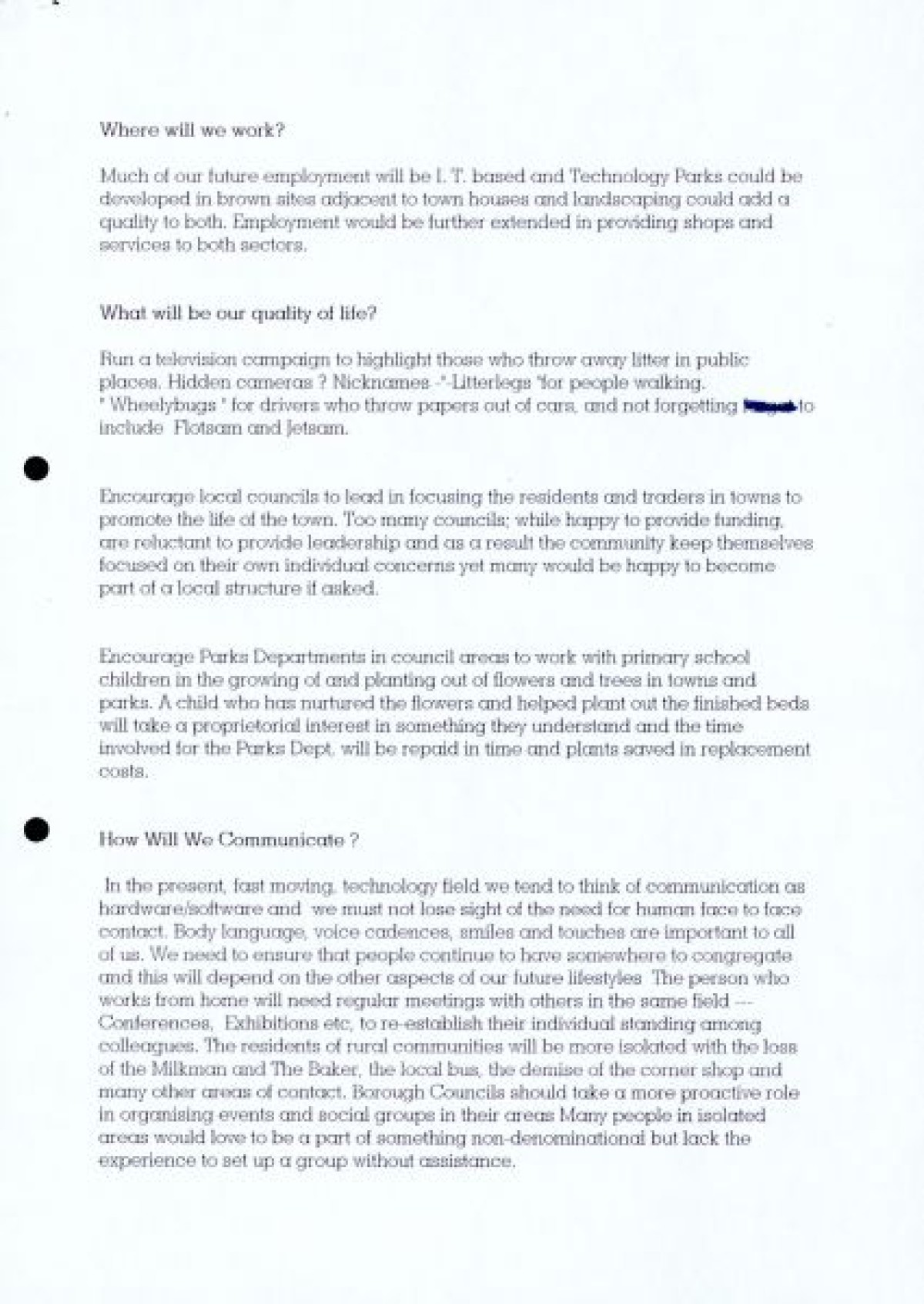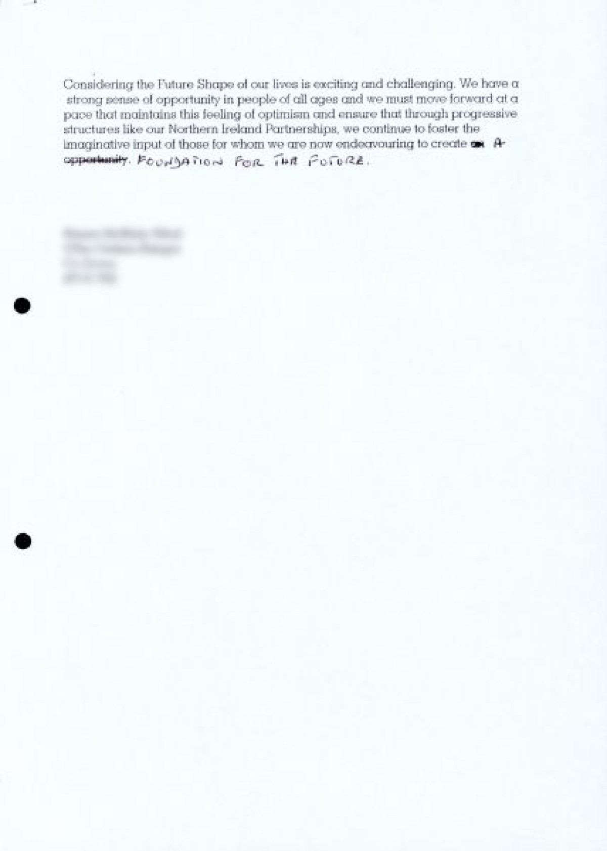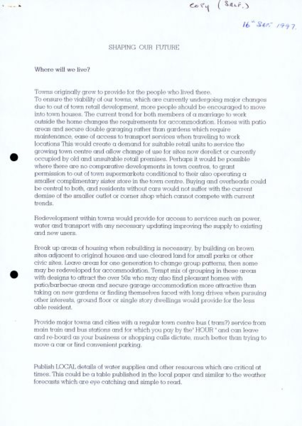 Northern Ireland Women's Coalition titled 'Shaping Our Future: Where will we live?' The document provides recommendations relating to town redevelopment, and proposes ways in which councils can work with communities to improve residential areas in relation to public parks, better transportation links, and the publishing of local details of water supplies and other resources.
