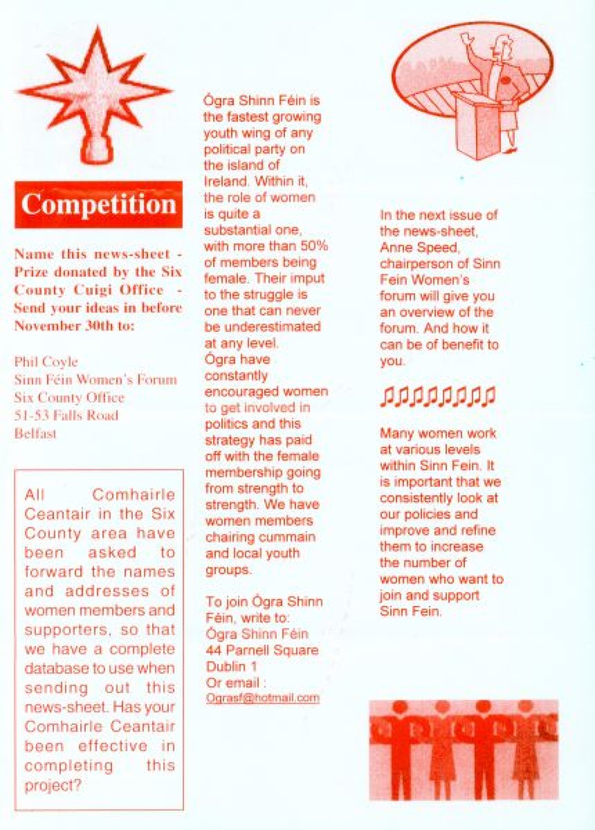 Joan Rainey, Marion Donaghy, Maeve McLaughlin, Elena Martin, Breege Meehan, Marie Cush, Ella O'Dwyre, Mairead Keane, Ann O'Sullivan, Olive Sloan, Francis McCole, Joan O'Connor, Dawn Doyle, Lucilita Breathnach, Rita O'Hare, Moore, Marie, Christine McAuley, Monica Digney, Claire McGill, Lynn Fleming, Cathy Rafferty, Marie Moore, Margaret McClenaghan, Dodie McGuinness, Siobhan O'Hanlon, Mary Nelis, Michelle Gildernew, Sue Ramsey, Anne Speed, Bairbre de Brún, Dara O'Hagan