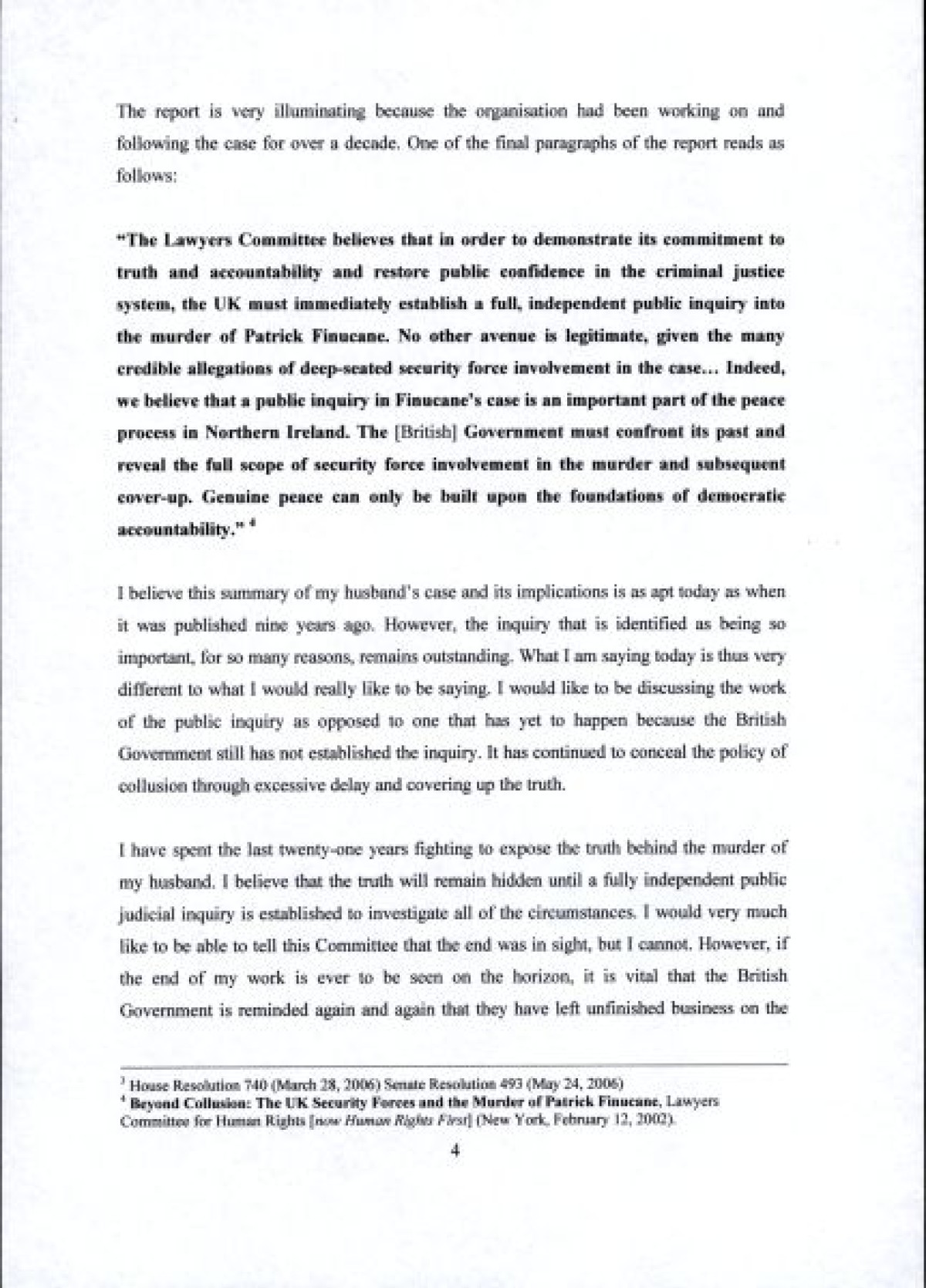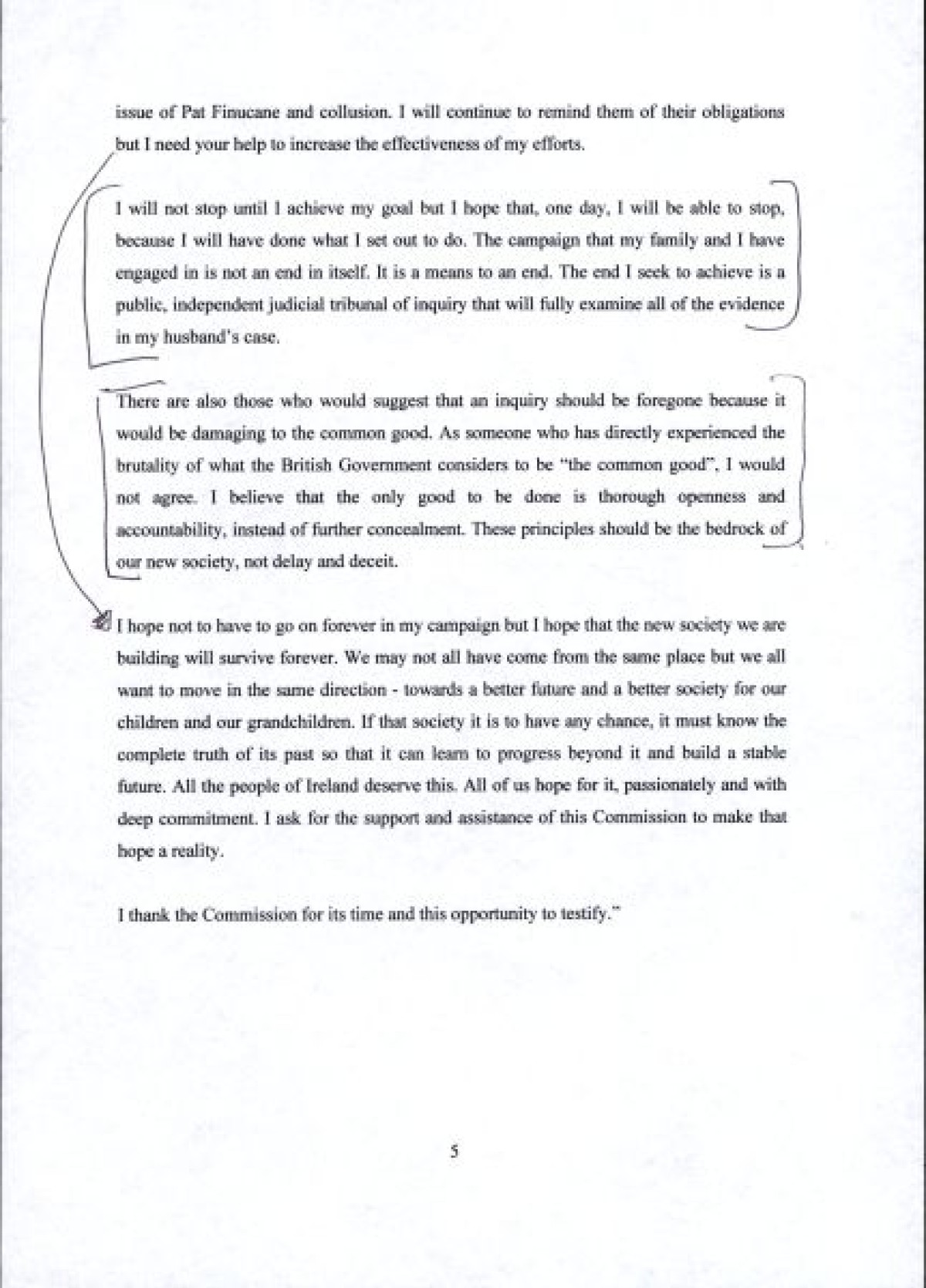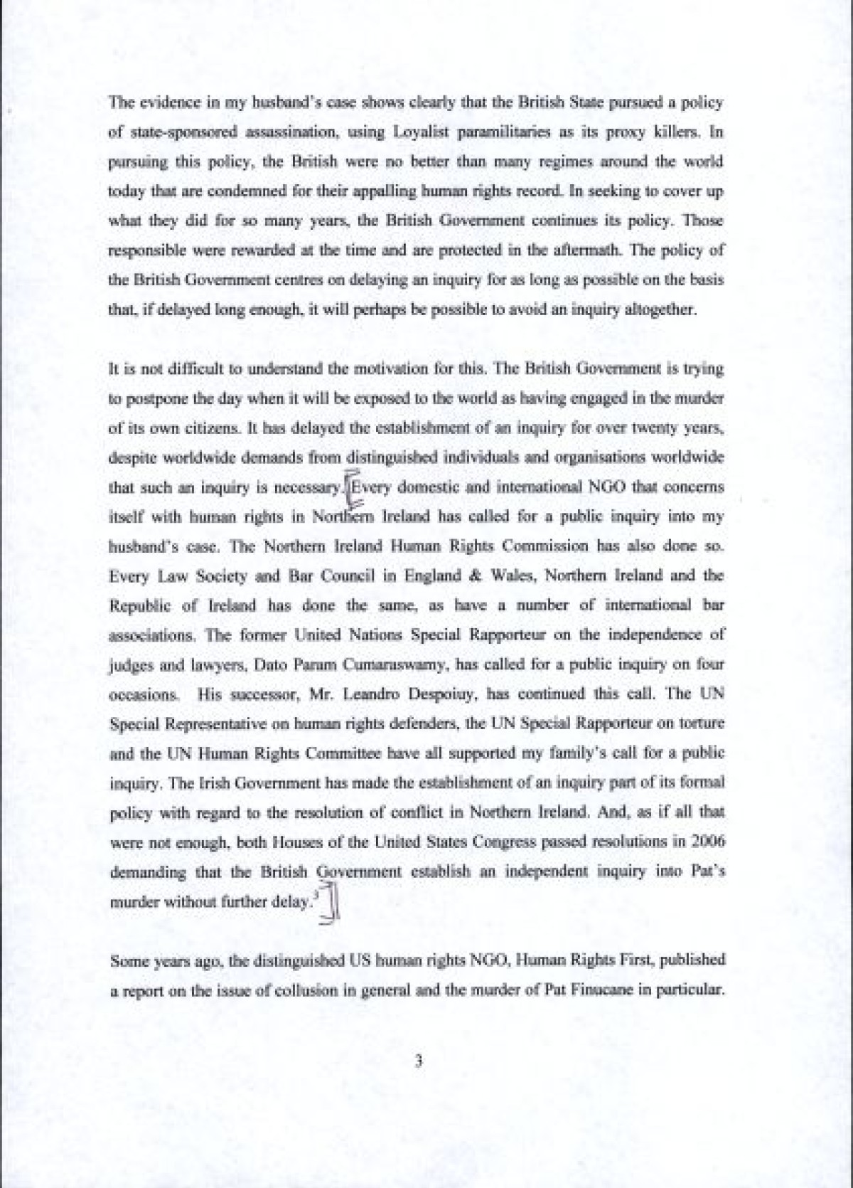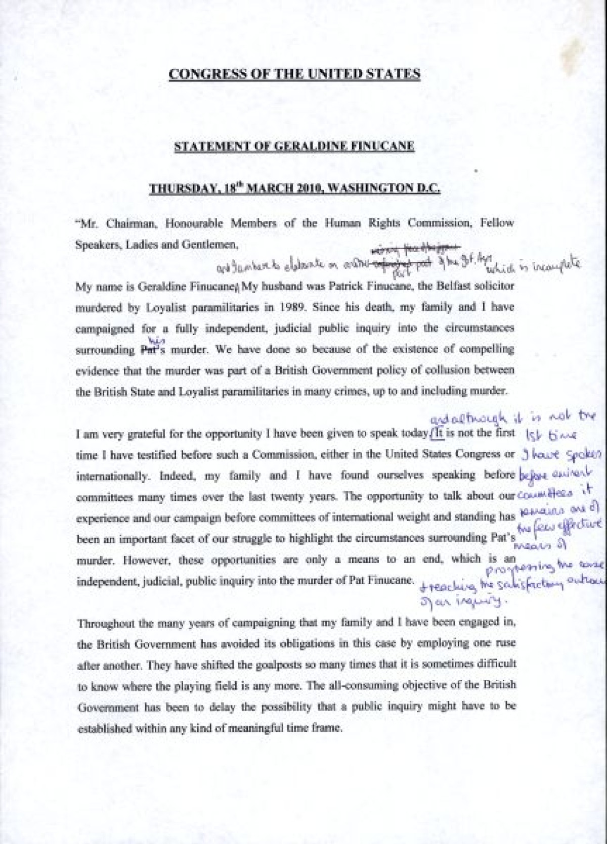 A typed statement delivered by Geraldine Finucane at an address to the Congress of the United States in March 2010, in Washington D.C. In her testimony, she speaks on the delay into a full public inquiry into the circumstances surrounding the murder of her husband, Pat, in 1989. Includes handwritten annotations and revisions in ink.