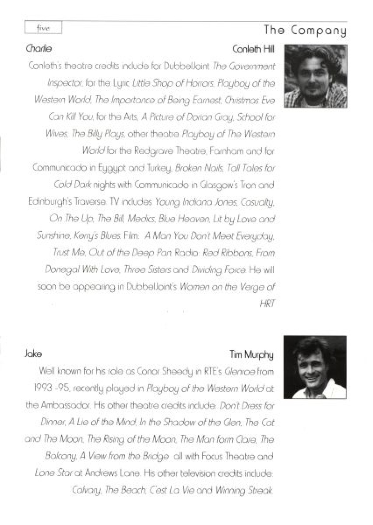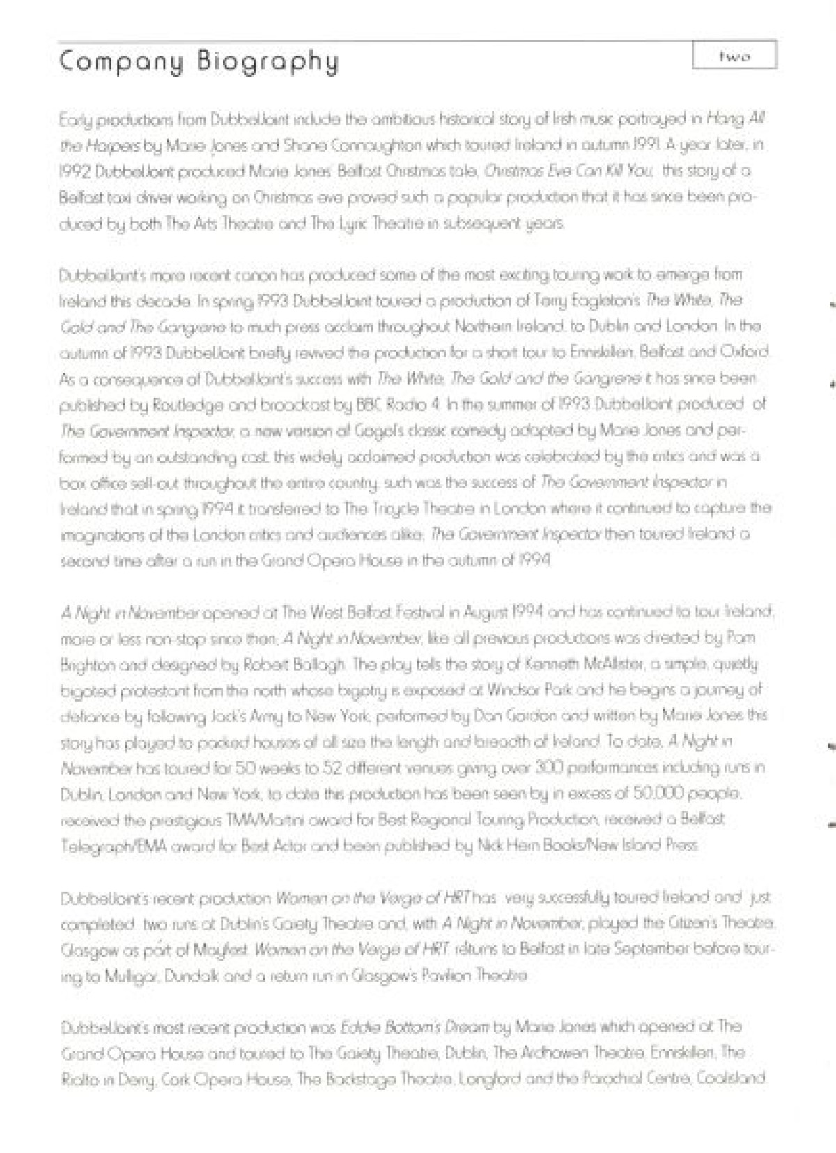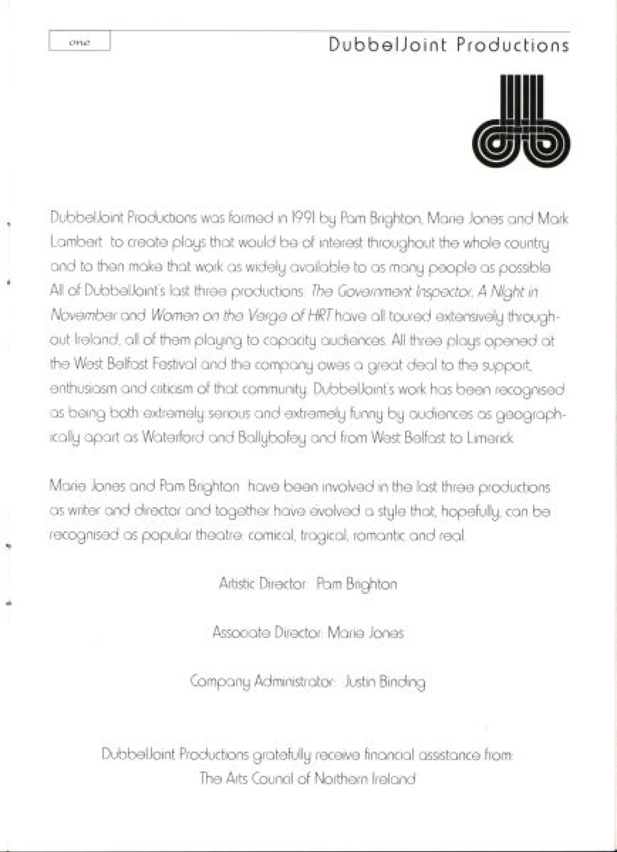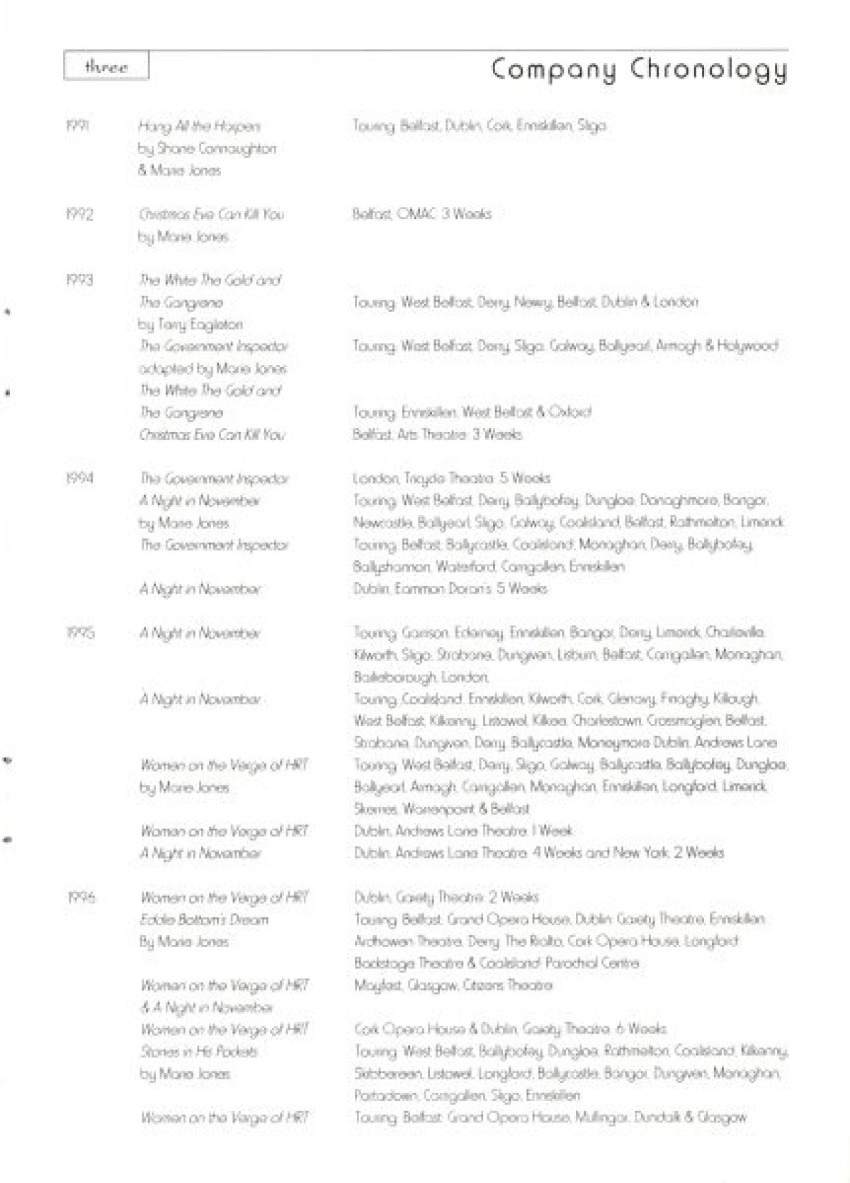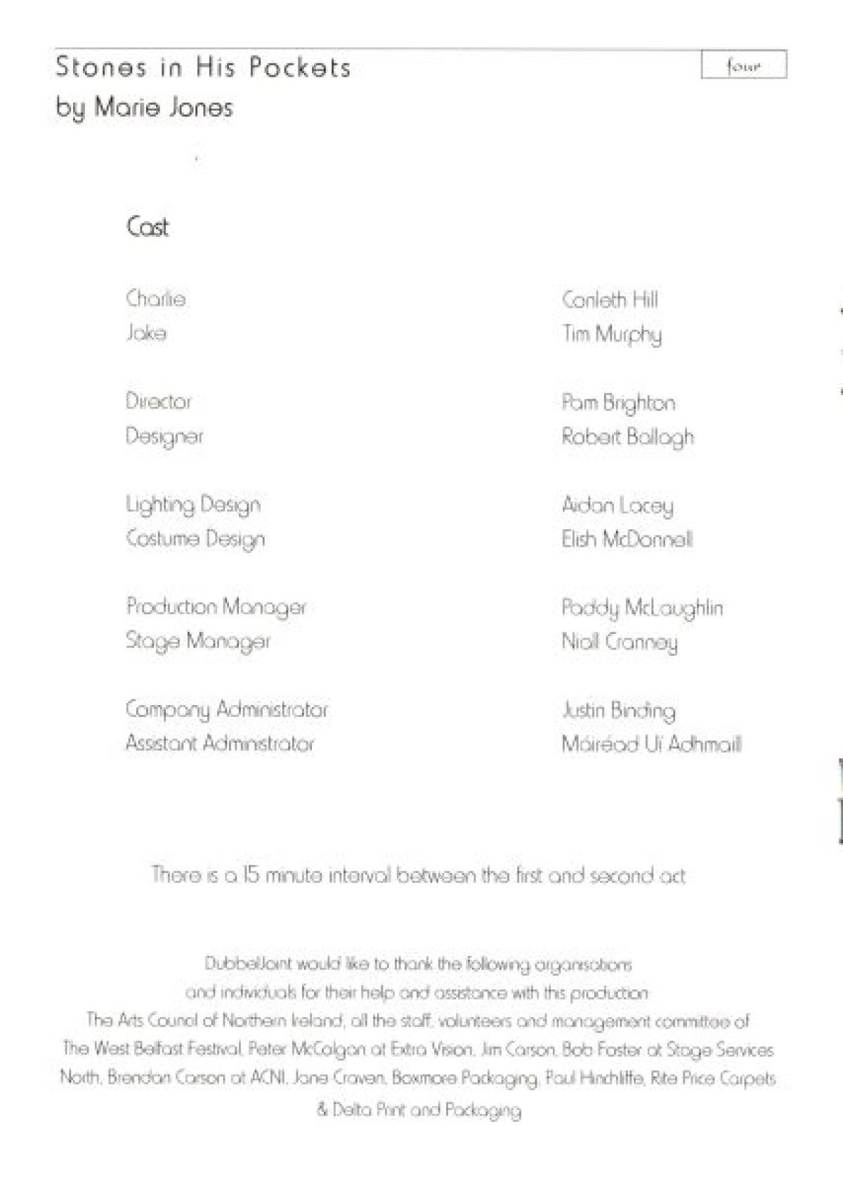 Programme for Stones in His Pockets, written by Marie Jones, directed by Pam Brighton and featuring a chronology of the company's work.