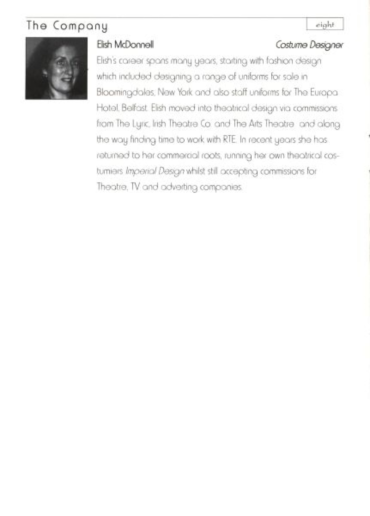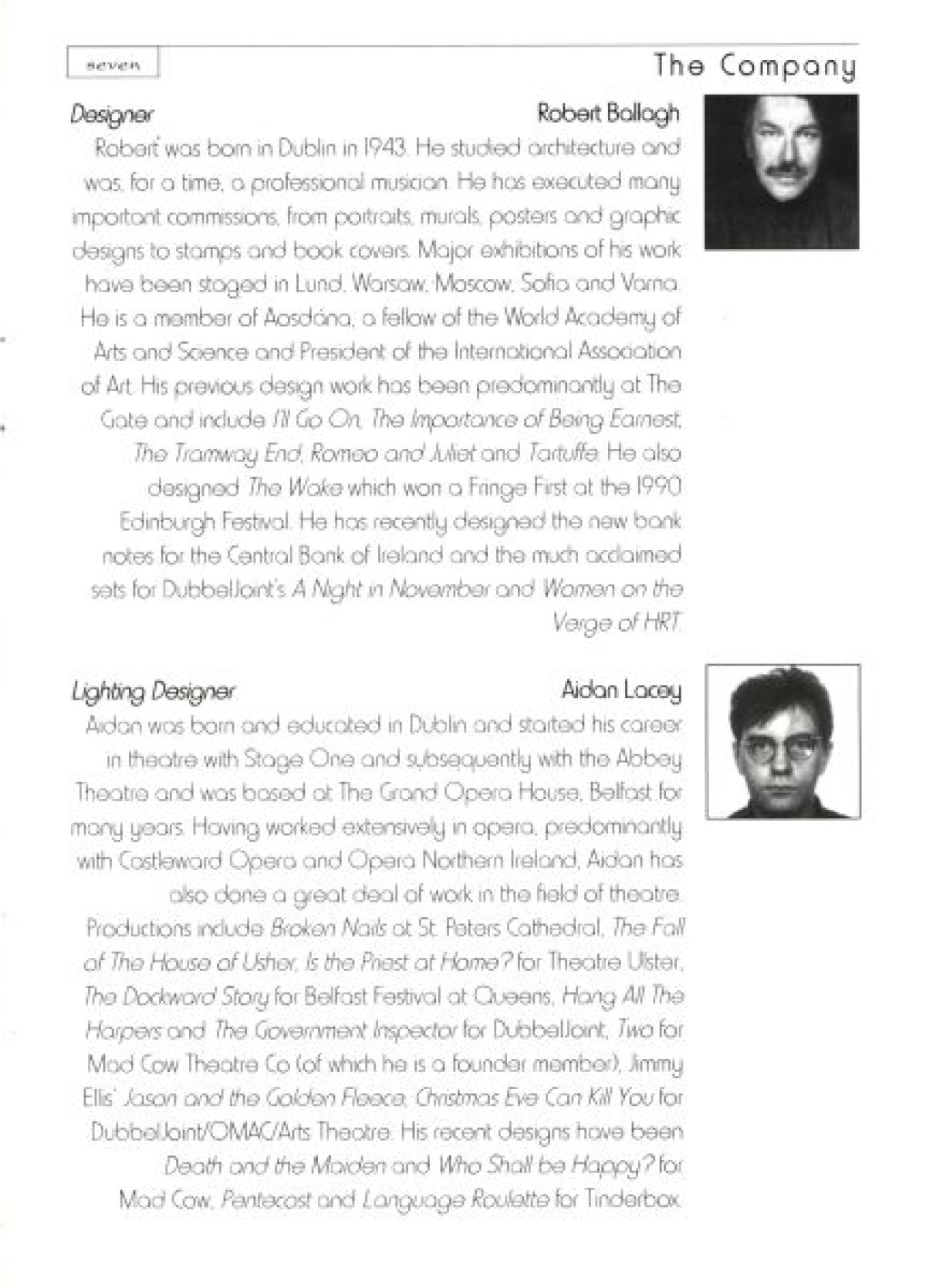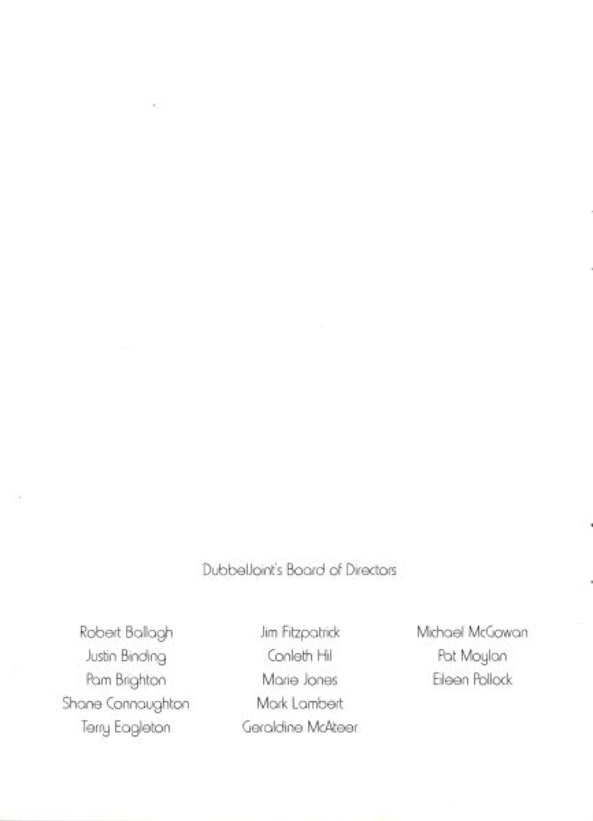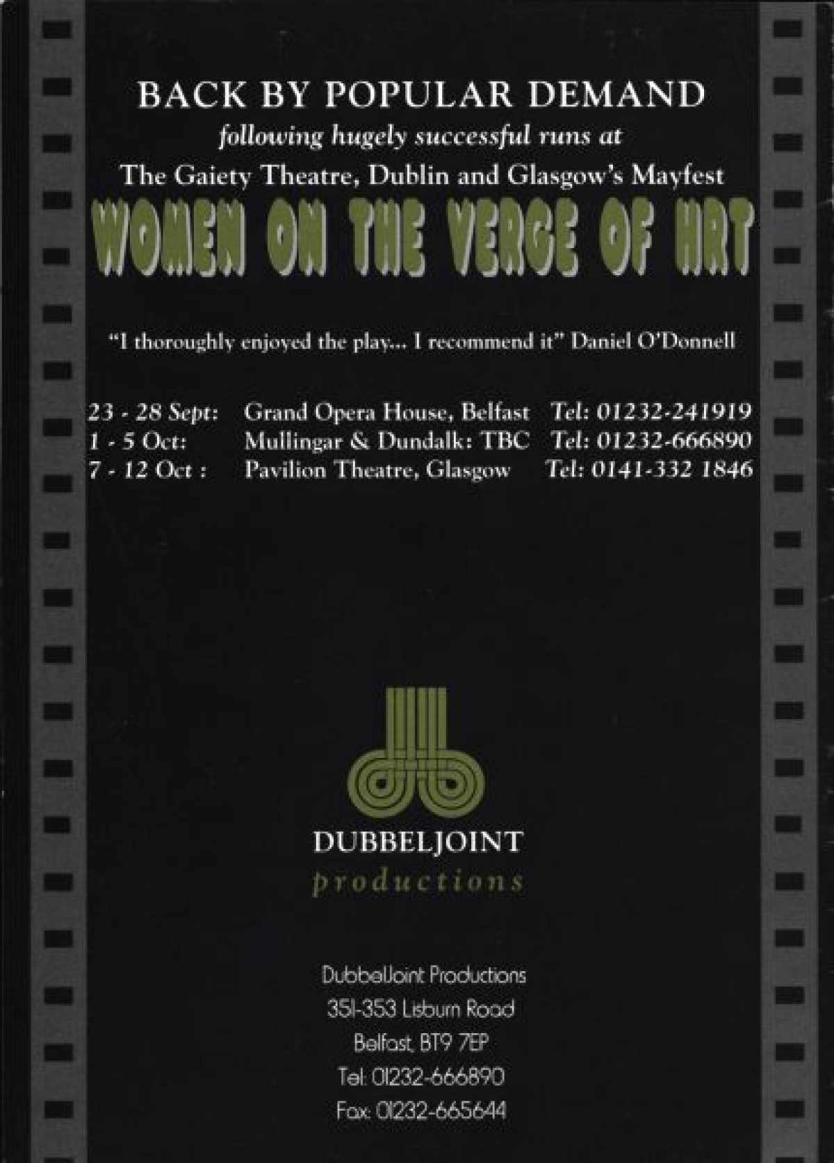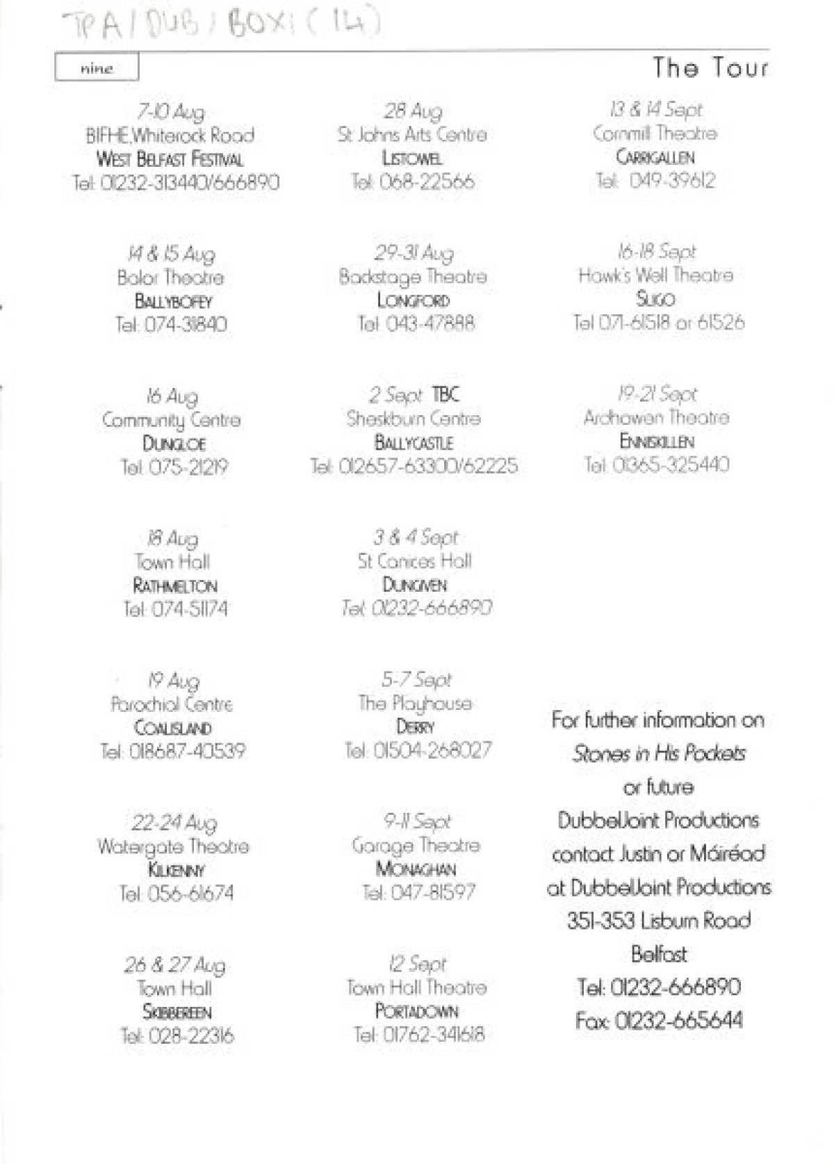 Programme for Stones in His Pockets, written by Marie Jones, directed by Pam Brighton and featuring a chronology of the company's work.