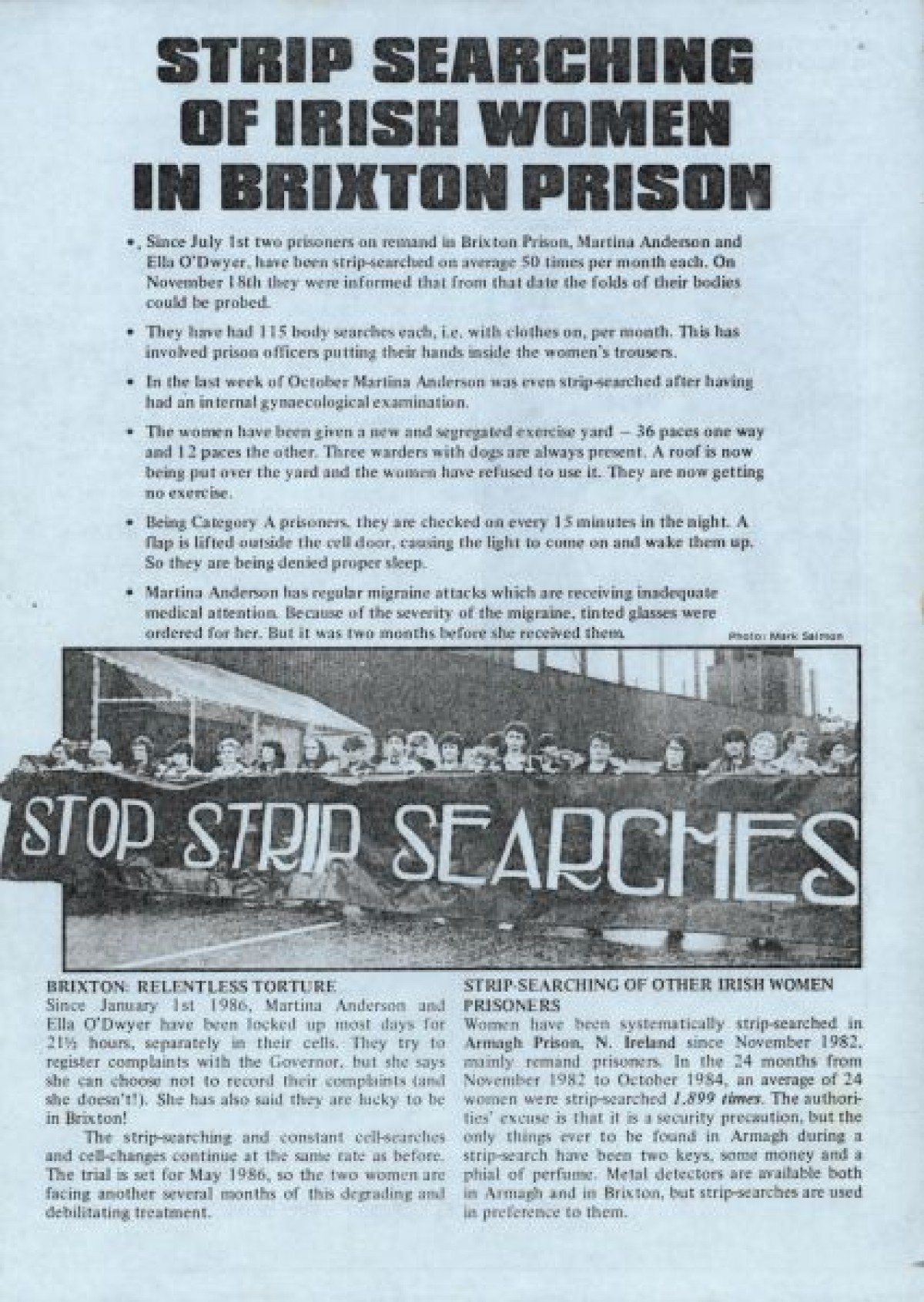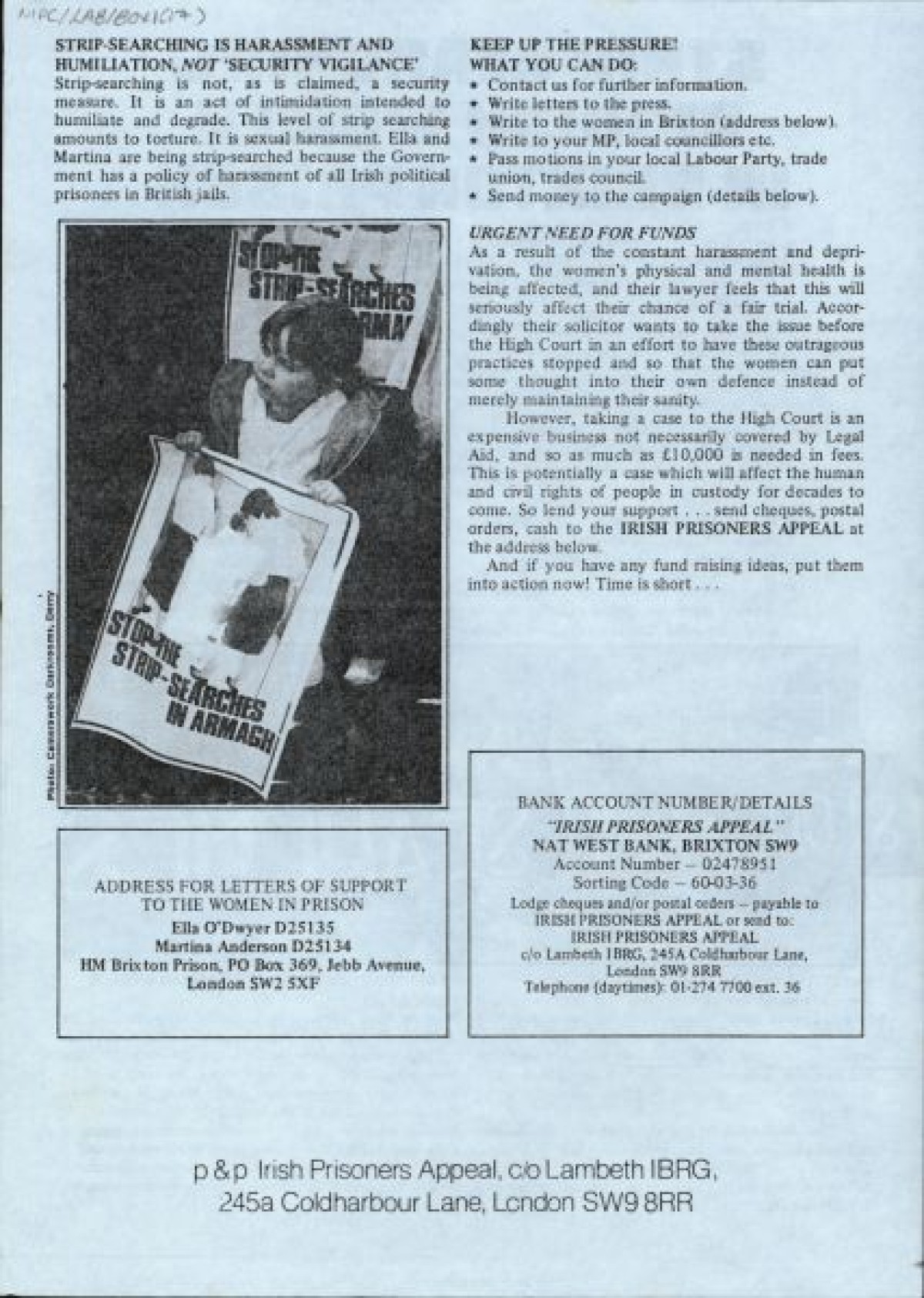 Typewritten document on blue paper, produced by the Irish Prisoners Appeal. Discusses Strip Searching of Irish Women in Brixton Prison, and contains an appeal for funds. Illustrated with black and white photographs of protesters.