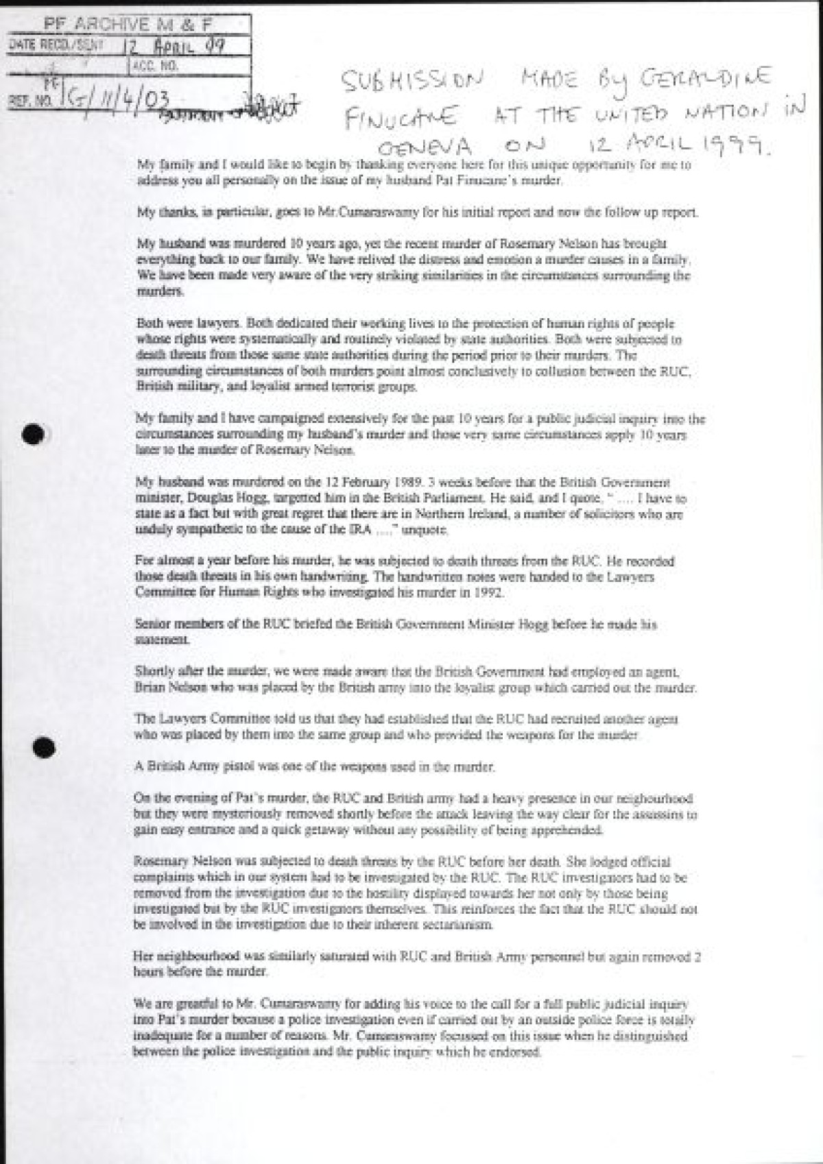 A submission made by Geraldine Finucane at the United Nations Human Rights Annual Commission in Geneva on the 12