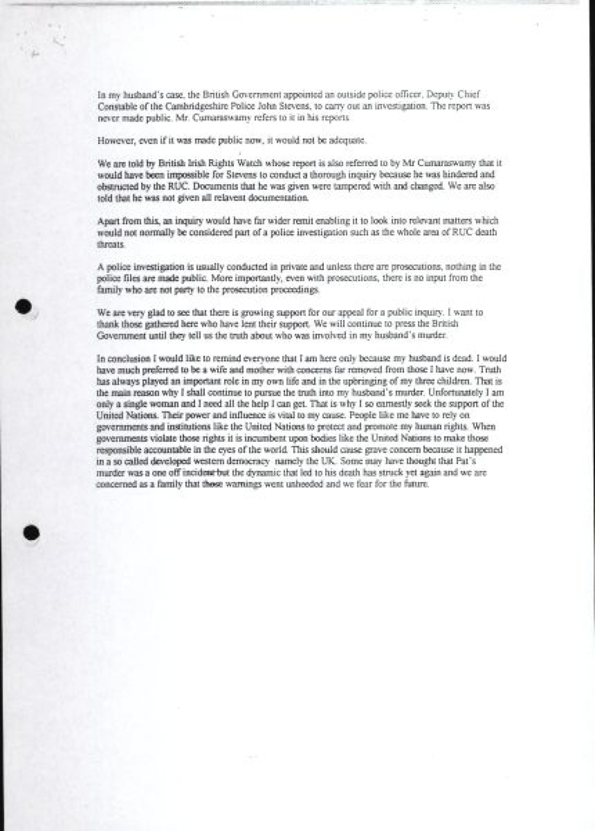 th April, 1999, shortly after the murder of Rosemary Nelson. In the statement, she draws similarities between Rosemary Nelson's murder and her husband's; both lawyers subjected to death threats who "dedicated their working lives to the protection of human rights of people whose rights were systematically and routinely violated by state authorities". She concludes that both murders "point to collusion" between the RUC, British military, and loyalist armed terrorist groups, and calls for public inquires and the support of the United Nations to protect and promote human rights.