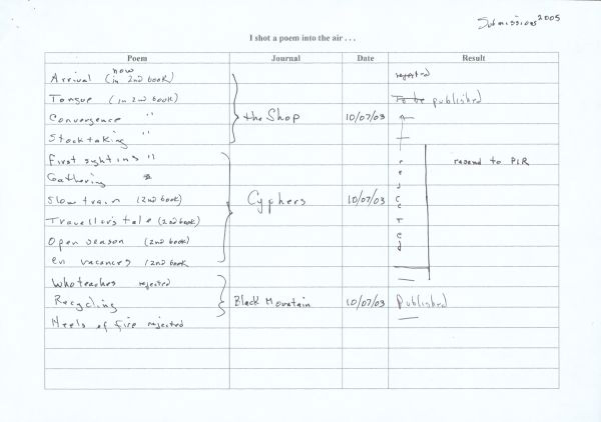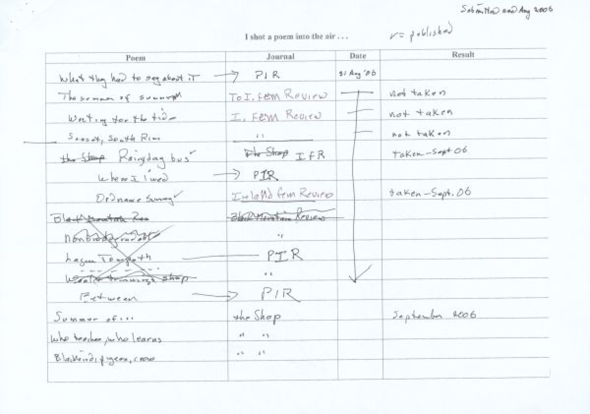 A spreadsheet of Anne Zell's poetry submissions to publishers since