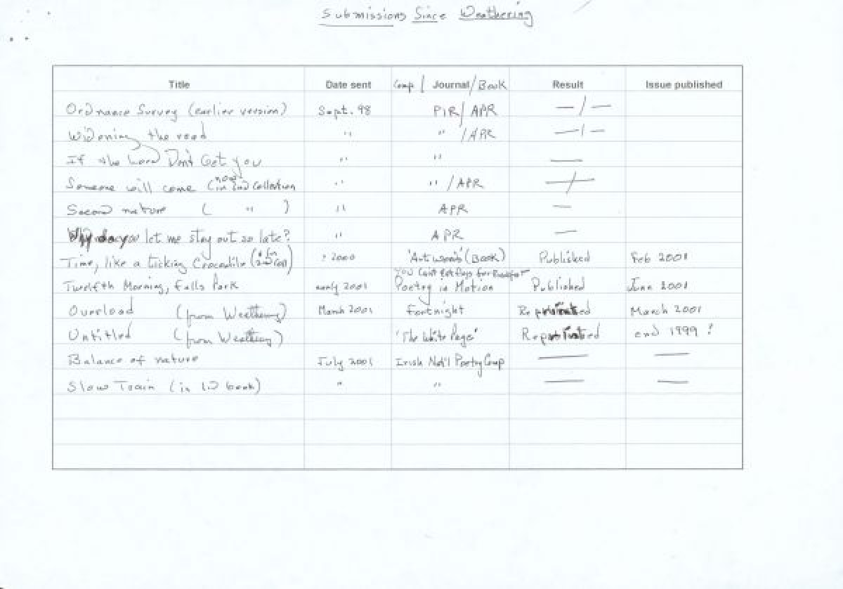 Weathering was published. Includes title of poem, date sent, name of publication, result, and issue published.