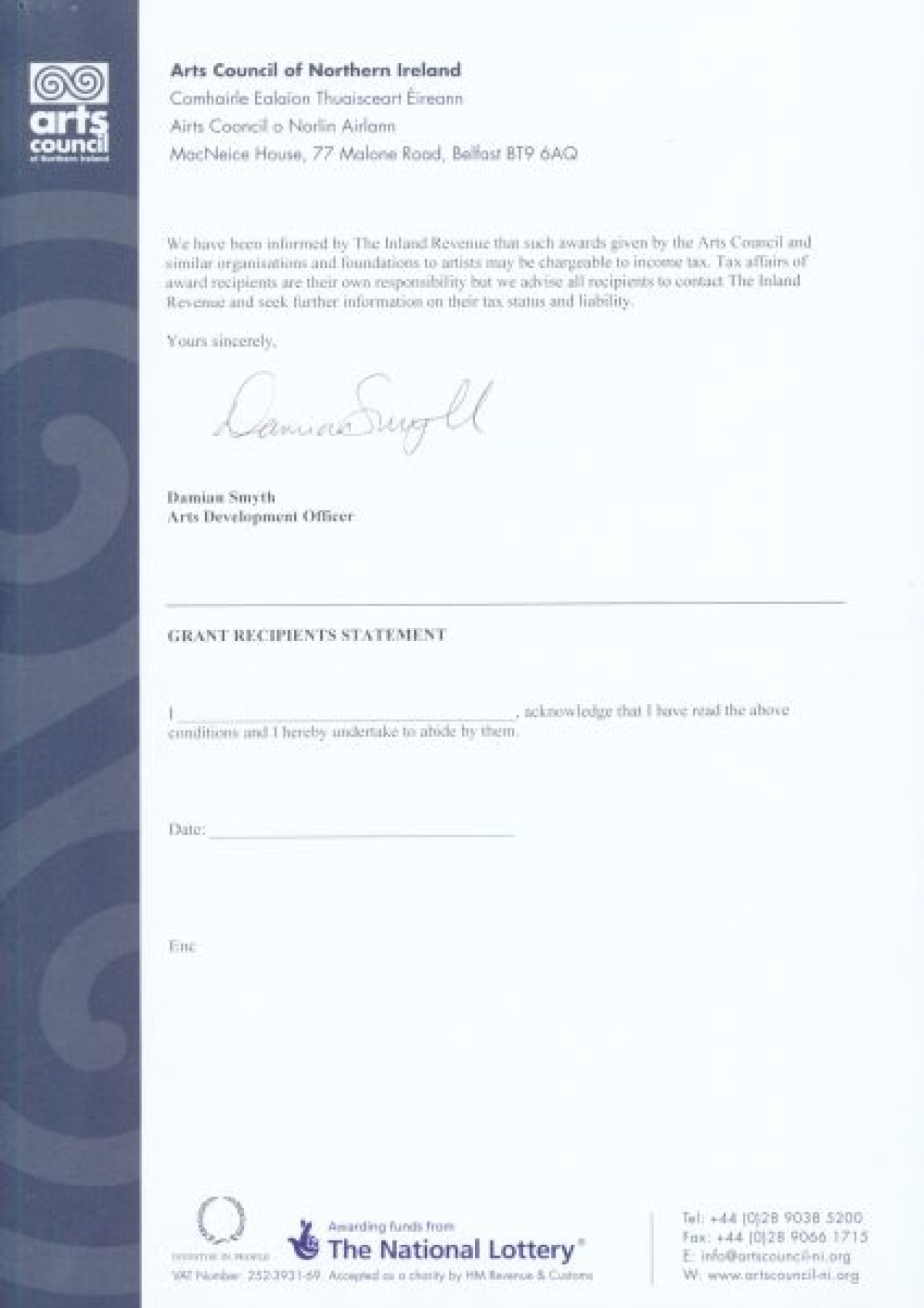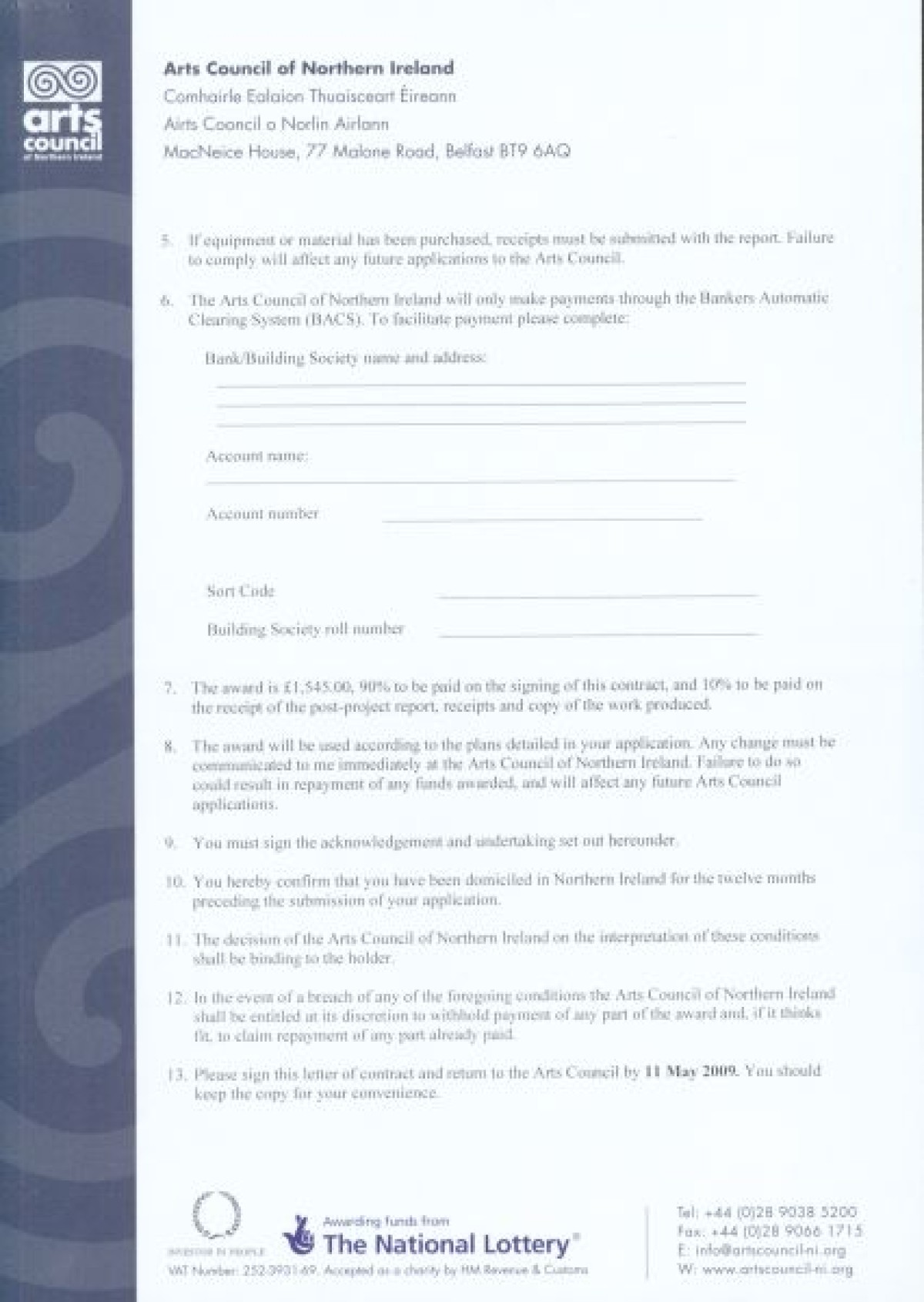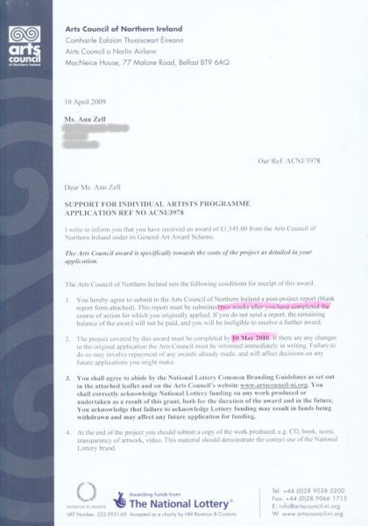 Arts Council of Northern Ireland to Ann Zell, confirming an award of £1545 grant in a Support for Individual Artists programme, and outlining conditions of the award, dated 10th April 2009. A second letter by Craig Corsar, dated 20th April 2009, confirms a 90% instalment paid to Ann Zell, by the Arts Council NI.