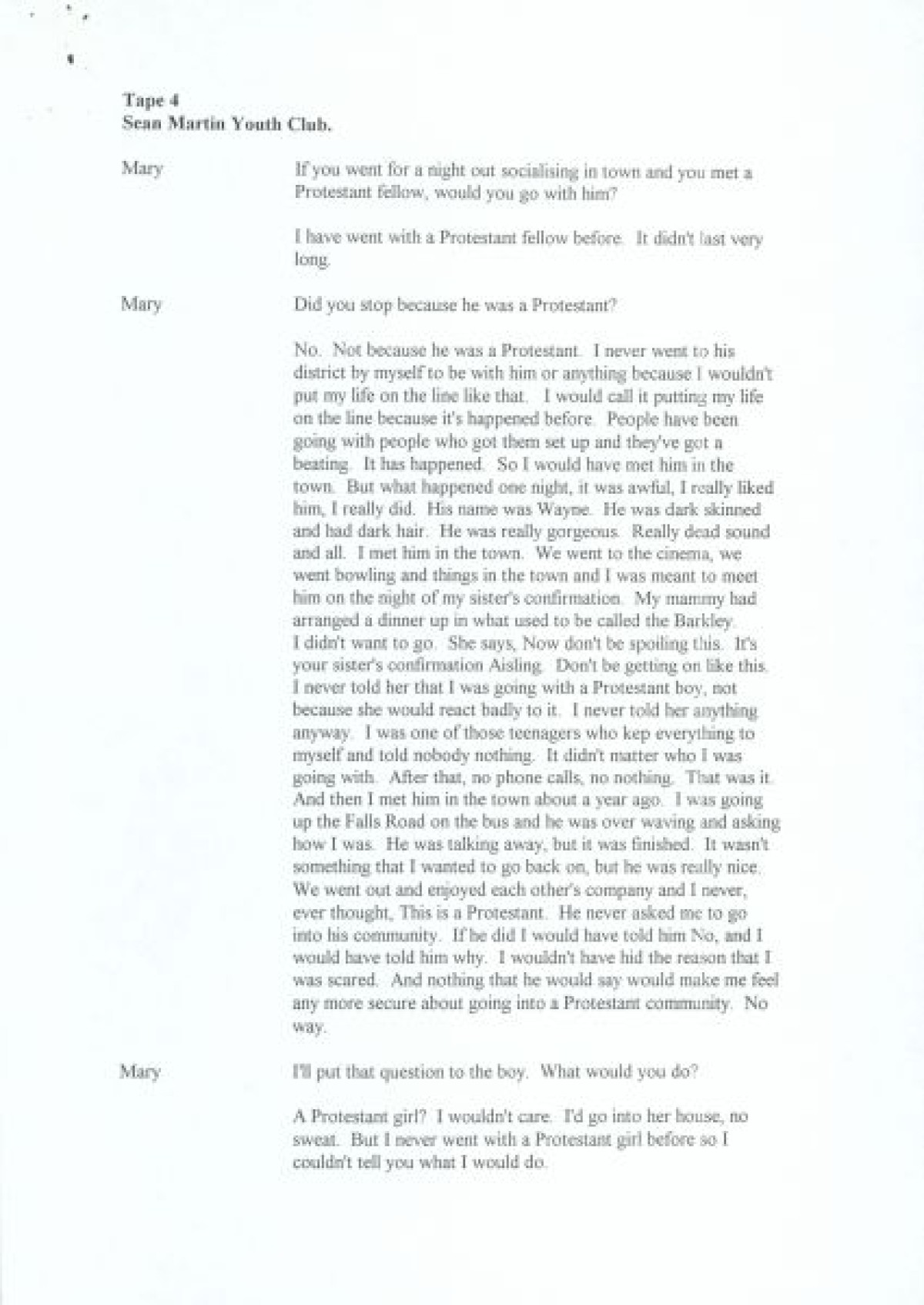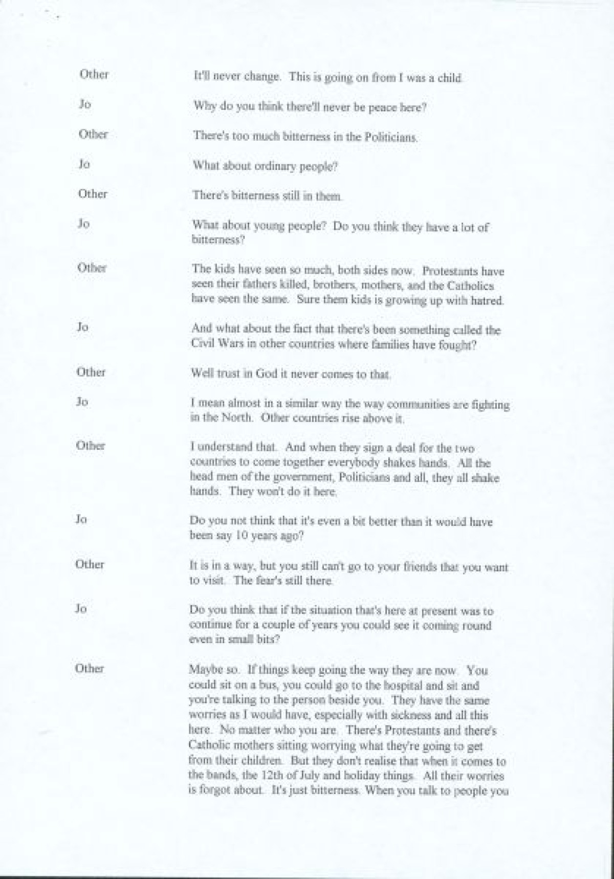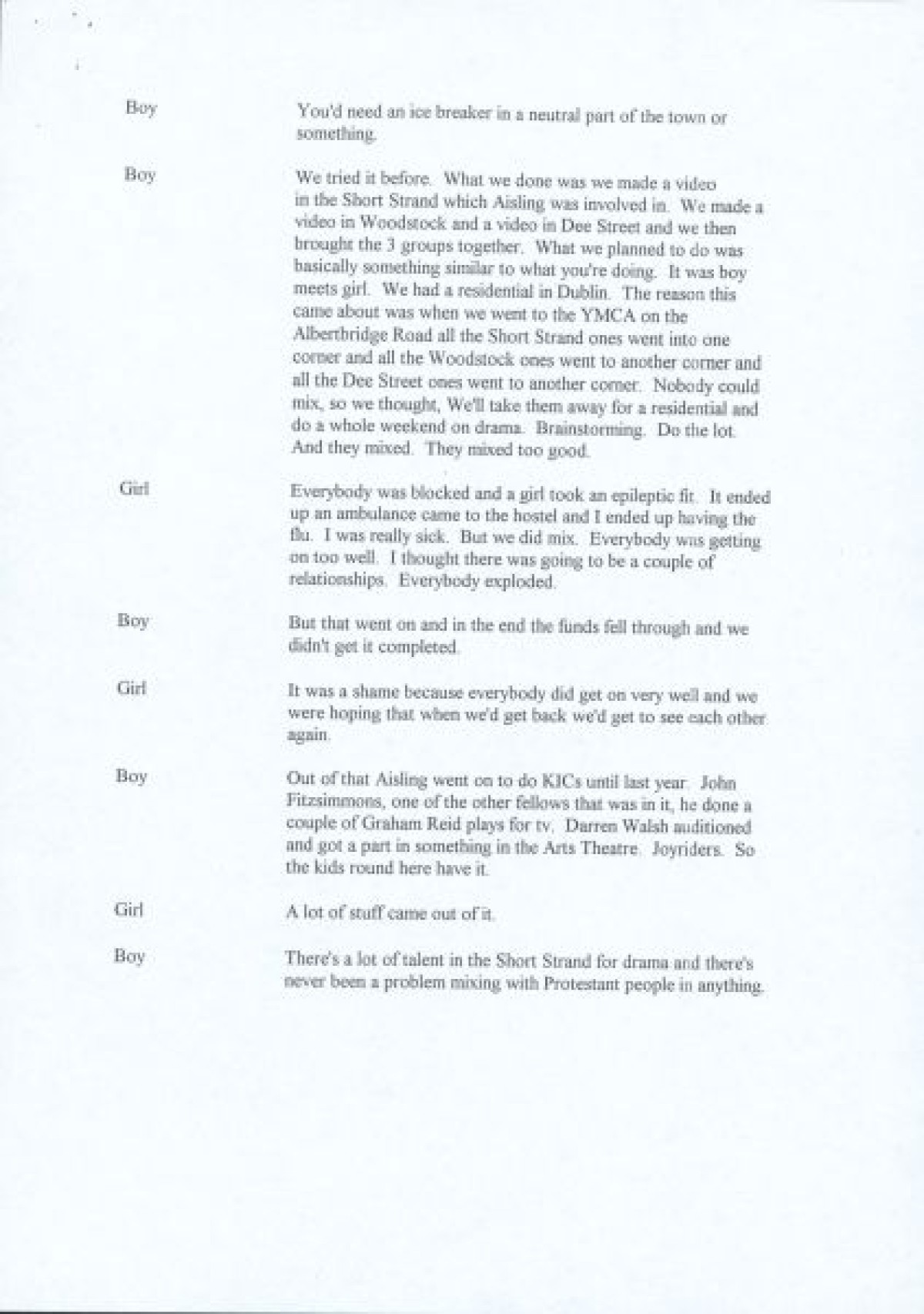 Transcript from interviews conducted by Jo Egan at Sean Martin Youth Club during research for the