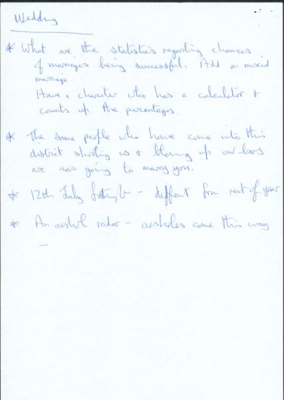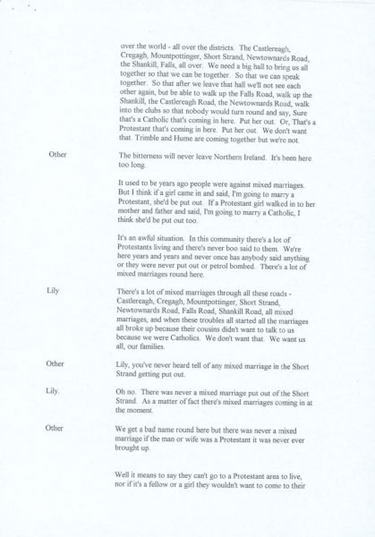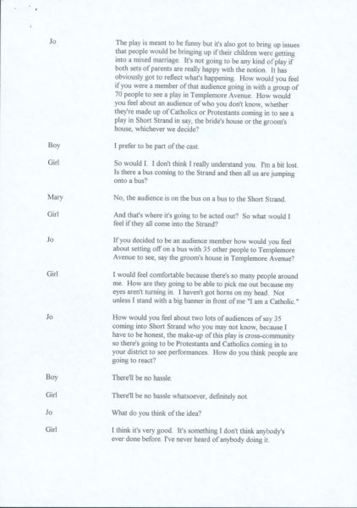 Wedding Community Play. Includes accounts from young people about being in mixed relationships, being in a mixed audience in Protestant and Catholic neighbourhoods, and cross-community attitudes. Also contains an account of an abusive father, growing up with sectarianism, and fears around being in a mixed marriage. Includes handwritten notes and ideas on back page.