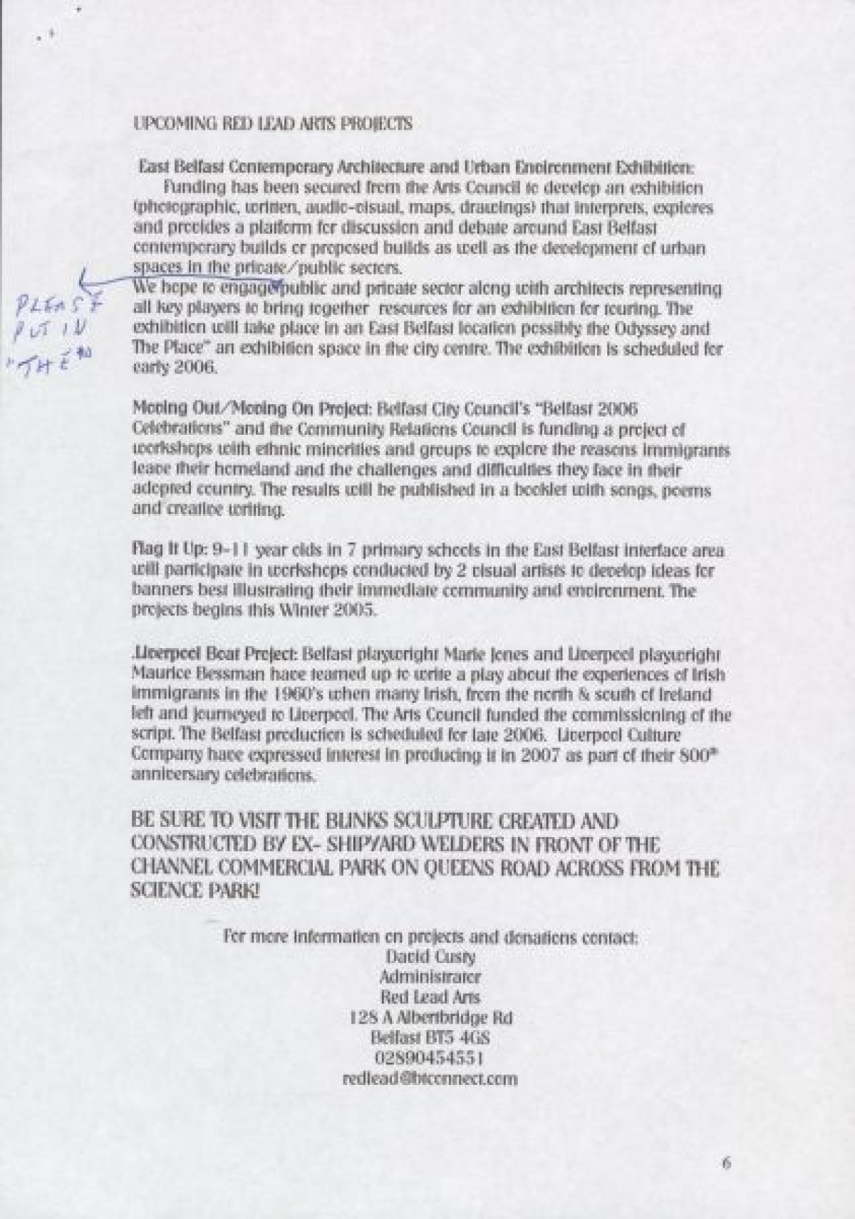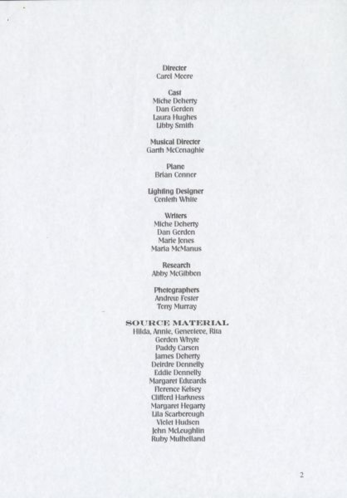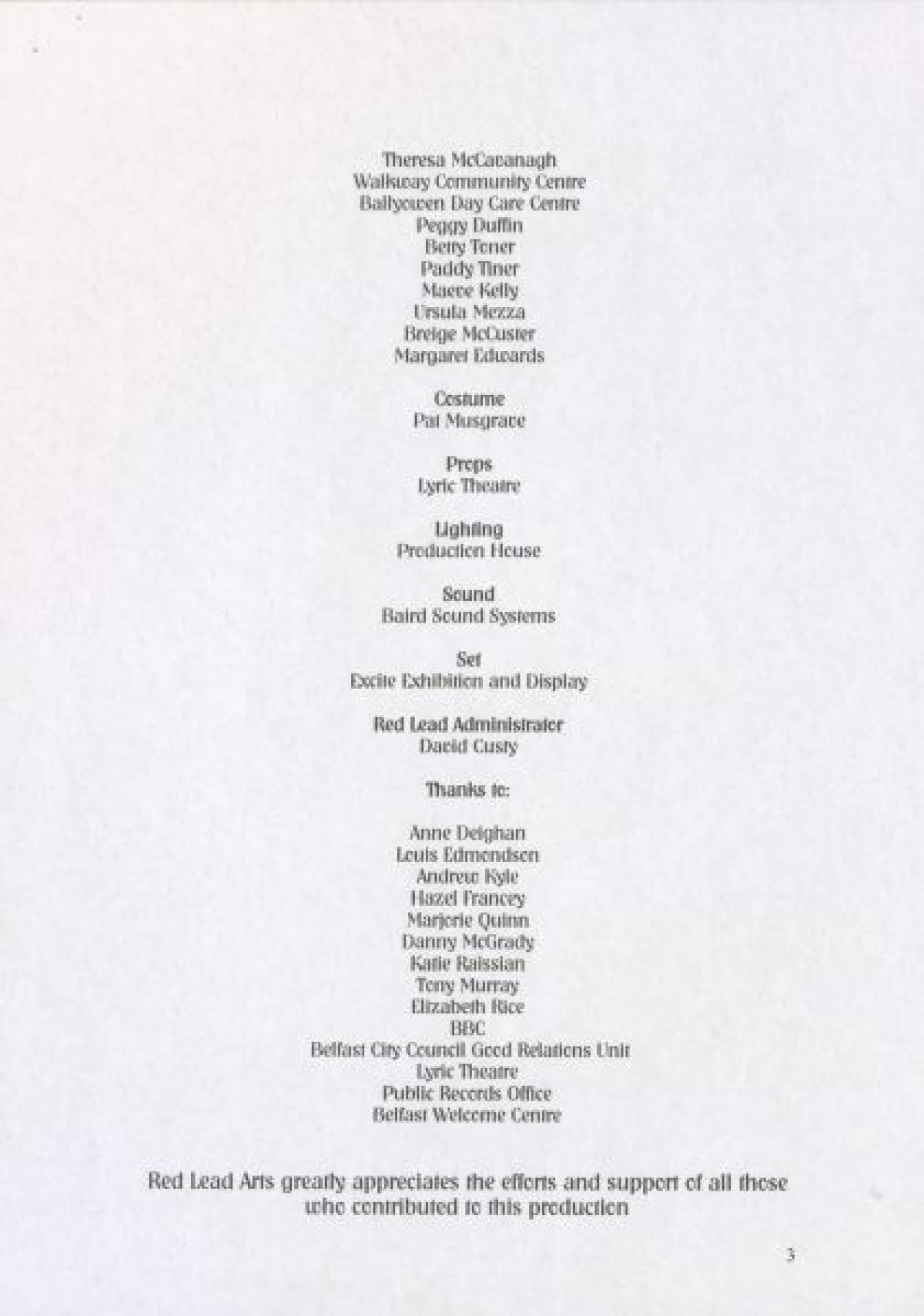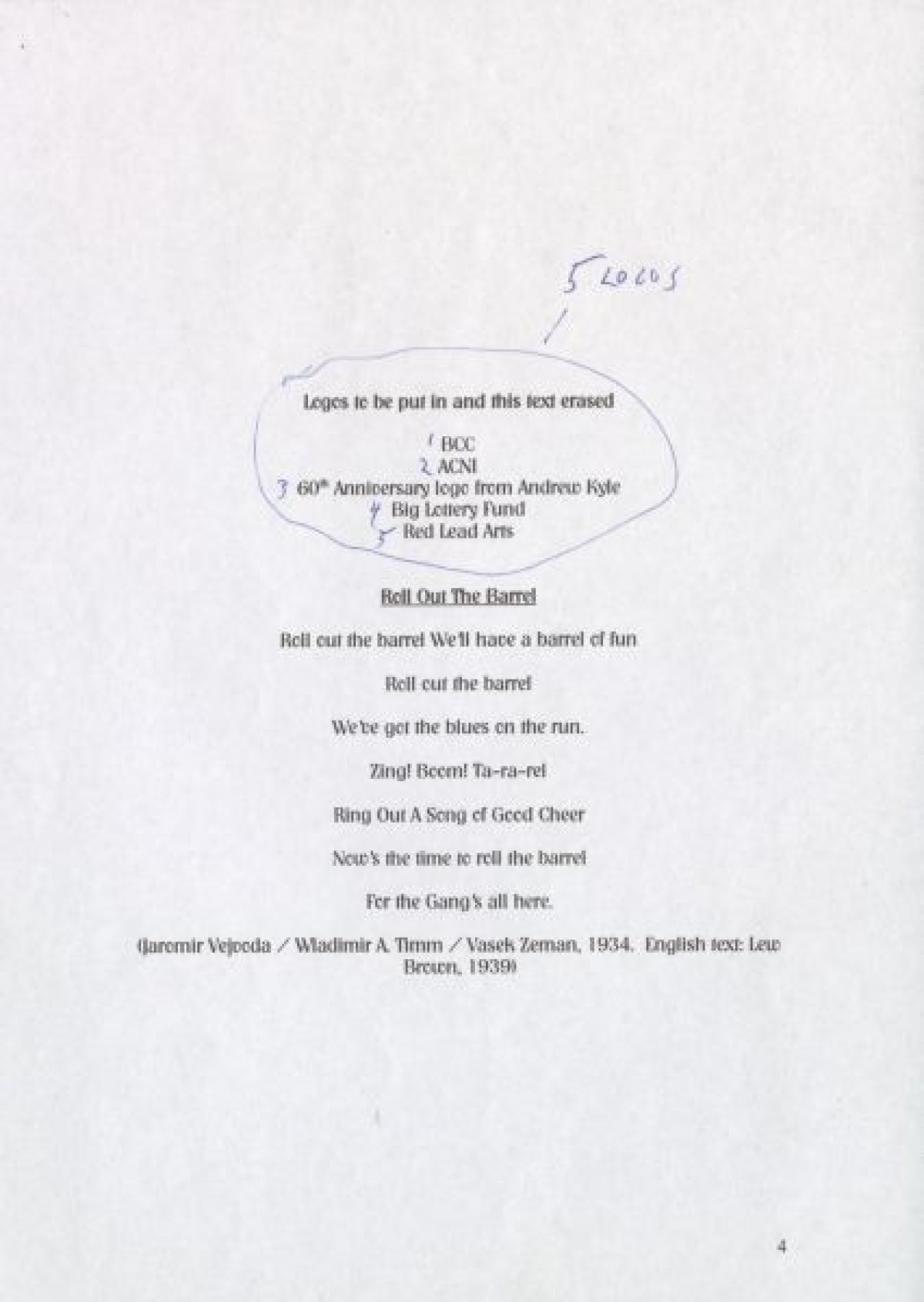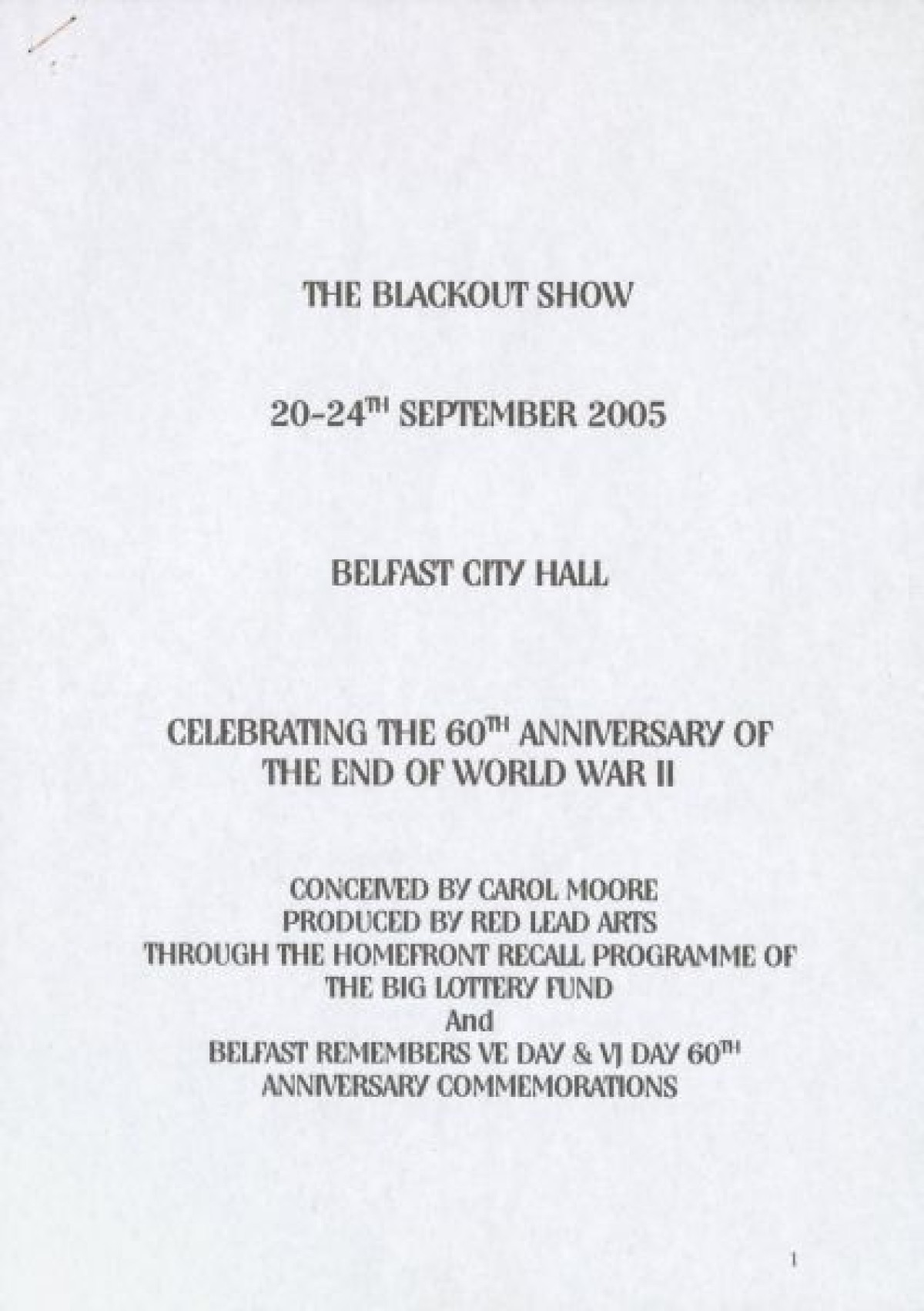 Printed draft of a programme for "The Blackout Show;" a play conceived by Carol Moore, and produced by Red Lead Arts to celebrate the 60th Anniversary of the end of World War II. Contains a list of production staff and sources, sponsors, songs with lyrics: "(We're Gonna Hang Out) The washing on the Siegfried Line" and "We'll Meet Again," and information about upcoming Red Lead Arts projects.