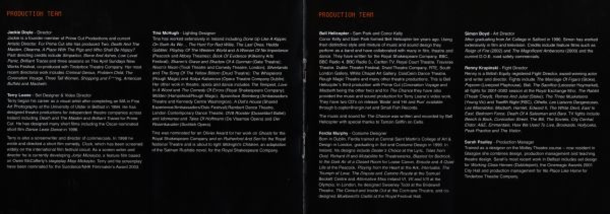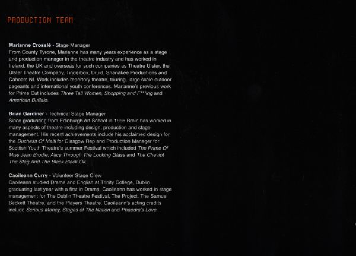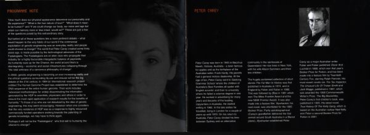 Prime Cut Productions. The booklet contains cast and production lists; biographical note about Peter Carey; cast and crew profiles with photographs; and a programme note introducing the concept of the play as a hypothetical story about genetic engineering.
