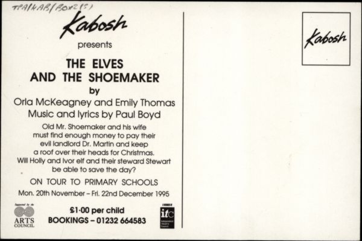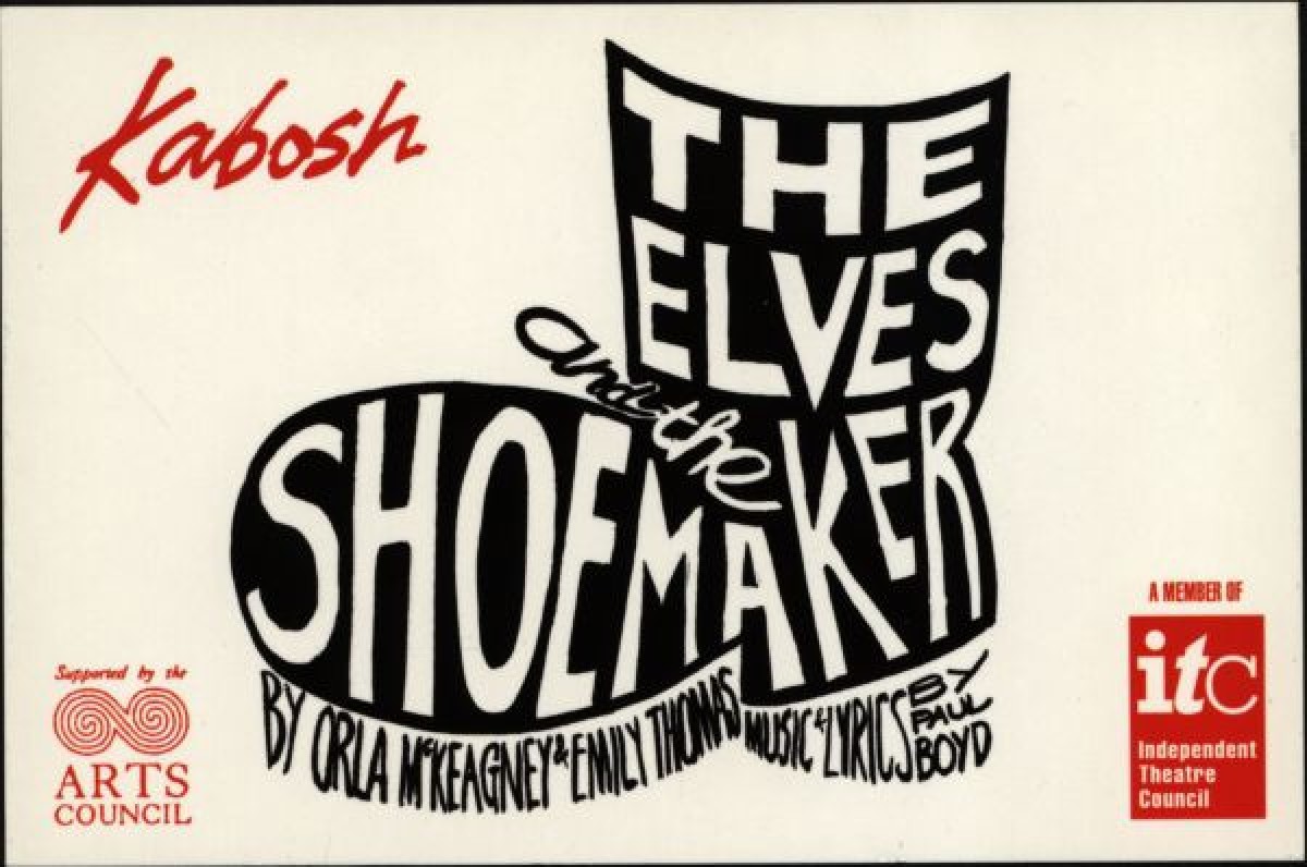 Promotional postcard for a production of 'The Elves and the Shoemaker,' written by Orla McKeagney and Emily Thomas, with music and lyrics by Paul Boyd. Produced by Kabosh Theatre Company.