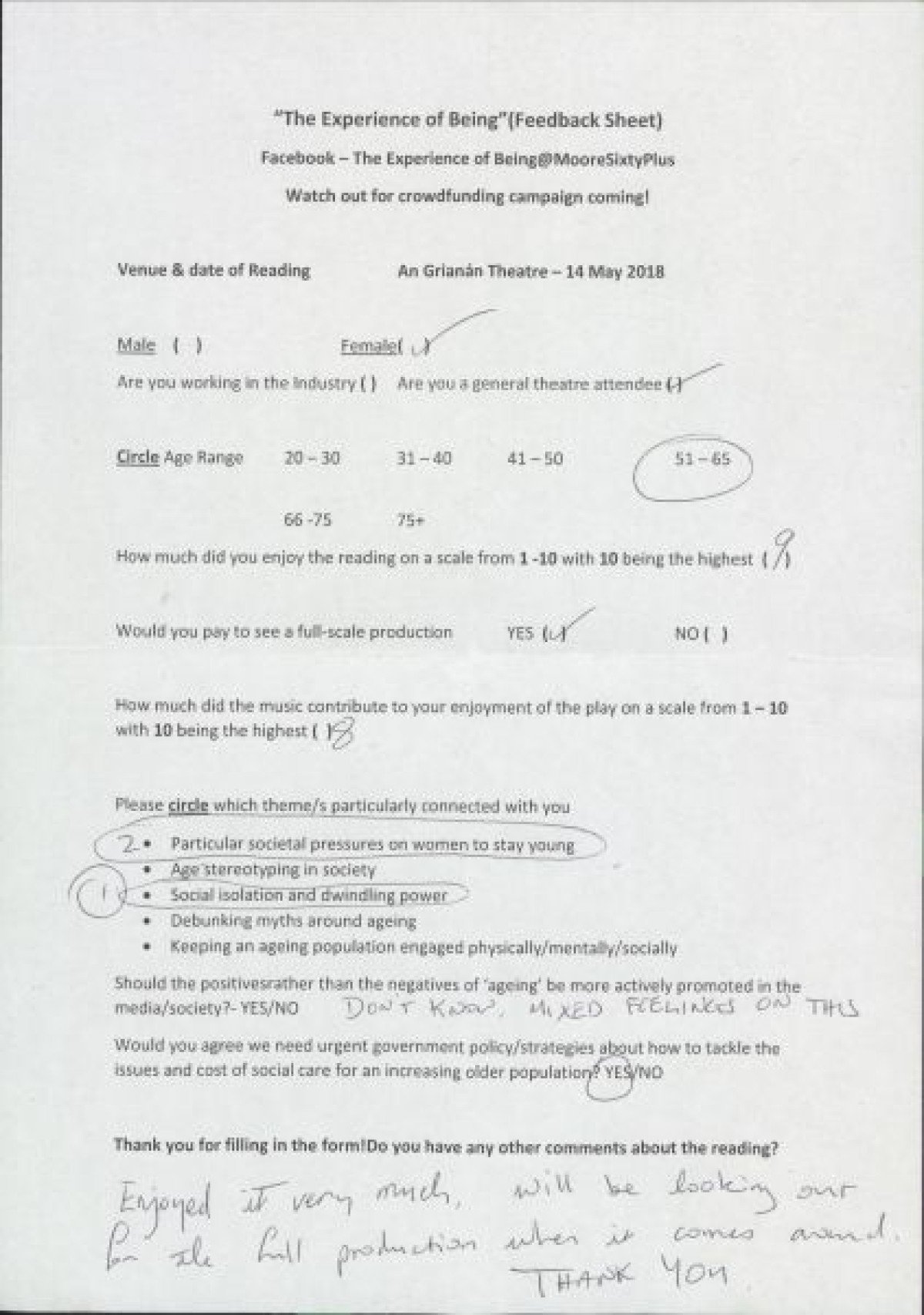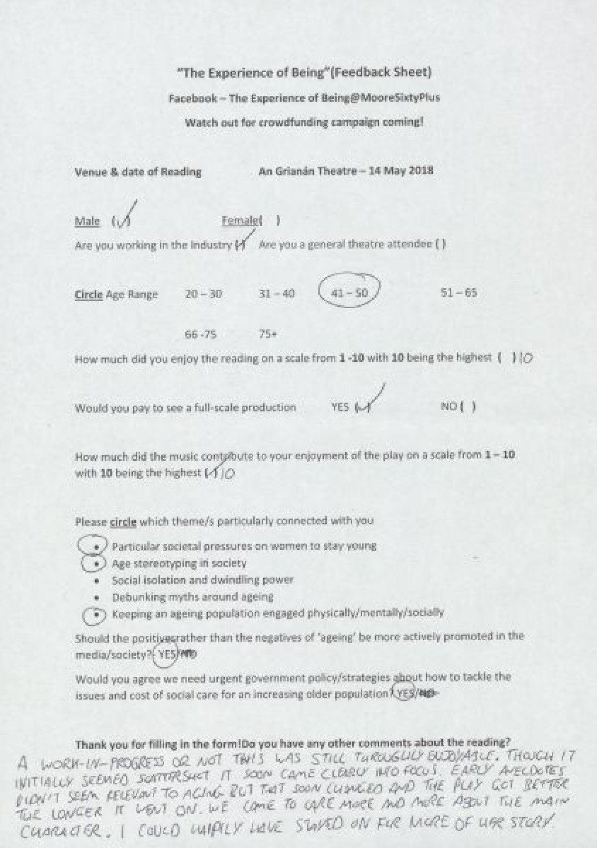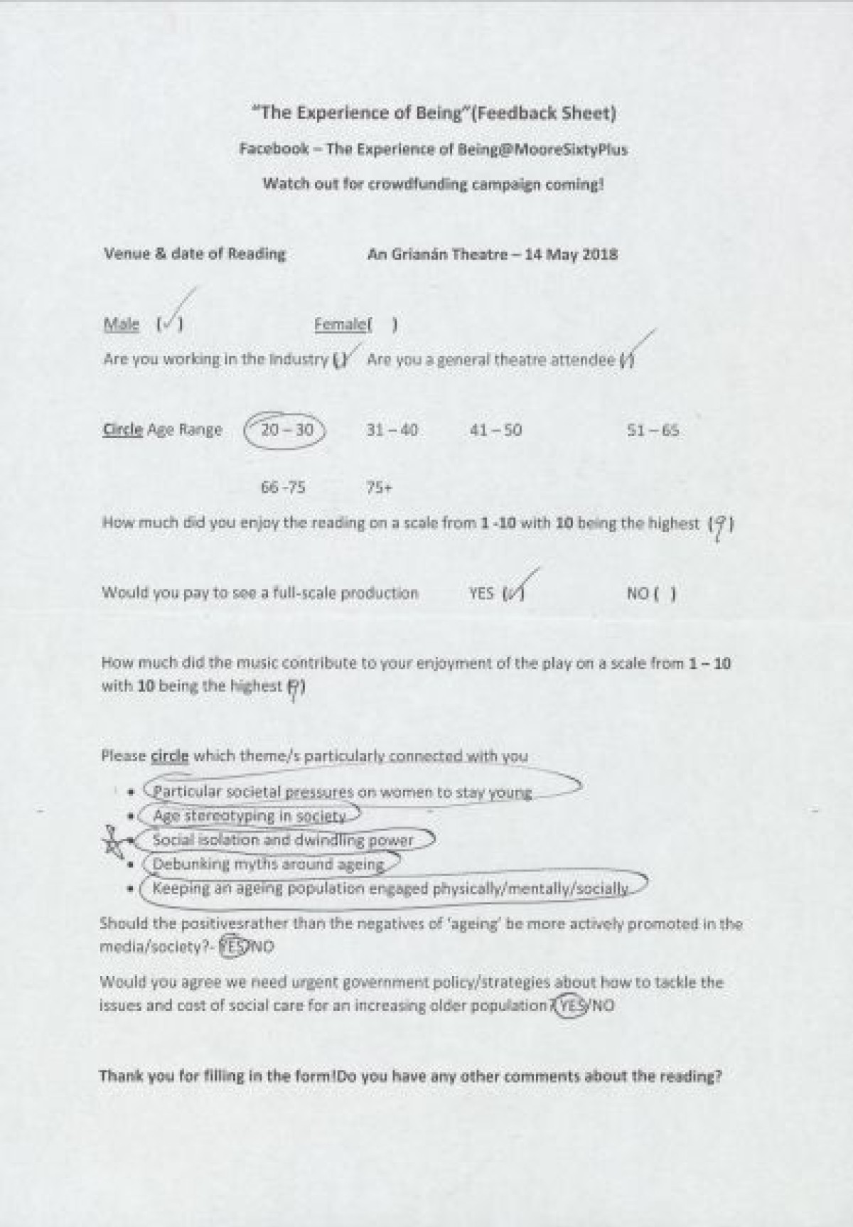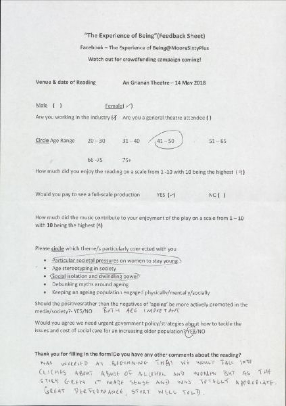 Completed feedback surveys from a sample showing of "The Experience of Being," at An GrianĂ¡n Theatre. Respondents indicated opinions on enjoyment of the show, themes that connected with them, opinions on government strategies relating to ageing, and handwritten comments.