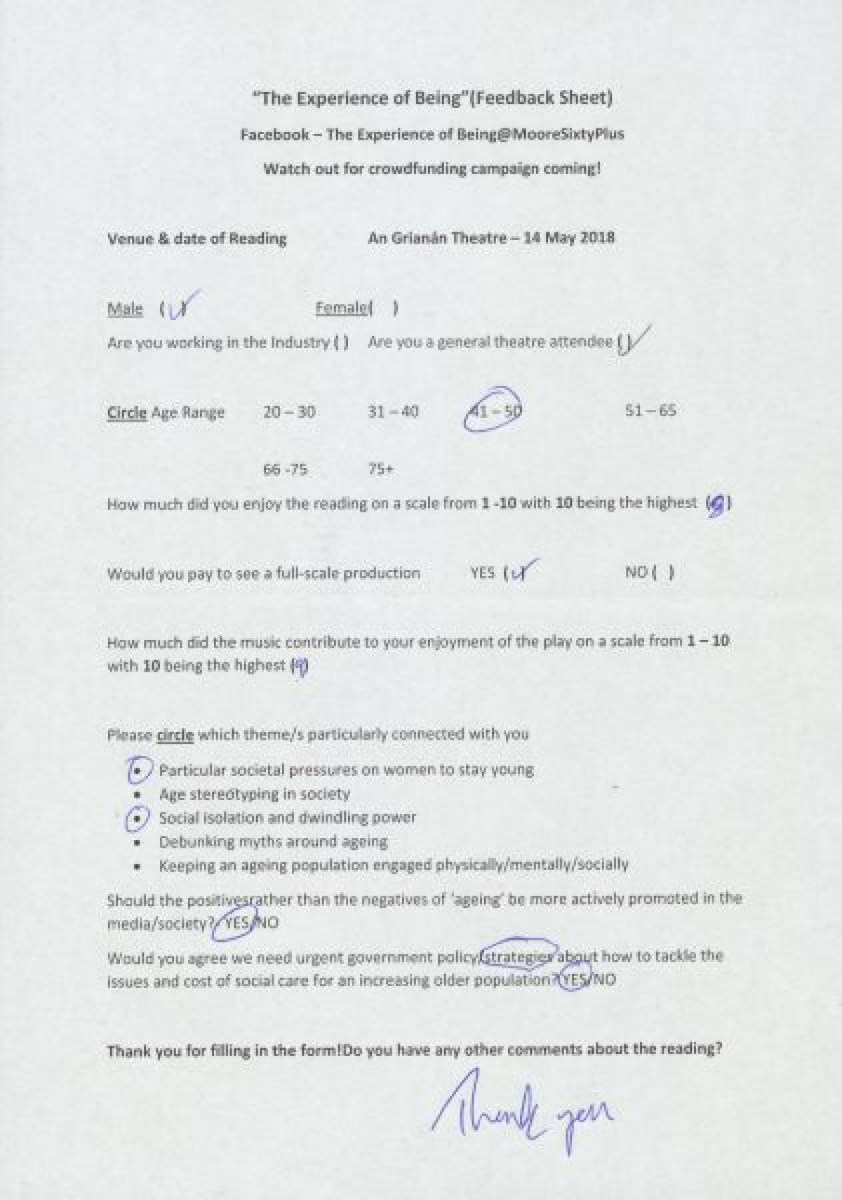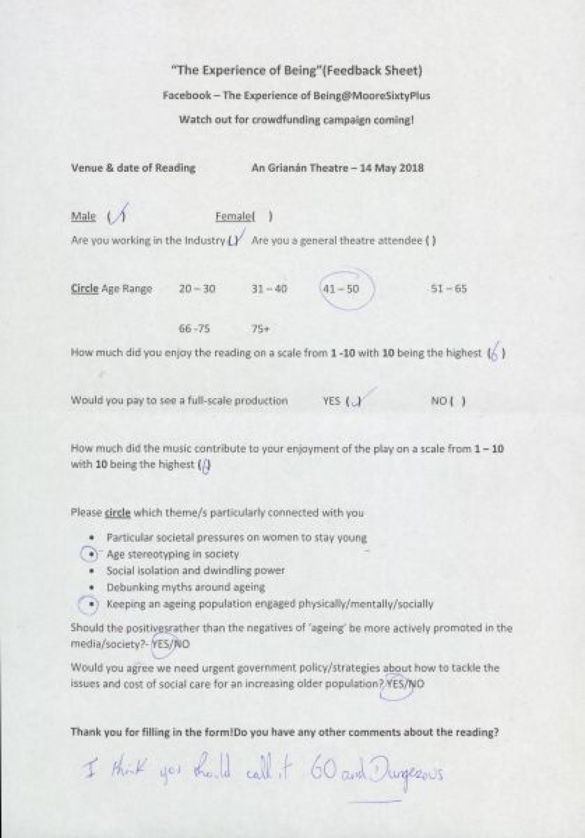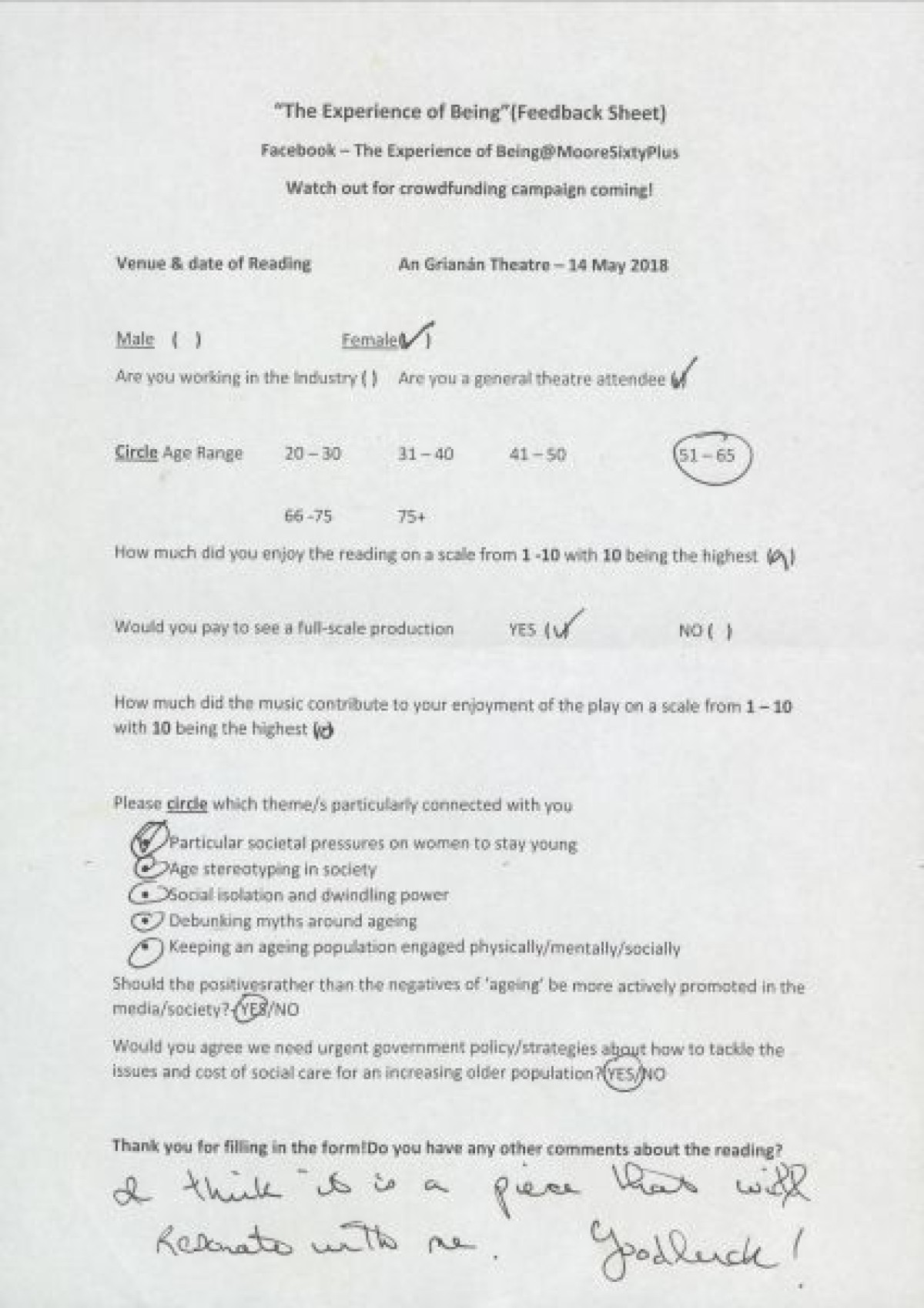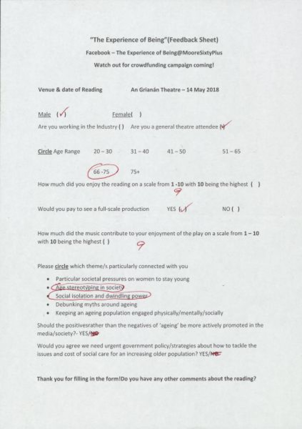 Completed feedback surveys from a sample showing of "The Experience of Being," at An GrianĂ¡n Theatre. Respondents indicated opinions on enjoyment of the show, themes that connected with them, opinions on government strategies relating to ageing, and handwritten comments.