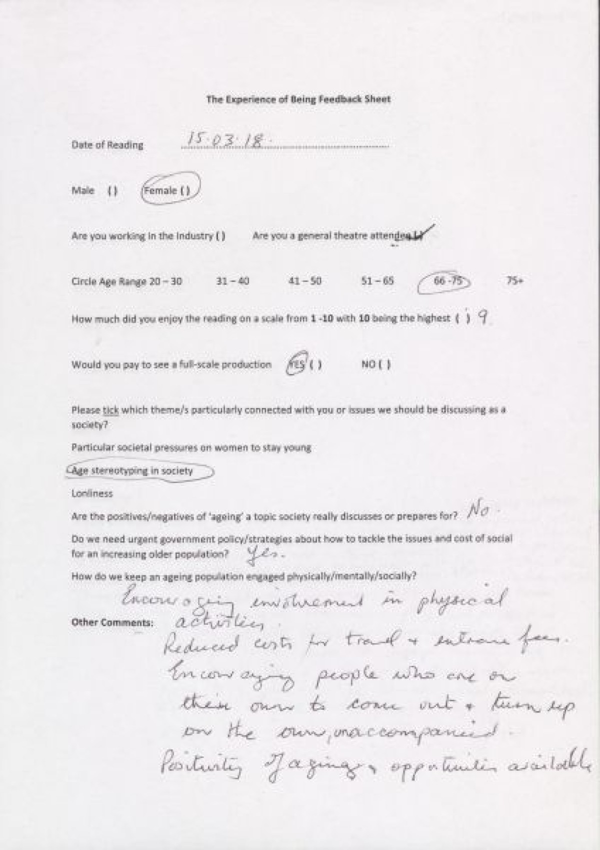 Feedback surveys completed by audiences at a performance of the self-written play "The Experience of Being" by Carol Moore. Handwritten feedback comments mention rural communities, physical activities, and social involvement of older people.