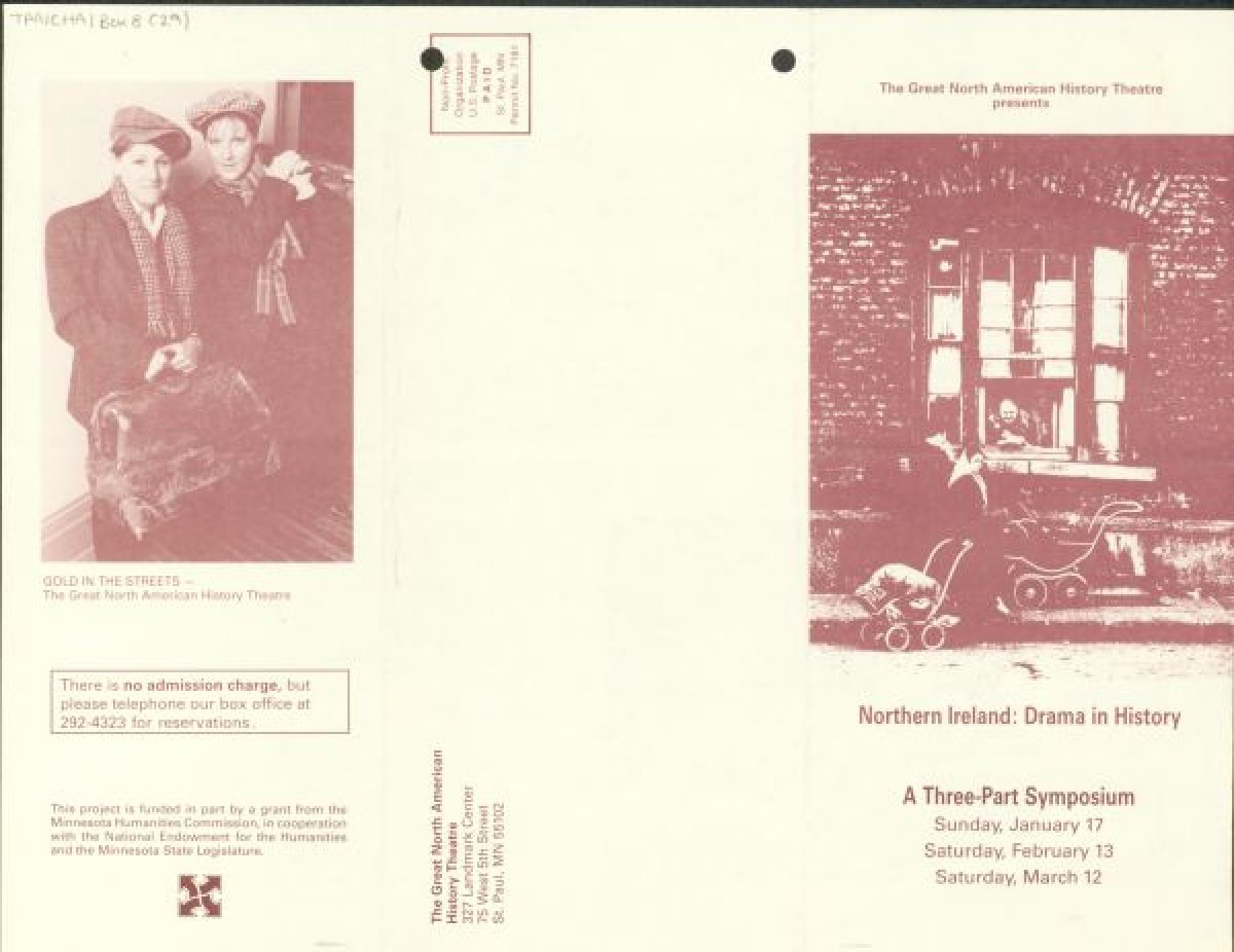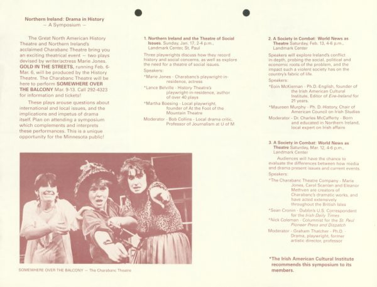 A 1988 leaflet for Charabanc Theatre Company's three part symposium at The Great North American History Theatre, titled 'Northern Ireland: Drama in History'. Includes performances of Marie Jones' play 'Gold in the Streets' and Charabanc's 'Somewhere Over The Balcony', as well as speaking events on theatre and its link with history and social concerns in Northern Ireland.