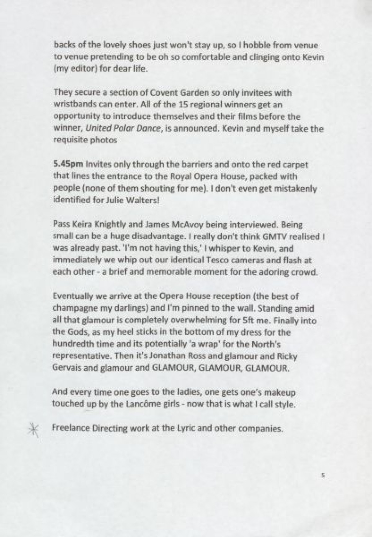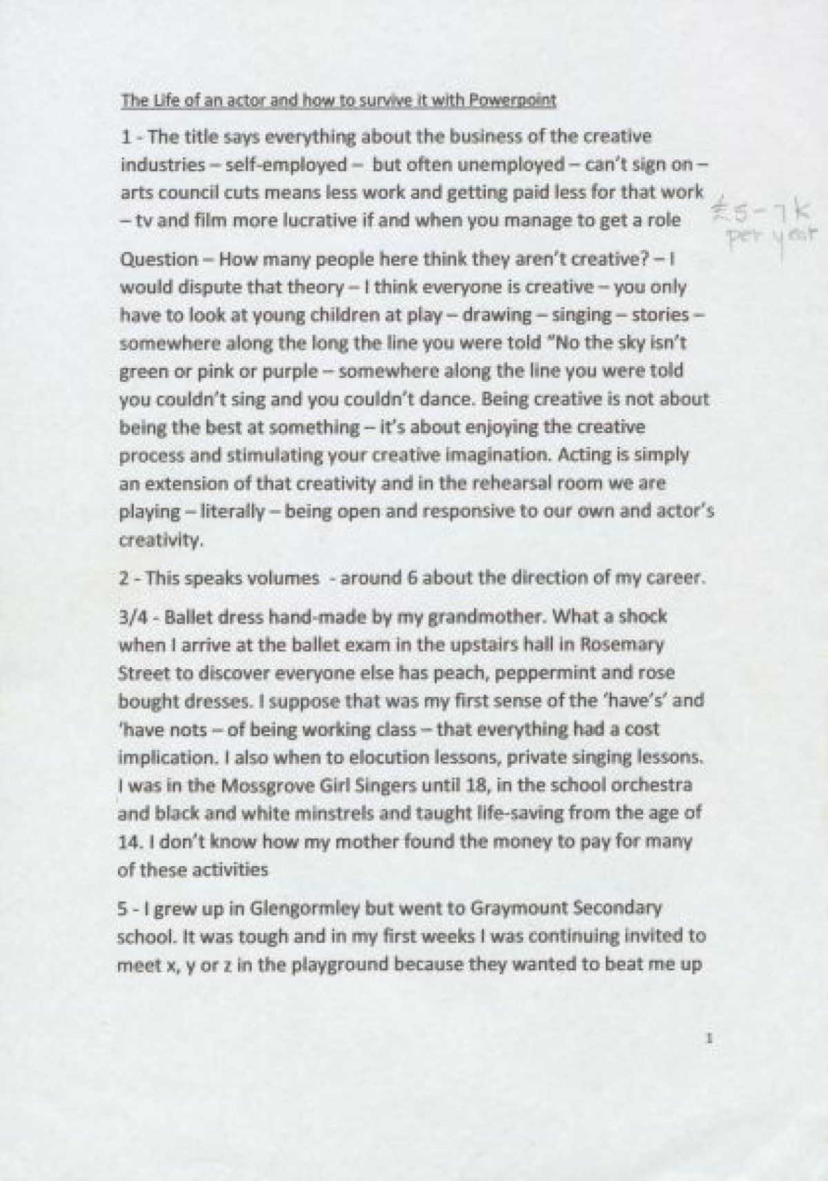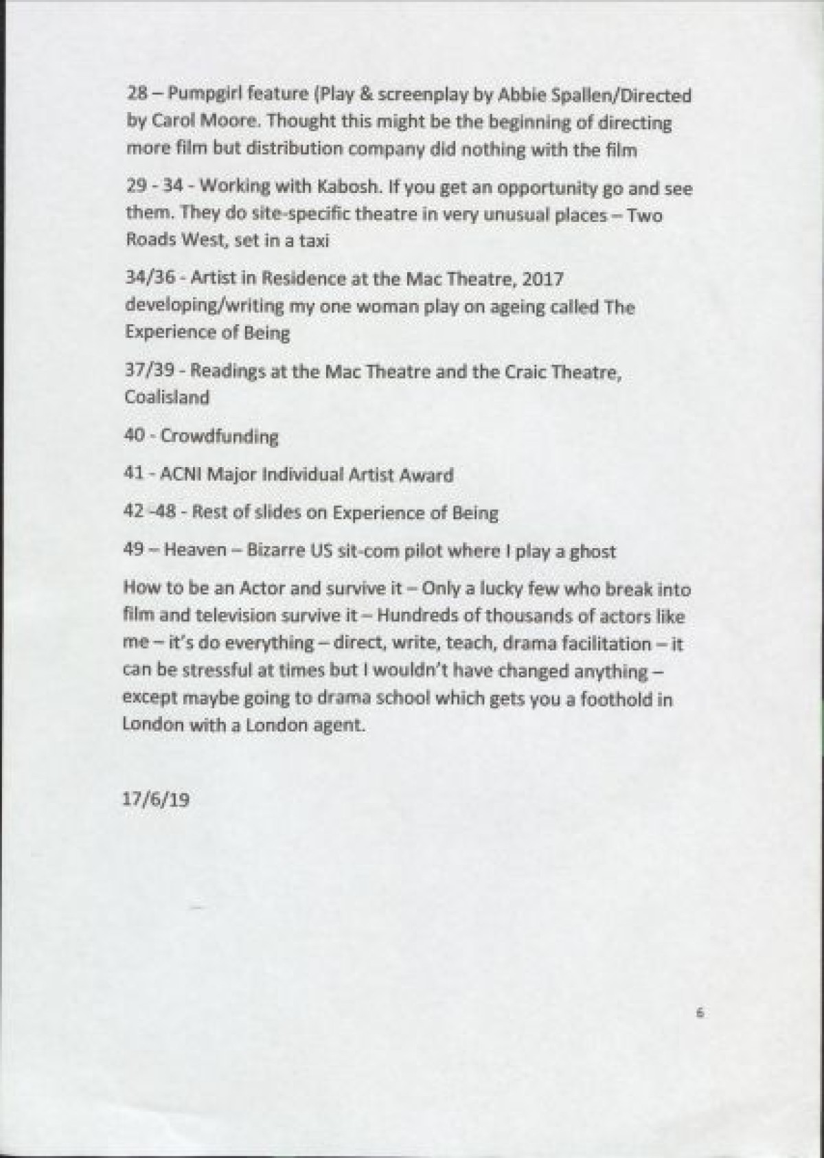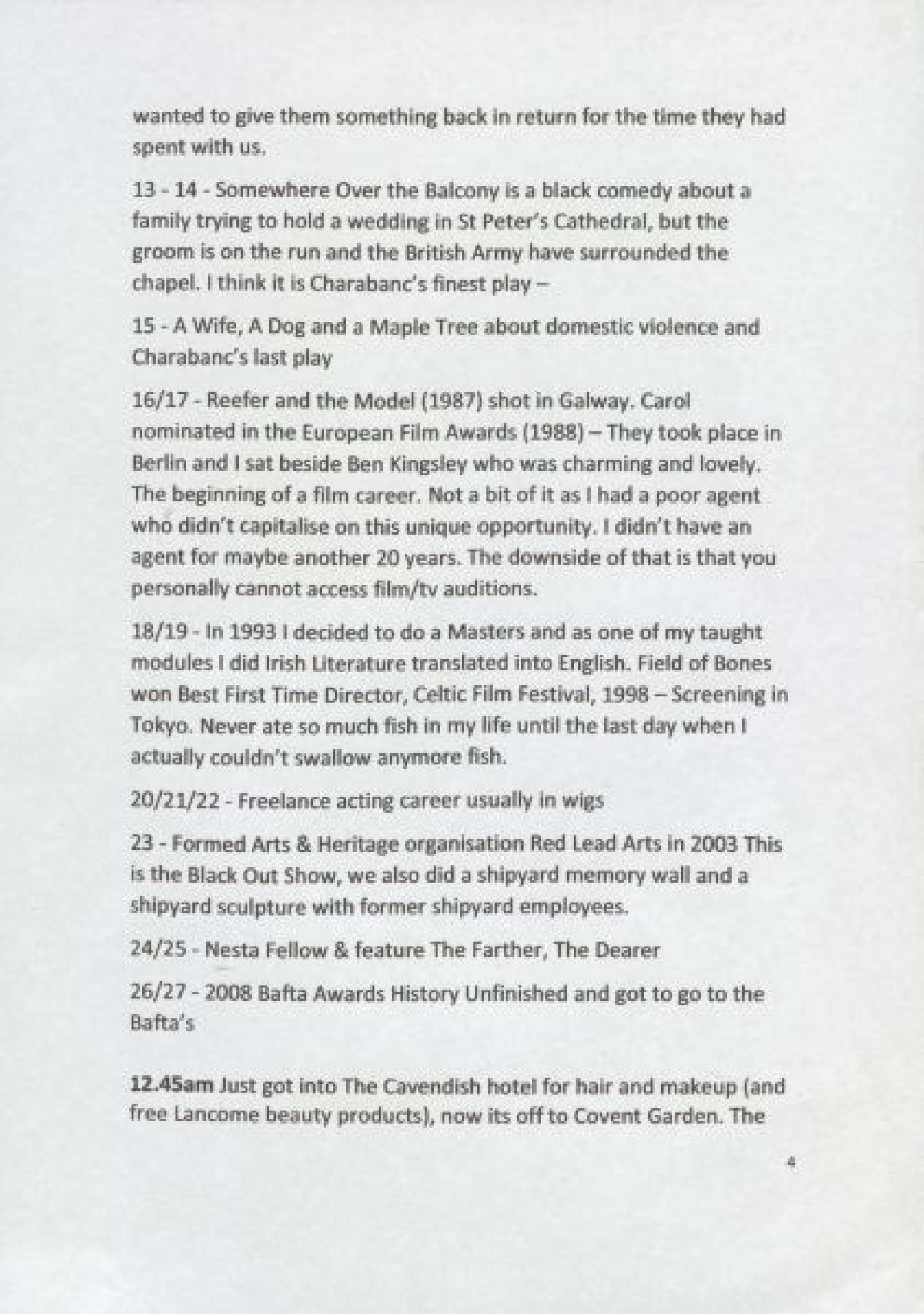 Script for a Powerpoint presentation delivered by Carol Moore about her experiences and advice for living as an actor. The presentation contains advice about self-employment, and an overview of Carol Moore's career progression including: the launch of the Charabanc theatre group with with "Lay Up Your Ends" at the