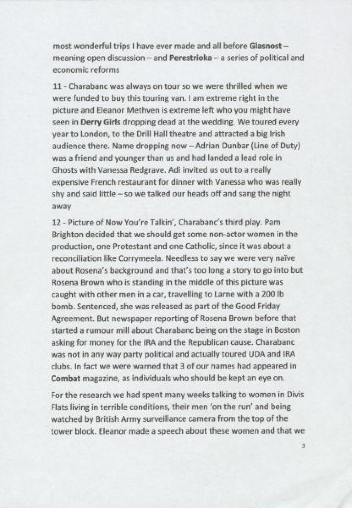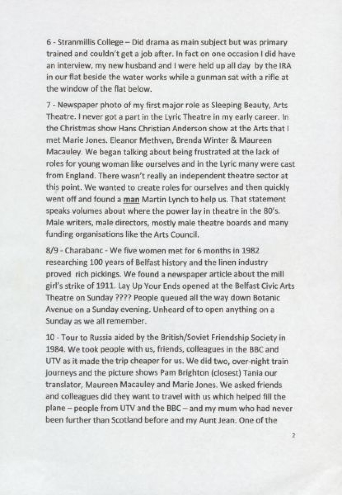 Belfast Civic Arts Theatre in 1982; a tour to Russia in 1984 aided by the British/Soviet Friendship Society; researching "Now You're Talkin'" at Divis Flats; the formation of the Arts & Heritage organisation