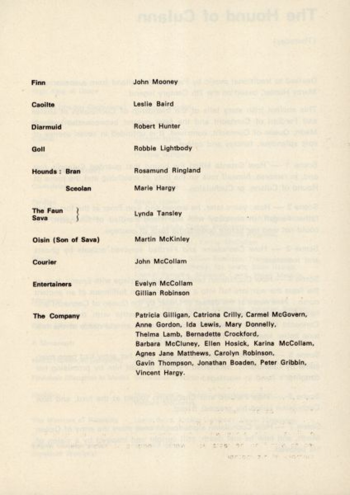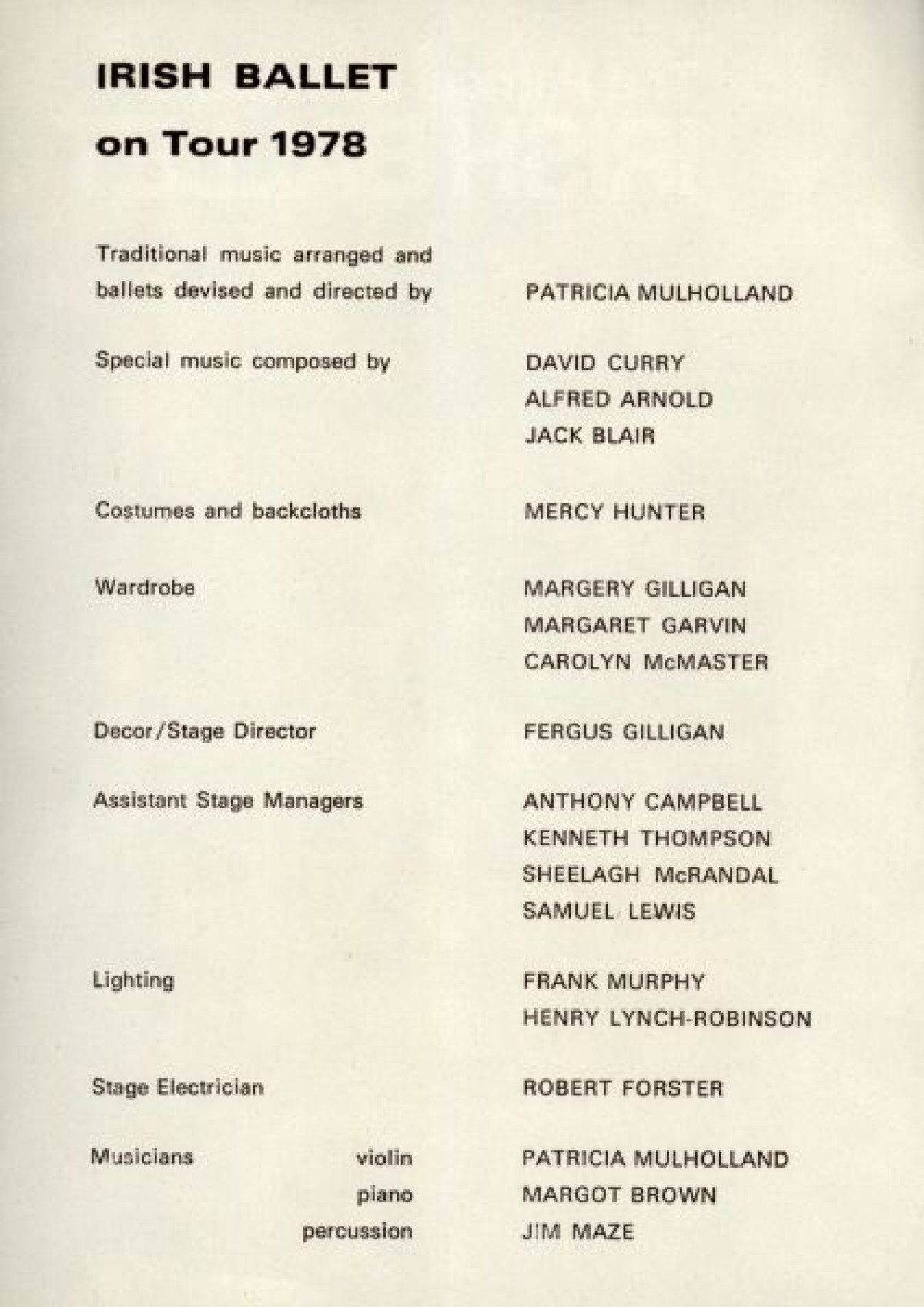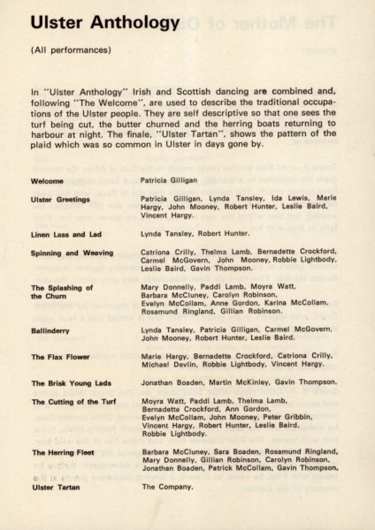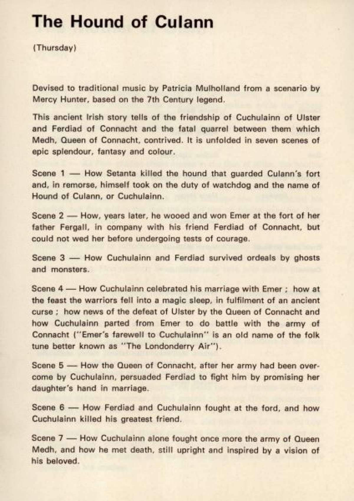 Programme for The Patricia Mullholland Irish Ballet, at the Arts Theatre, Belfast. Contains a list of production staff, and synopses for performances based on traditional Irish folklore and myths, including: