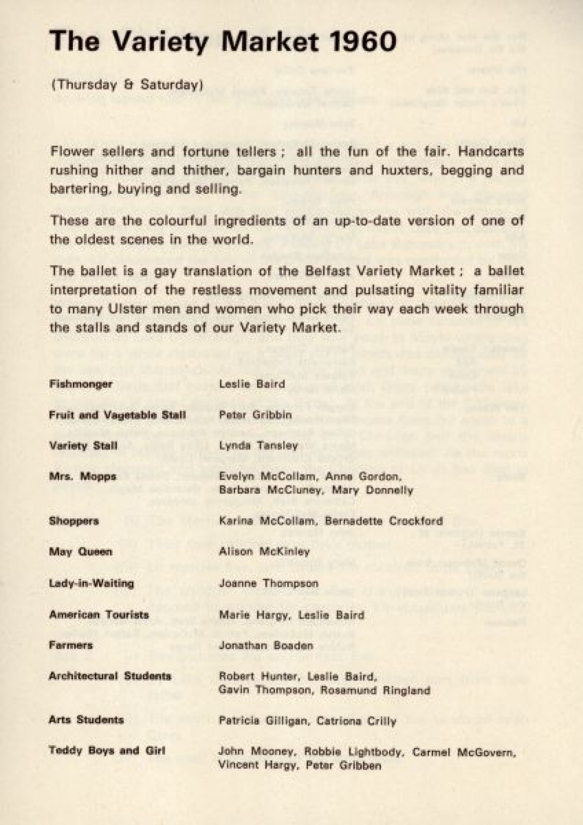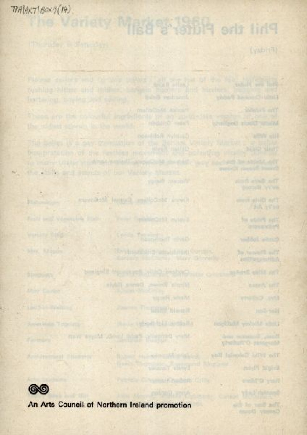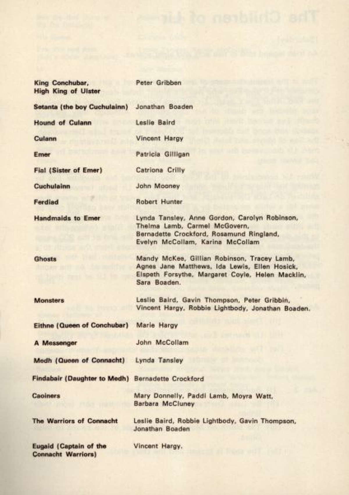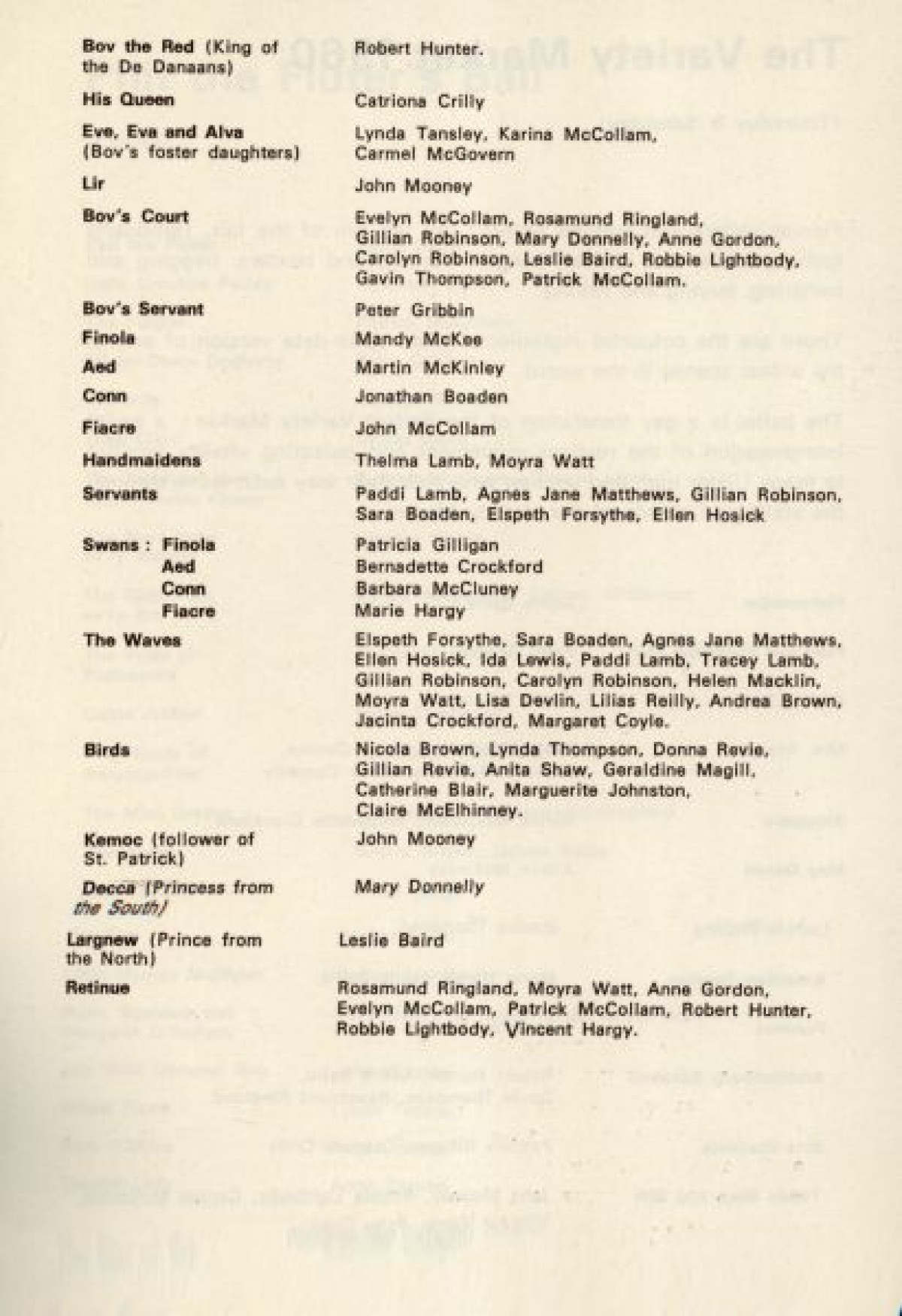 Programme for The Patricia Mullholland Irish Ballet, at the Arts Theatre, Belfast. Contains a list of production staff, and synopses for performances based on traditional Irish folklore and myths, including:
