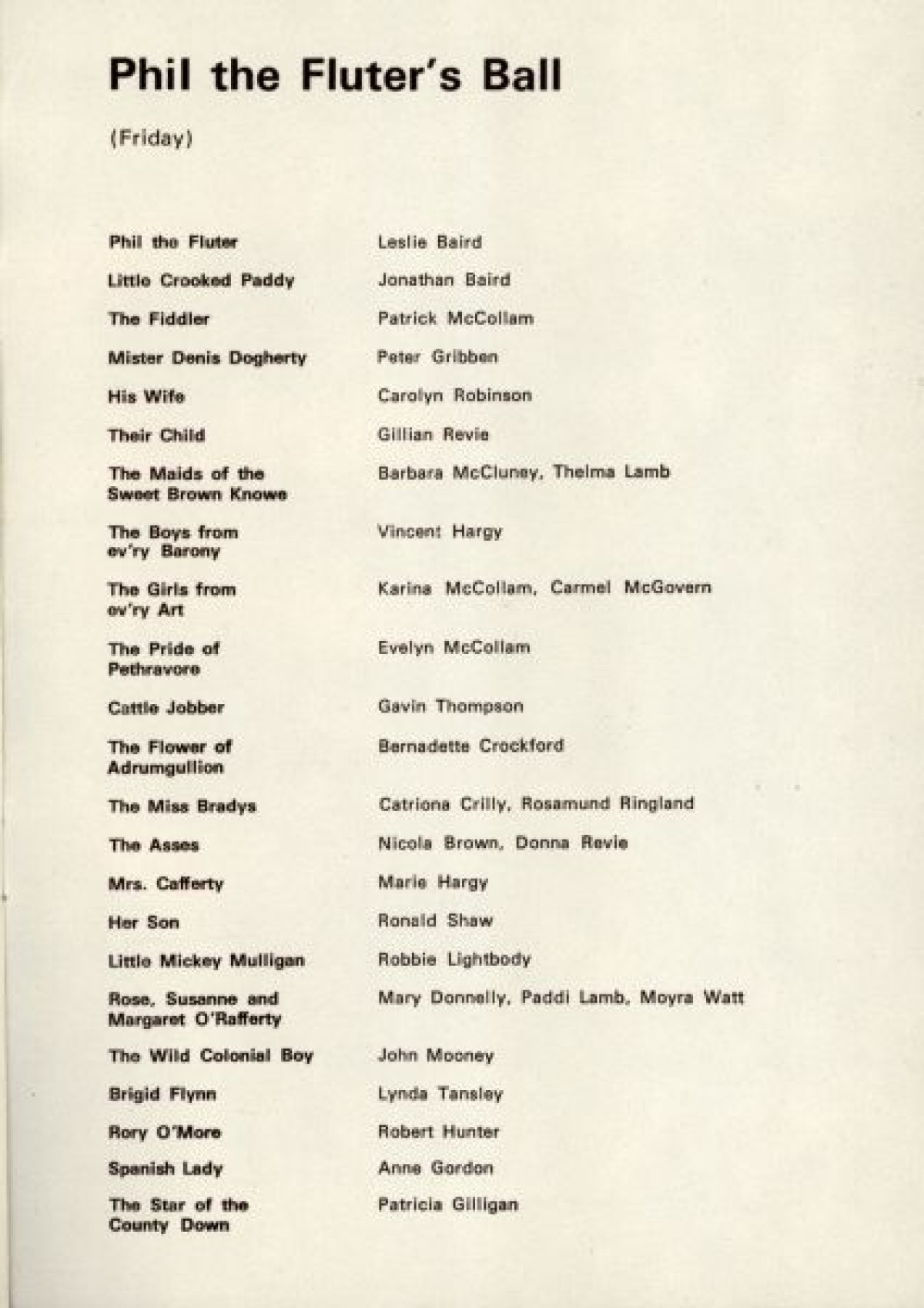 Phil the Fluter's Ball. Includes a breakdown of motifs alongside names of dancers.