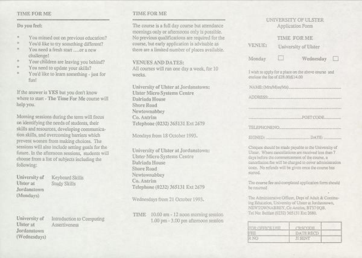 Promotional pamphlet for a women's education course, titled "Time for Me - A Course for Women," organised by Pauline Murphy. Contains a descriptive outline of morning and afternoon sessions, with details of courses, venues and dates. Includes an application form and information about course tutors, and an open day at the University of Ulster, in Jordanstown.