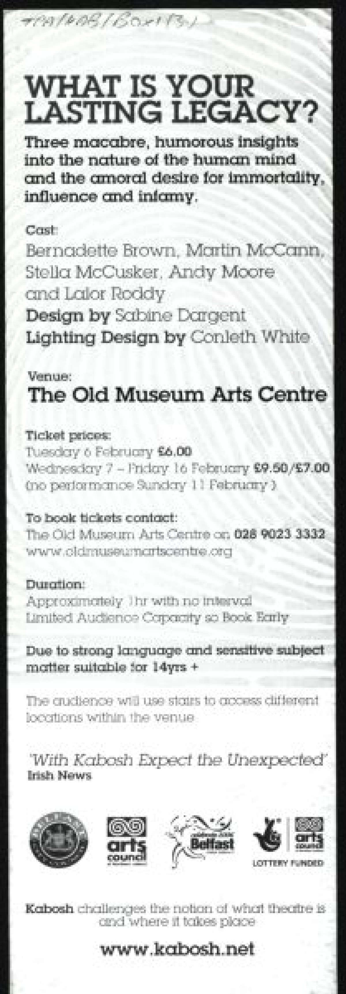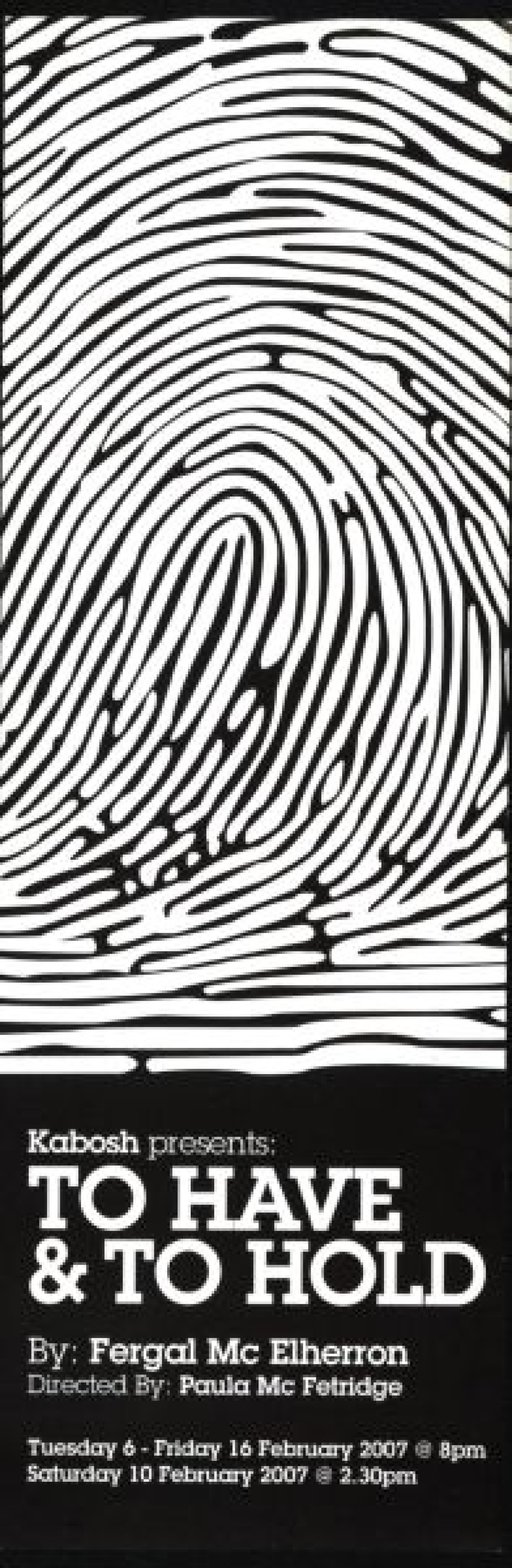 Black and white flyer for Kabosh theatre production, 'To Have & To Hold,' a dark comedy written by Fergal McElherron and directed by Paula McFetridge. Performed at the
