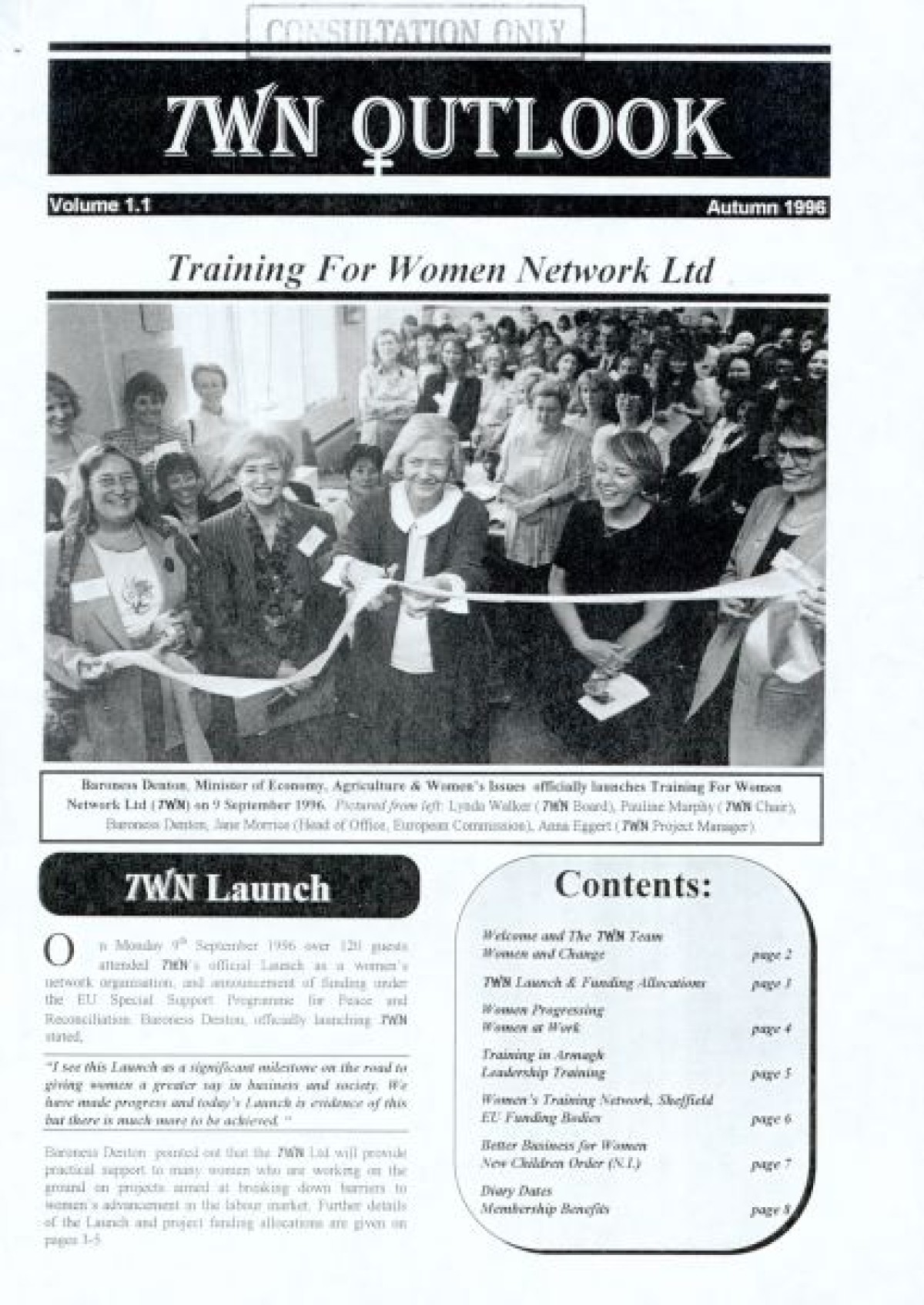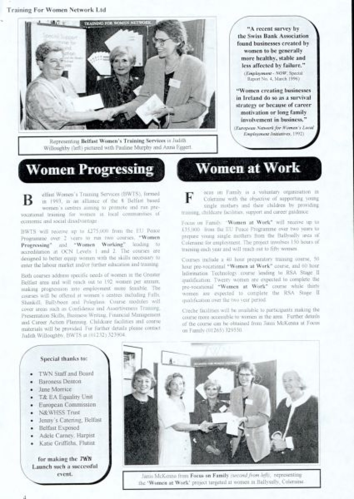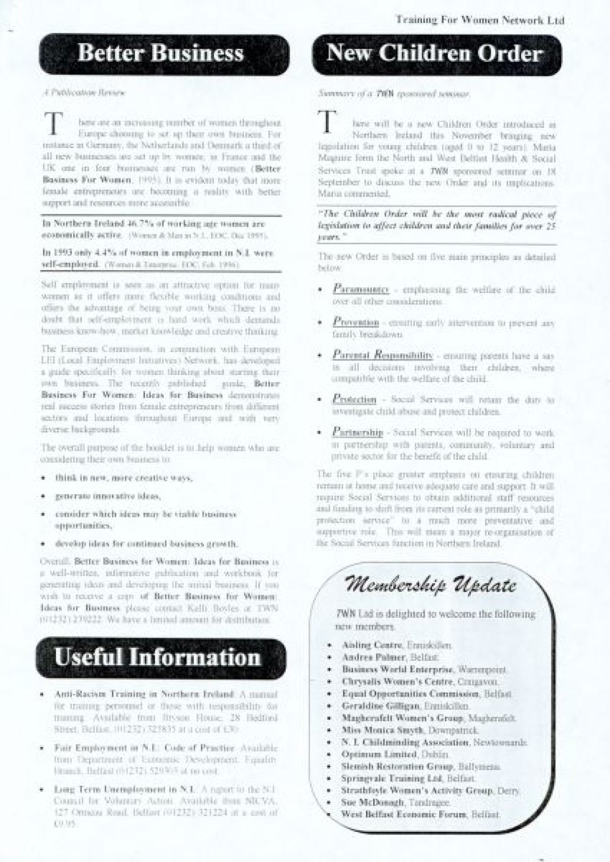 Training for Women Network Ltd. Contents include: Women and Change; TWN Launch and Funding Allocations; Women Progressing; Women at Work; Training in Armagh; Leadership Training; Women's Training Network (Sheffield); EU Funding Bodies; Better Business for Women; New Children Order (Northern Ireland); Diary dates, and Membership Benefits.
