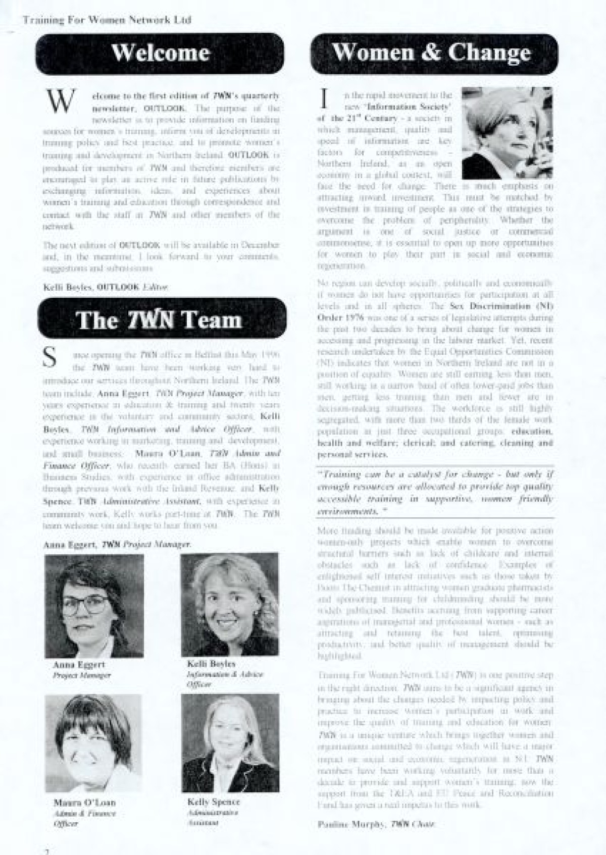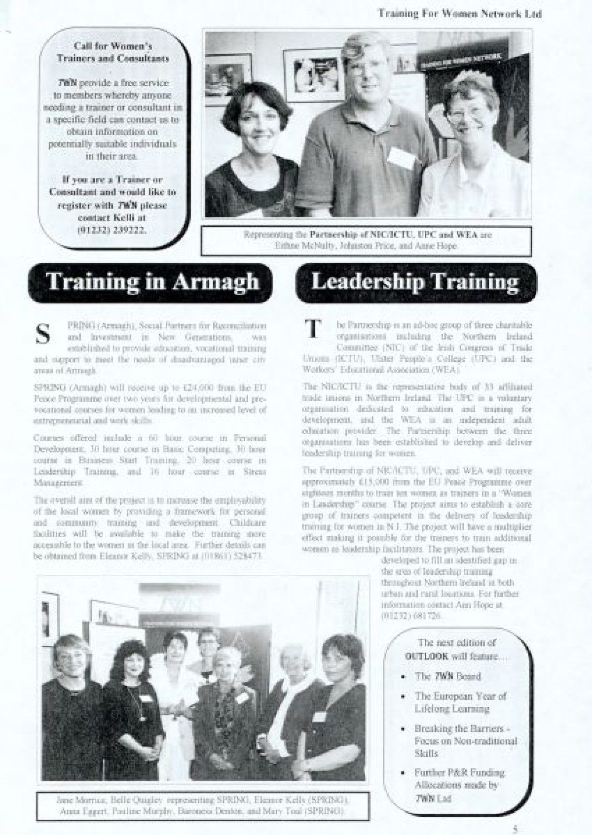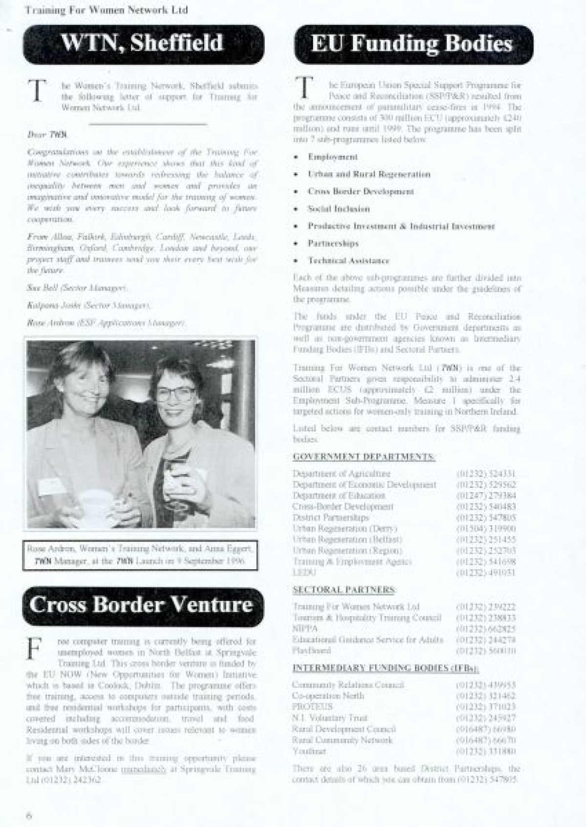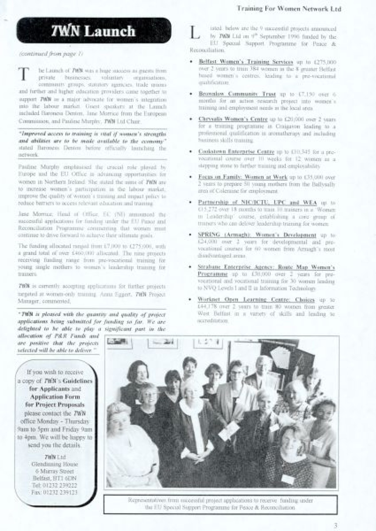 Training for Women Network Ltd. Contents include: Women and Change; TWN Launch and Funding Allocations; Women Progressing; Women at Work; Training in Armagh; Leadership Training; Women's Training Network (Sheffield); EU Funding Bodies; Better Business for Women; New Children Order (Northern Ireland); Diary dates, and Membership Benefits.