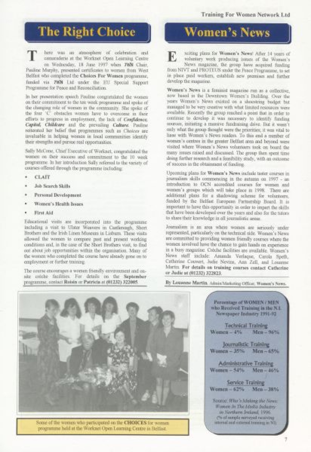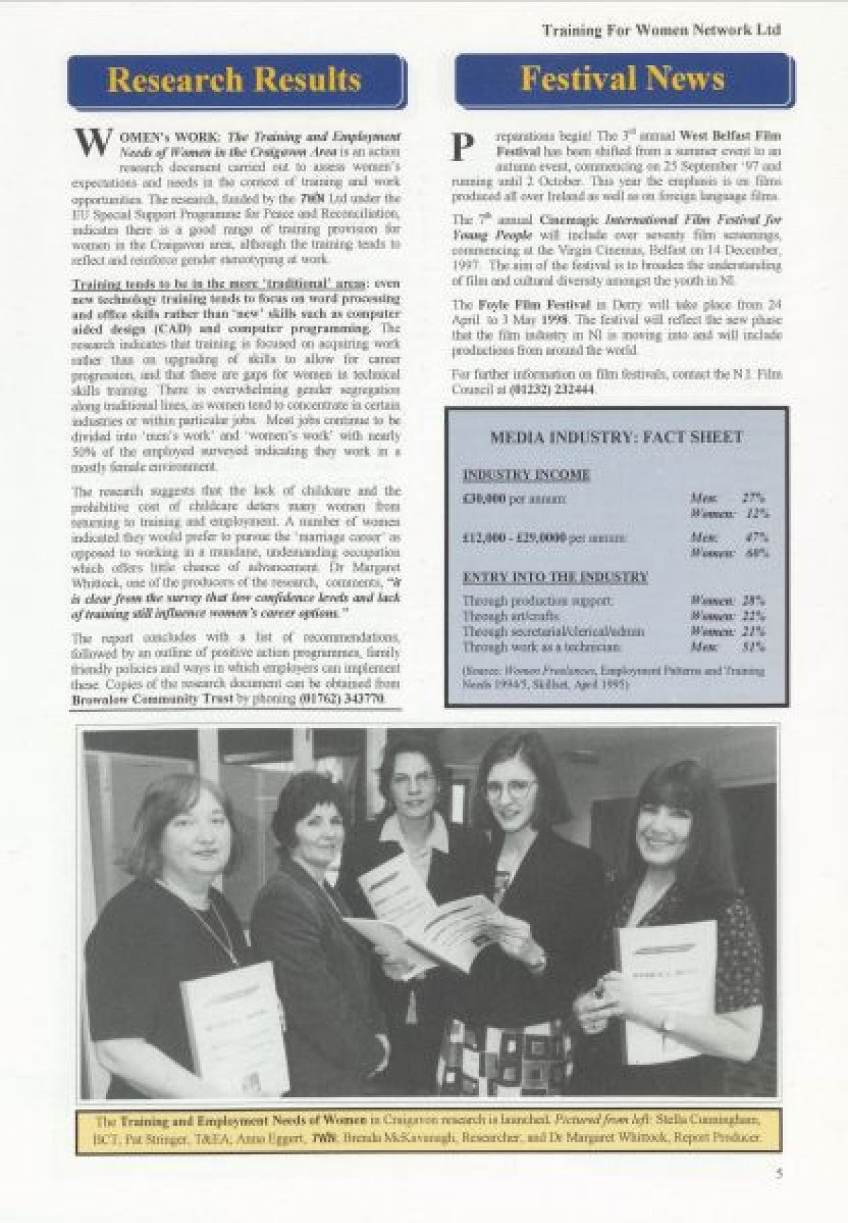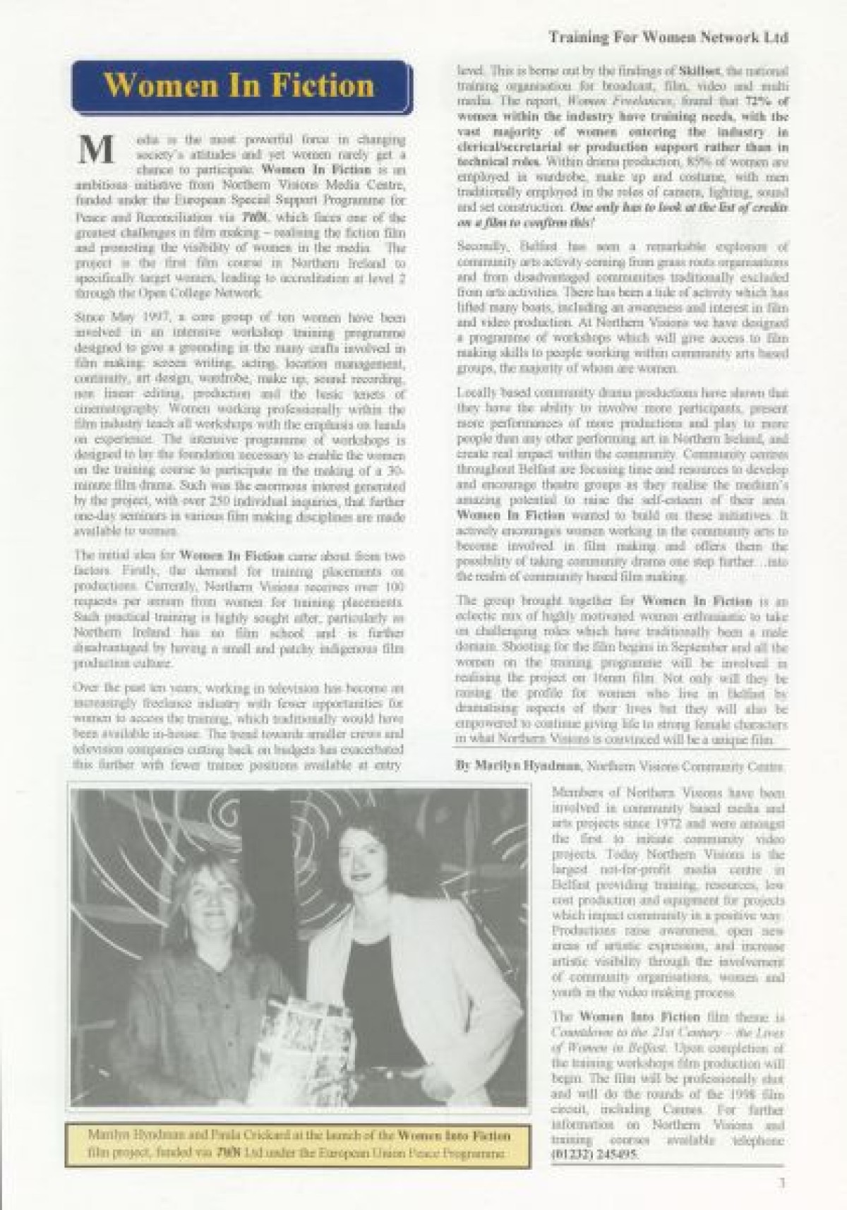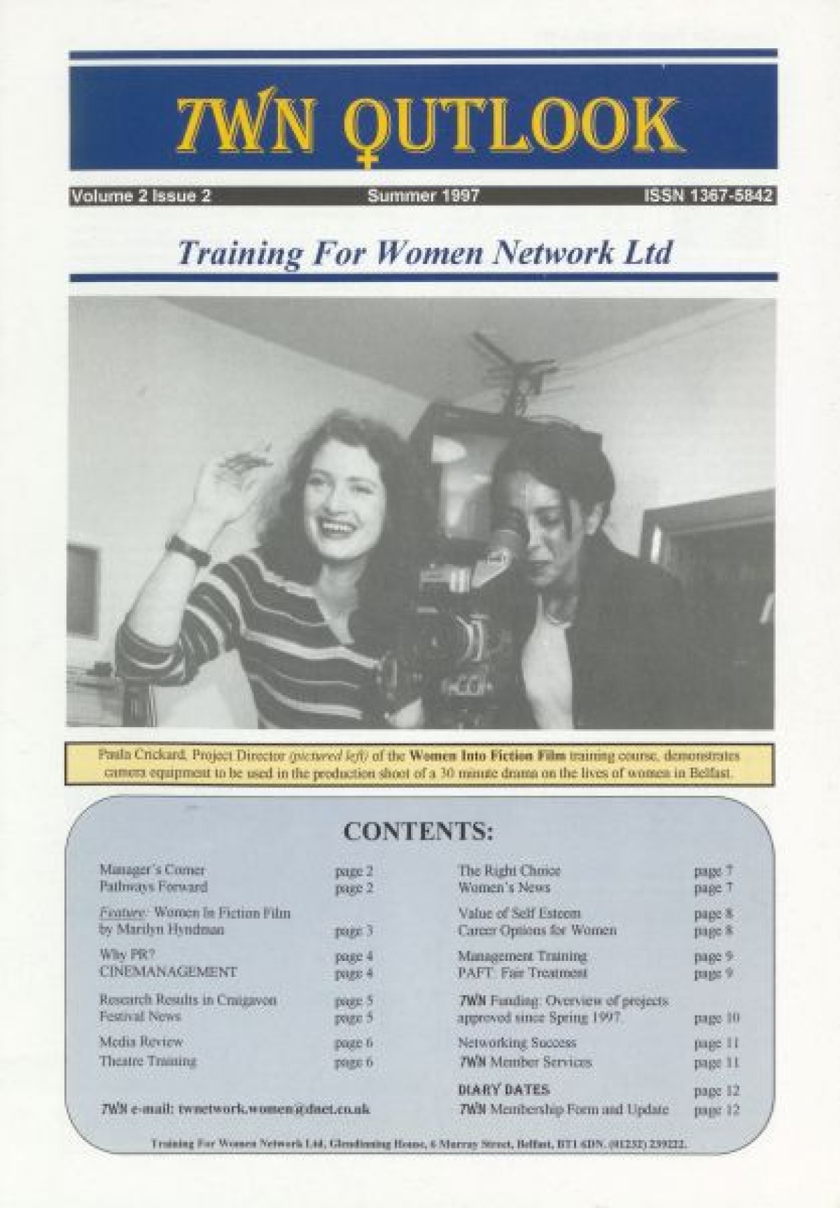 Training for Women Network Ltd. Contents include: "Women in Fiction Film" by Marilyn Hyndman; Why PR?; Cinemanagement; Research results in Craigavon; Festival News; Media Review; Theatre Training; The Right Choice; Women's News; Value of Self Esteem; Career Options for Women; Management Training; PAFT: Fair Treatment; Funding: Overview of Projects approved since Spring 1997; Networking Success; and TWN Membership Services.