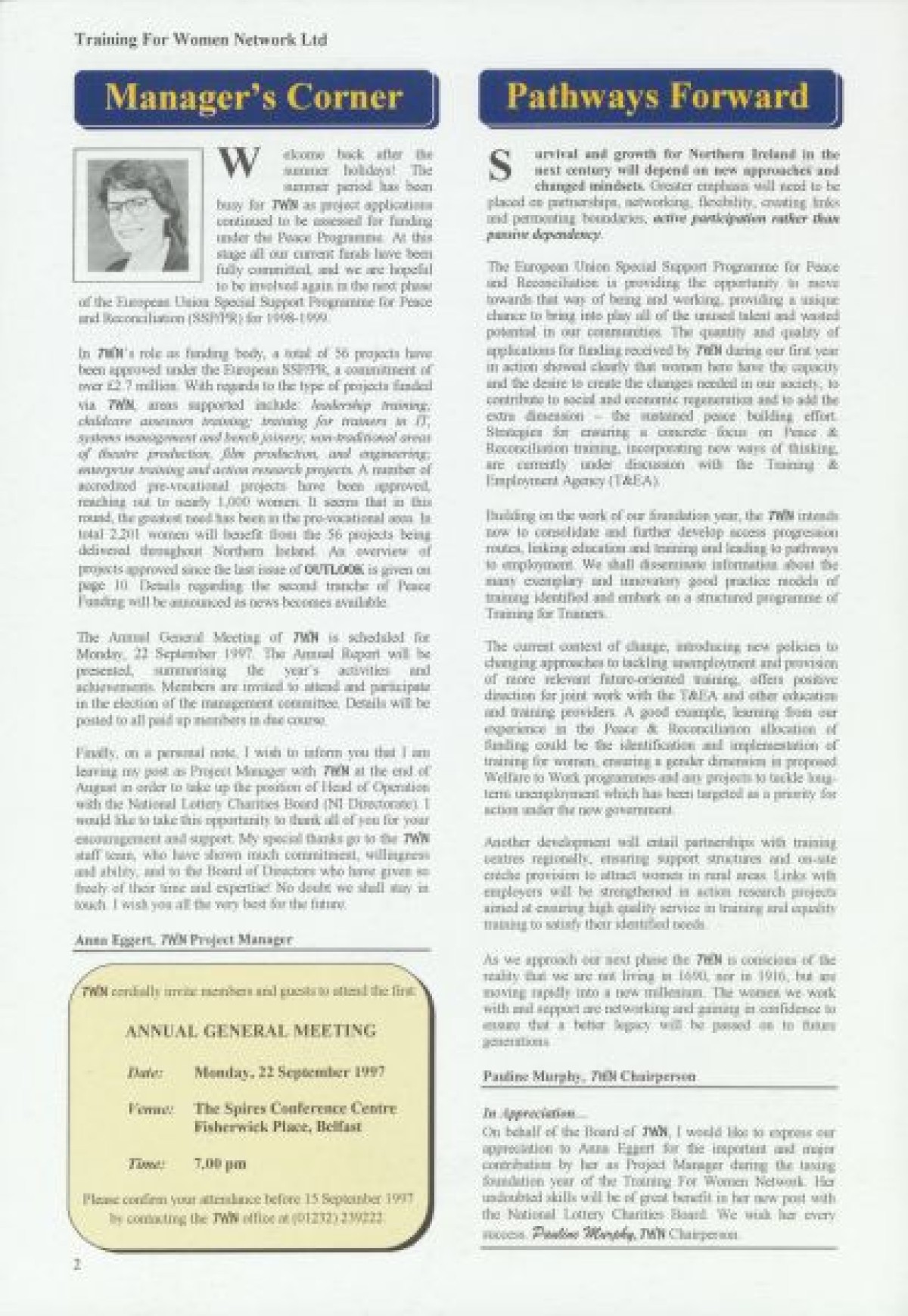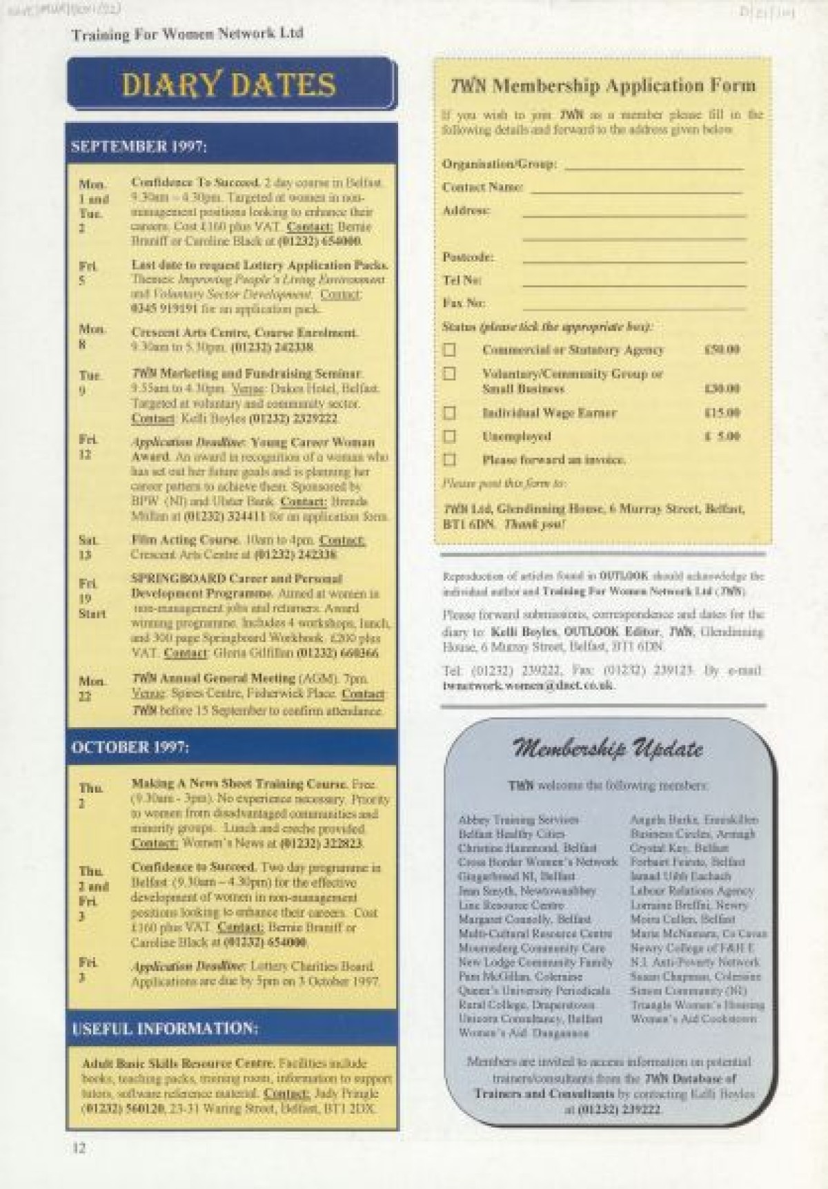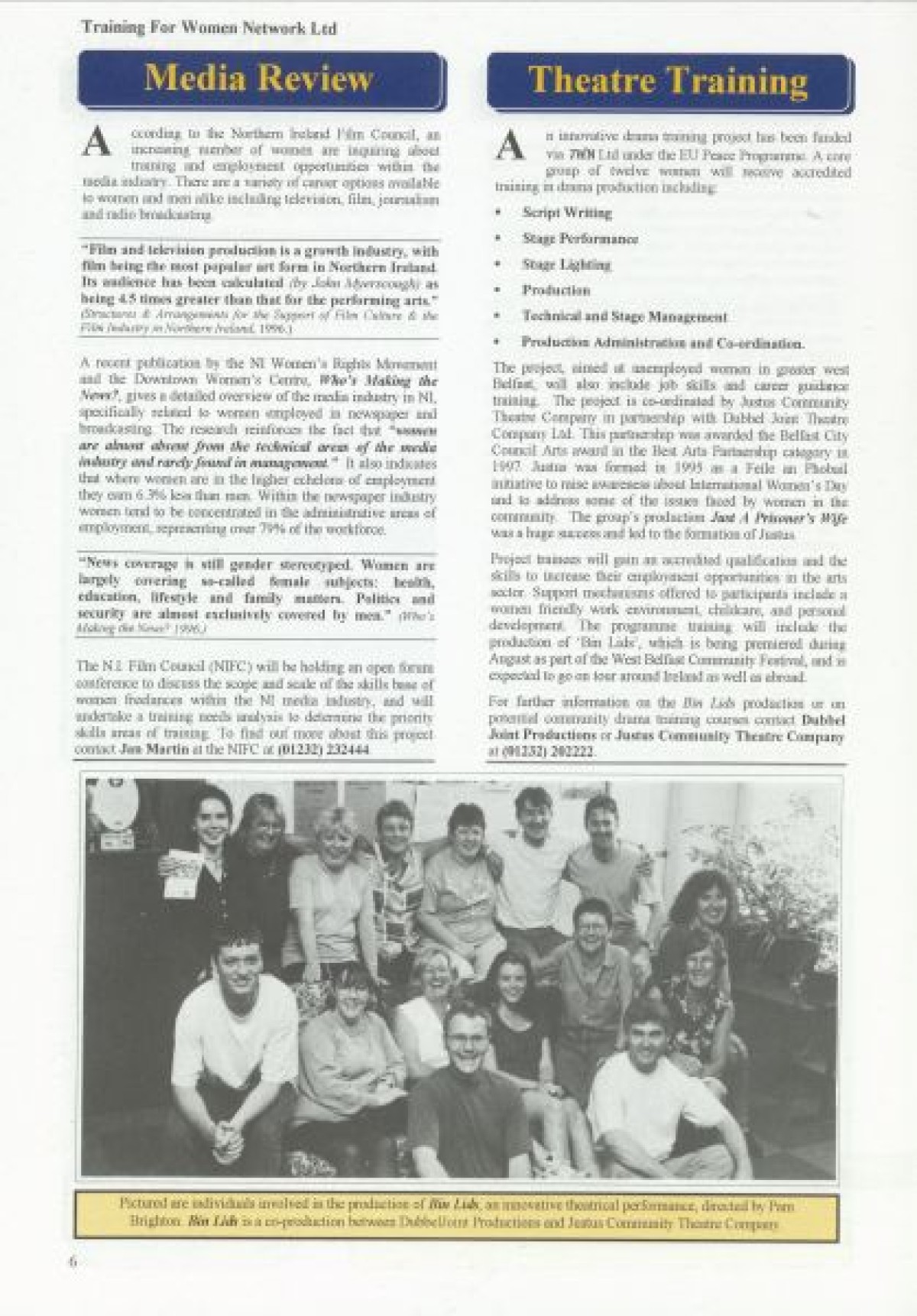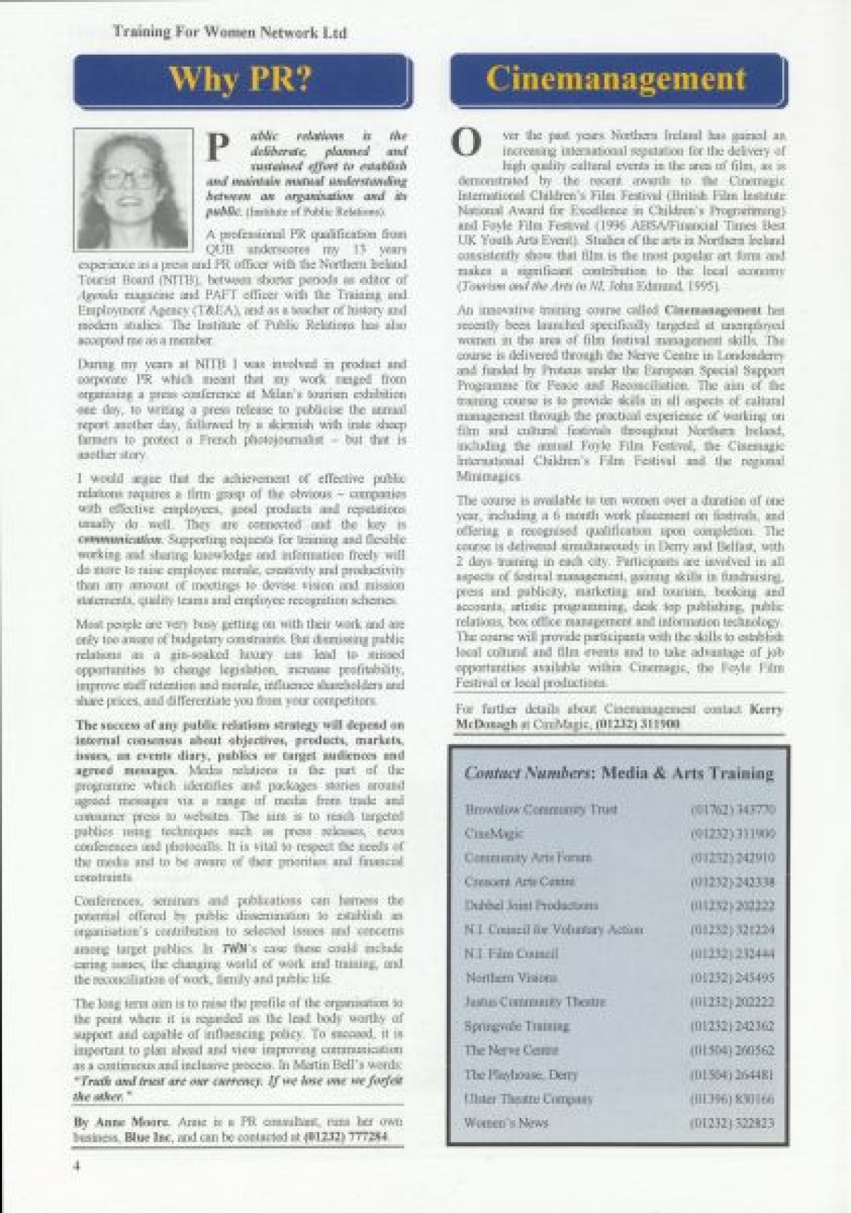 Training for Women Network Ltd. Contents include: "Women in Fiction Film" by Marilyn Hyndman; Why PR?; Cinemanagement; Research results in Craigavon; Festival News; Media Review; Theatre Training; The Right Choice; Women's News; Value of Self Esteem; Career Options for Women; Management Training; PAFT: Fair Treatment; Funding: Overview of Projects approved since Spring 1997; Networking Success; and TWN Membership Services.