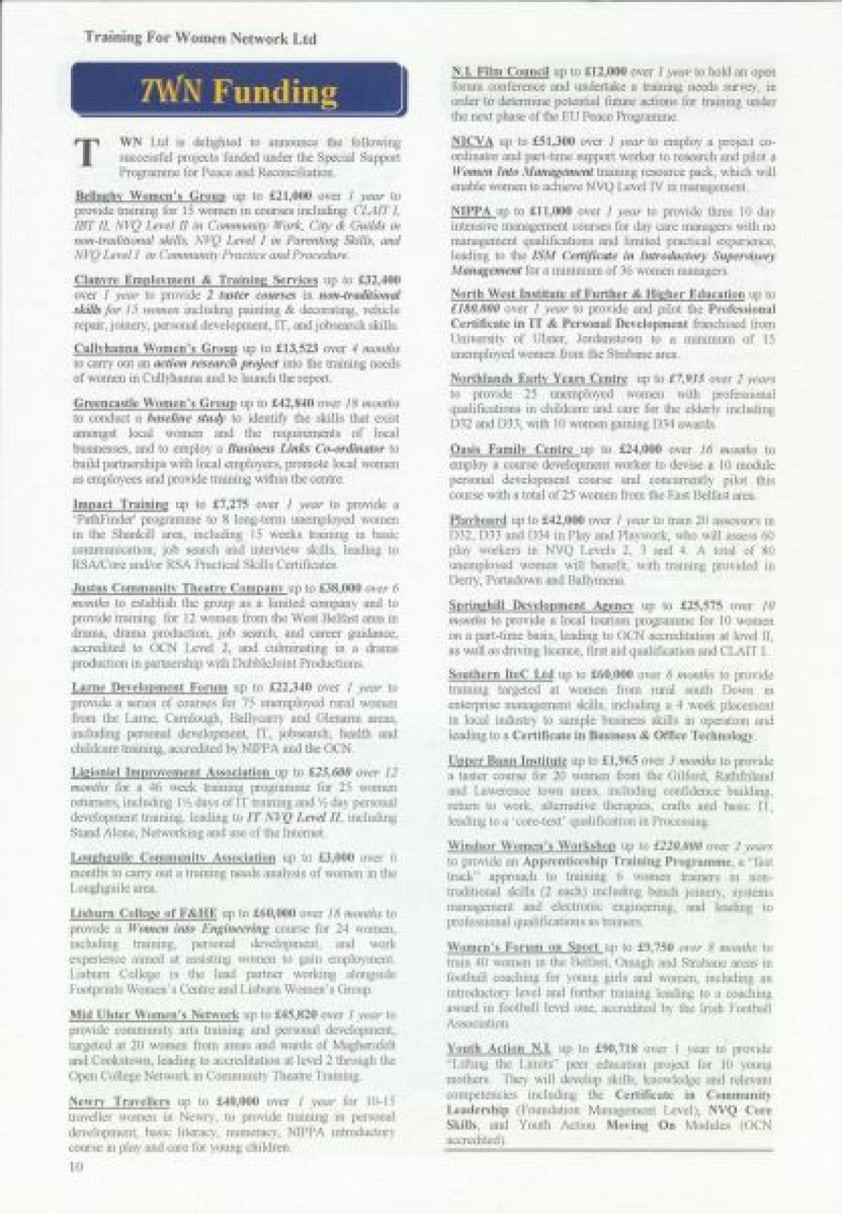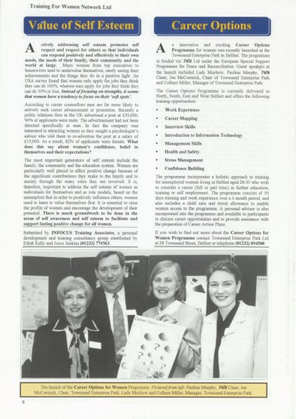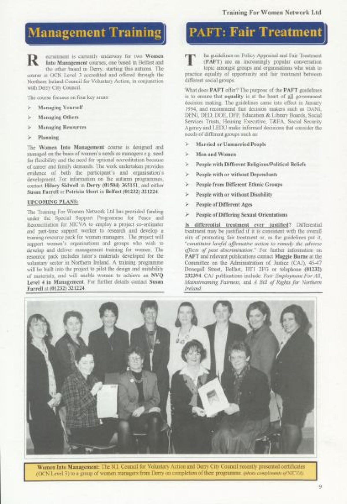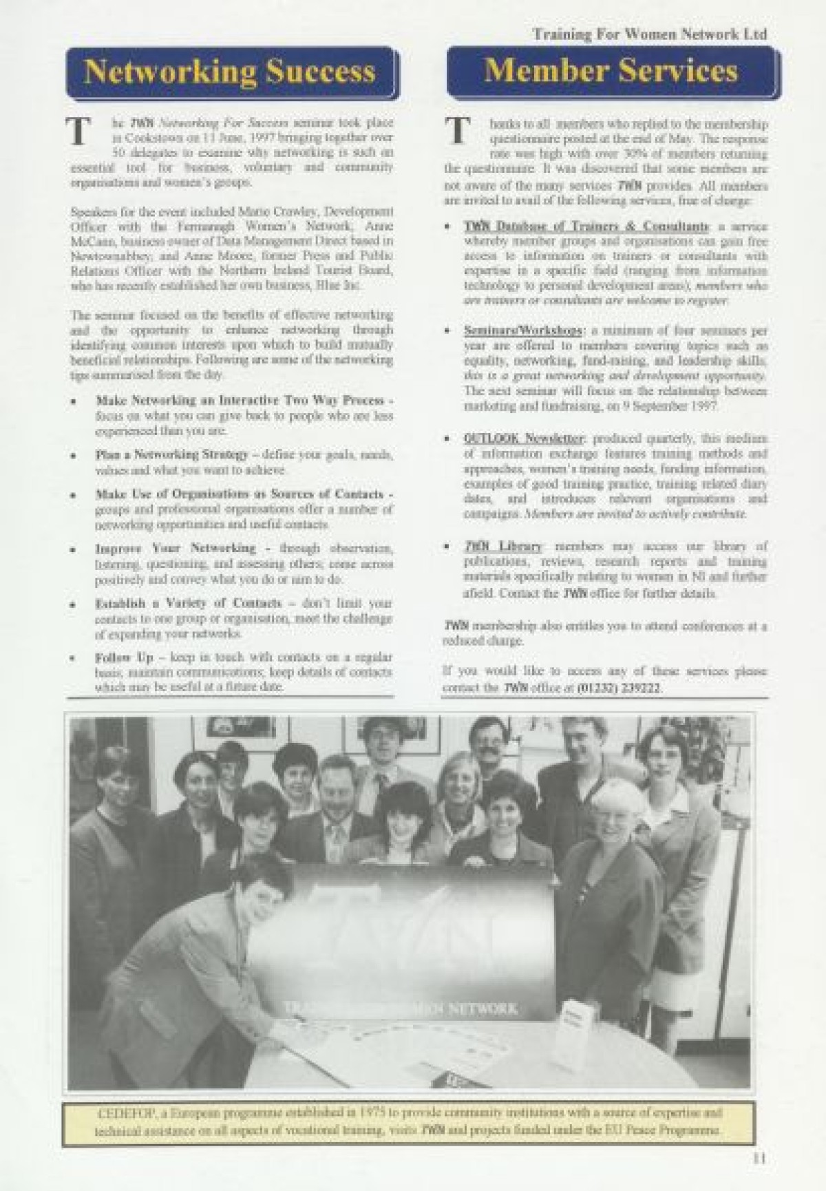 Training for Women Network Ltd. Contents include: "Women in Fiction Film" by Marilyn Hyndman; Why PR?; Cinemanagement; Research results in Craigavon; Festival News; Media Review; Theatre Training; The Right Choice; Women's News; Value of Self Esteem; Career Options for Women; Management Training; PAFT: Fair Treatment; Funding: Overview of Projects approved since Spring 1997; Networking Success; and TWN Membership Services.