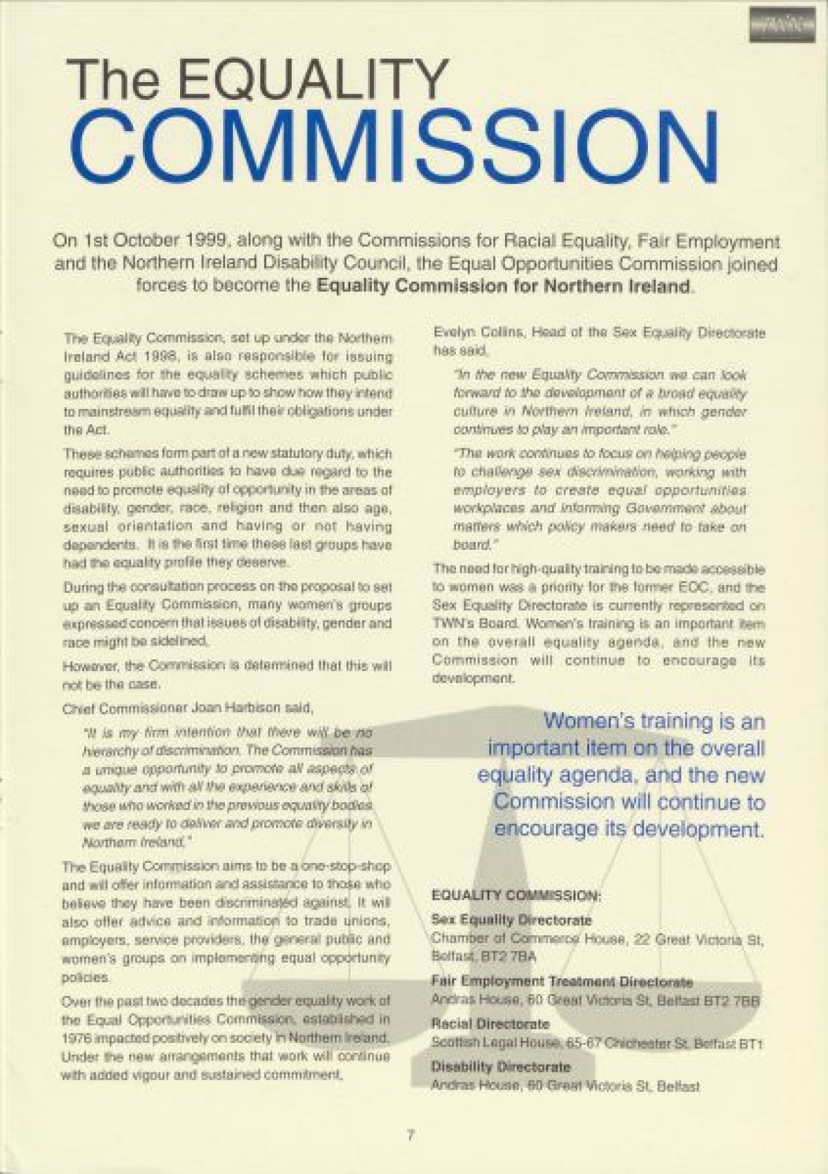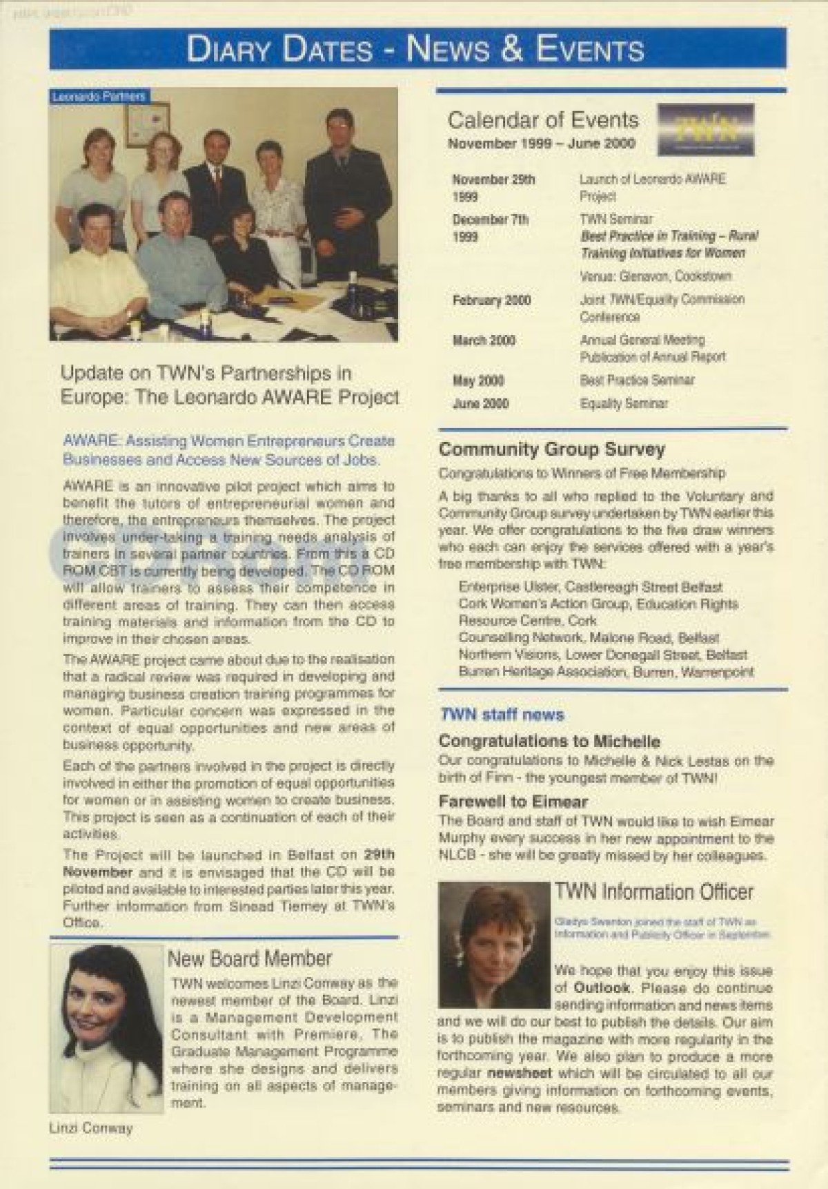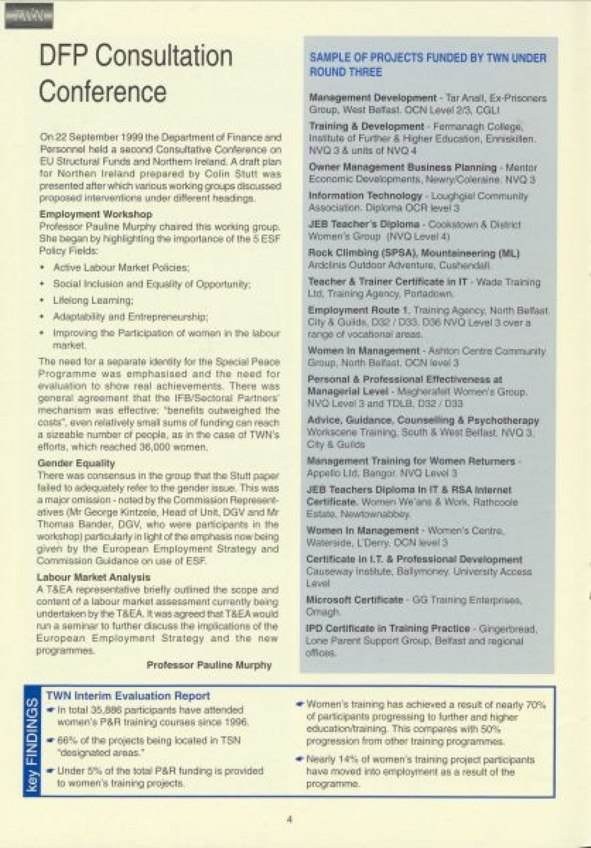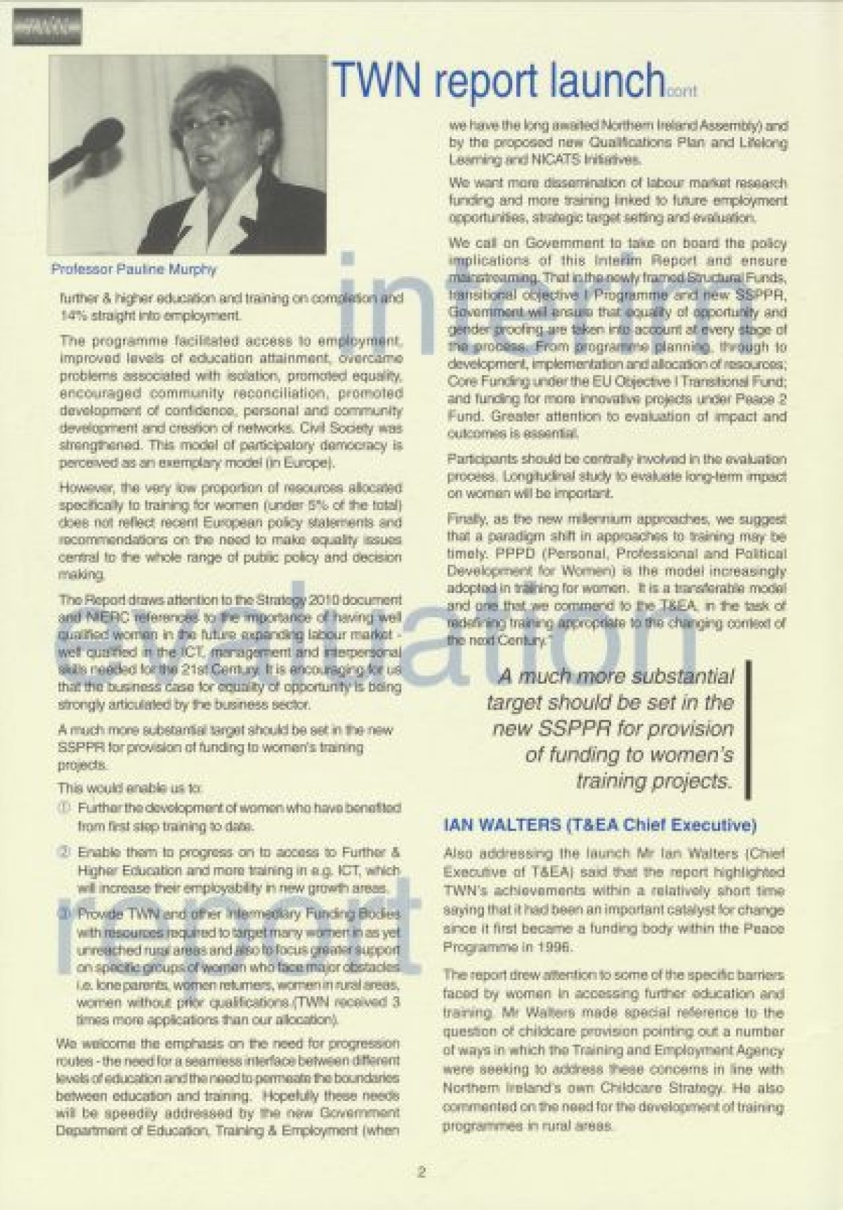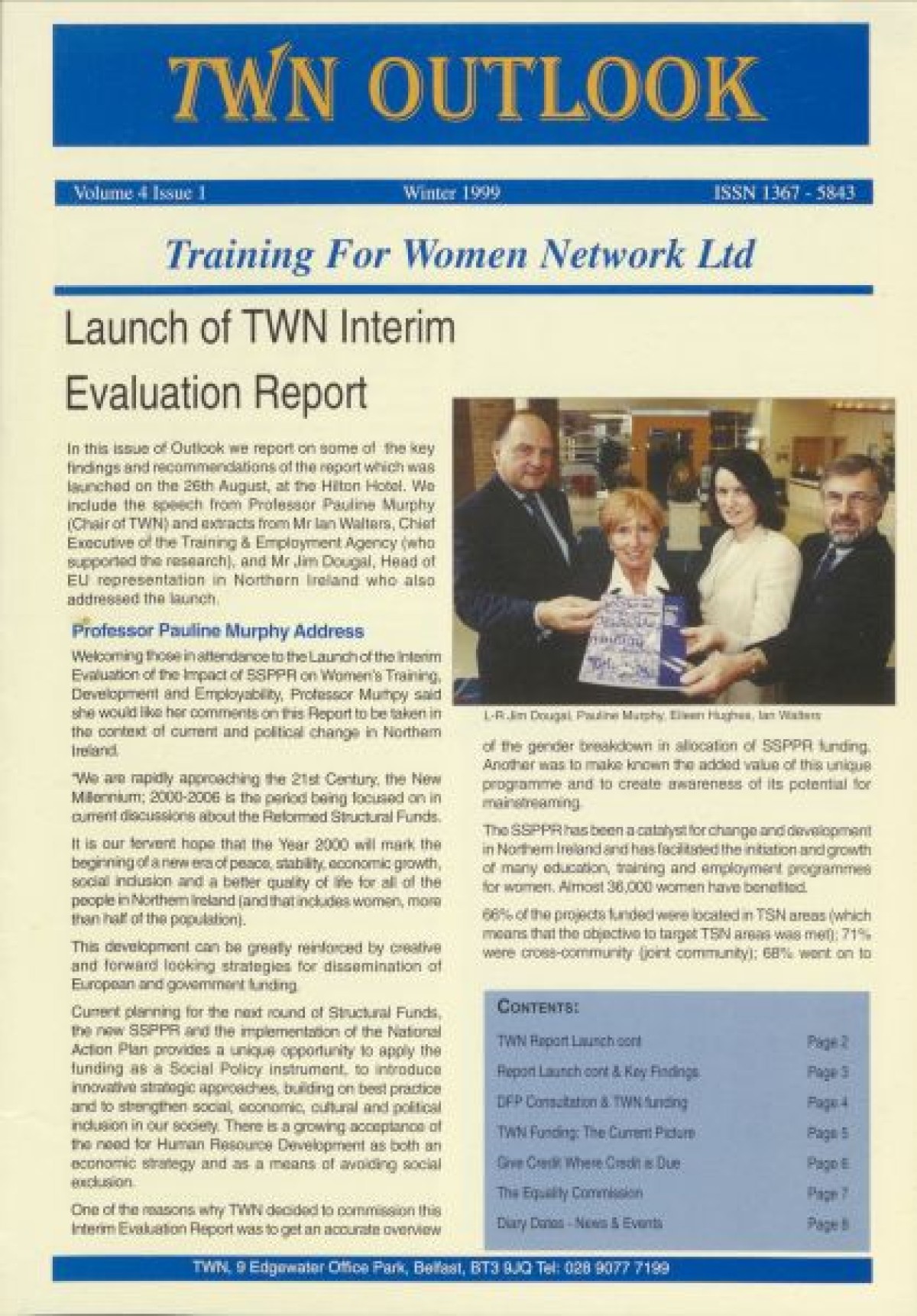 Training for Women Network Ltd. Contents include: Launch of TWN Interim Evaluation Report and Key Findings; Department of Finance and Personnel Consultation; TWN Funding: the current picture; Give Credit Where Credit is Due (Northern Ireland credit framework); and The Equality Commission.