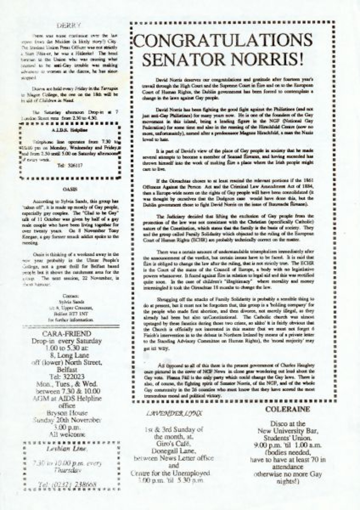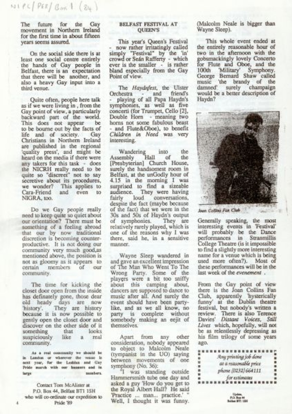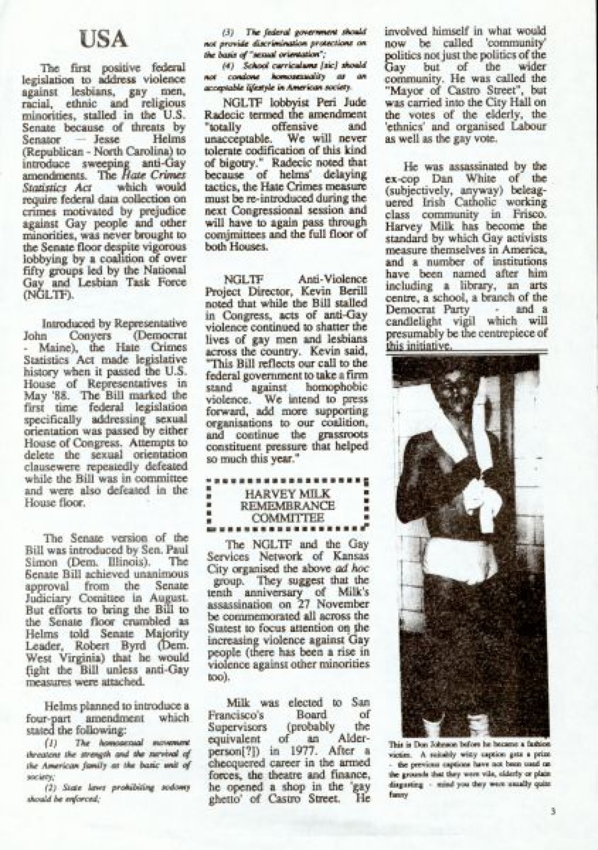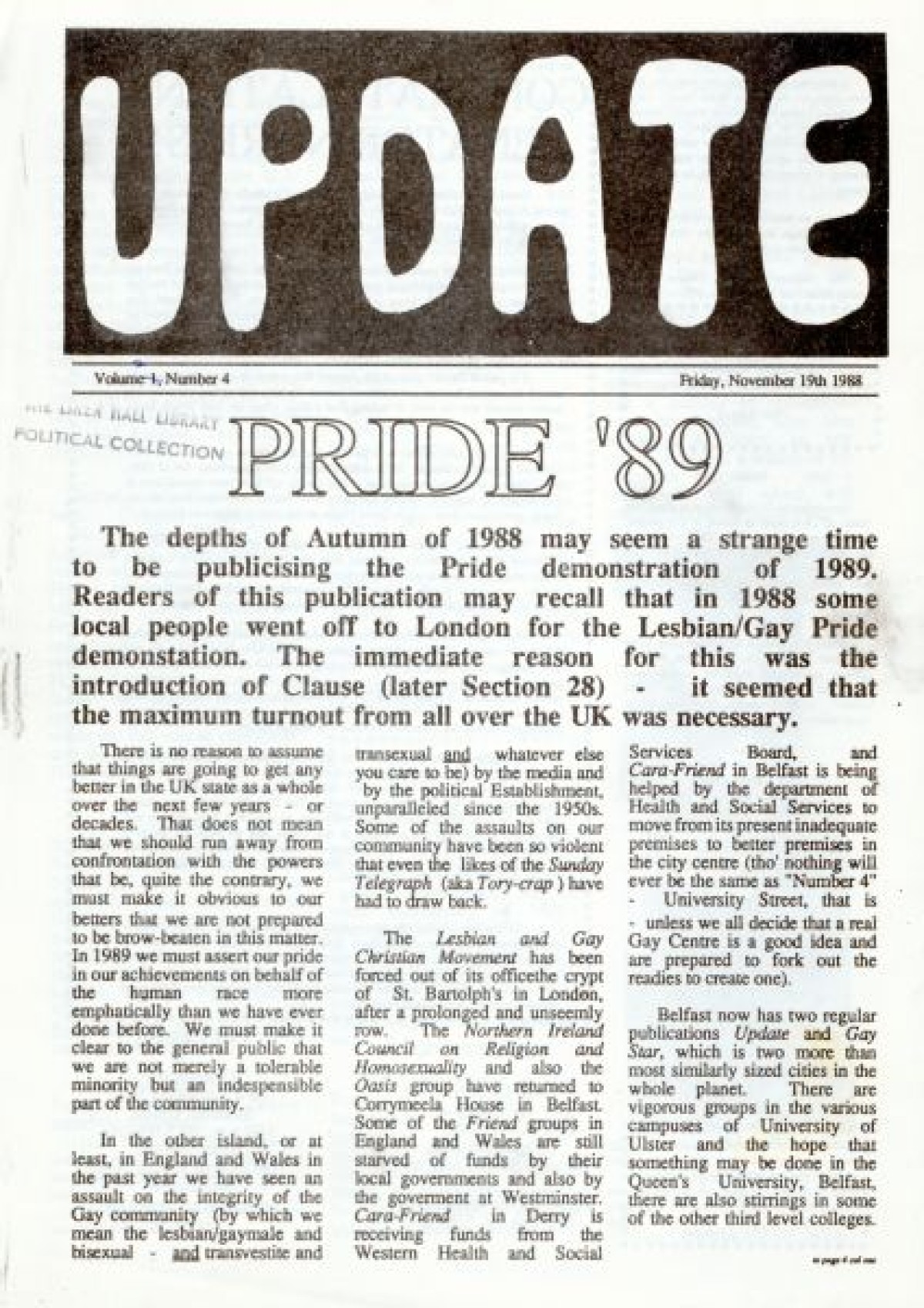 Update Volume 1, Number 4, 19th November 1988. Contains a special feature promoting Pride '89, a letter about a legal case to decriminalise homosexuality in Ireland, and an article about new federal legislation to address violence against lesbians, gay men, racial, ethnic and religious minorities in the USA.